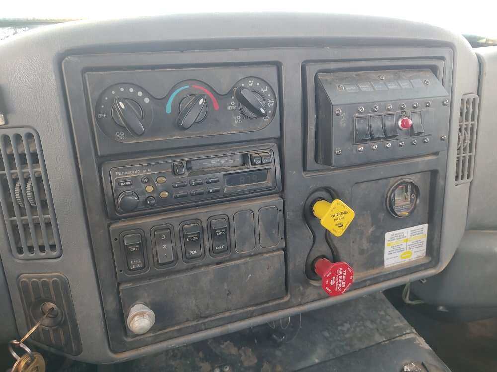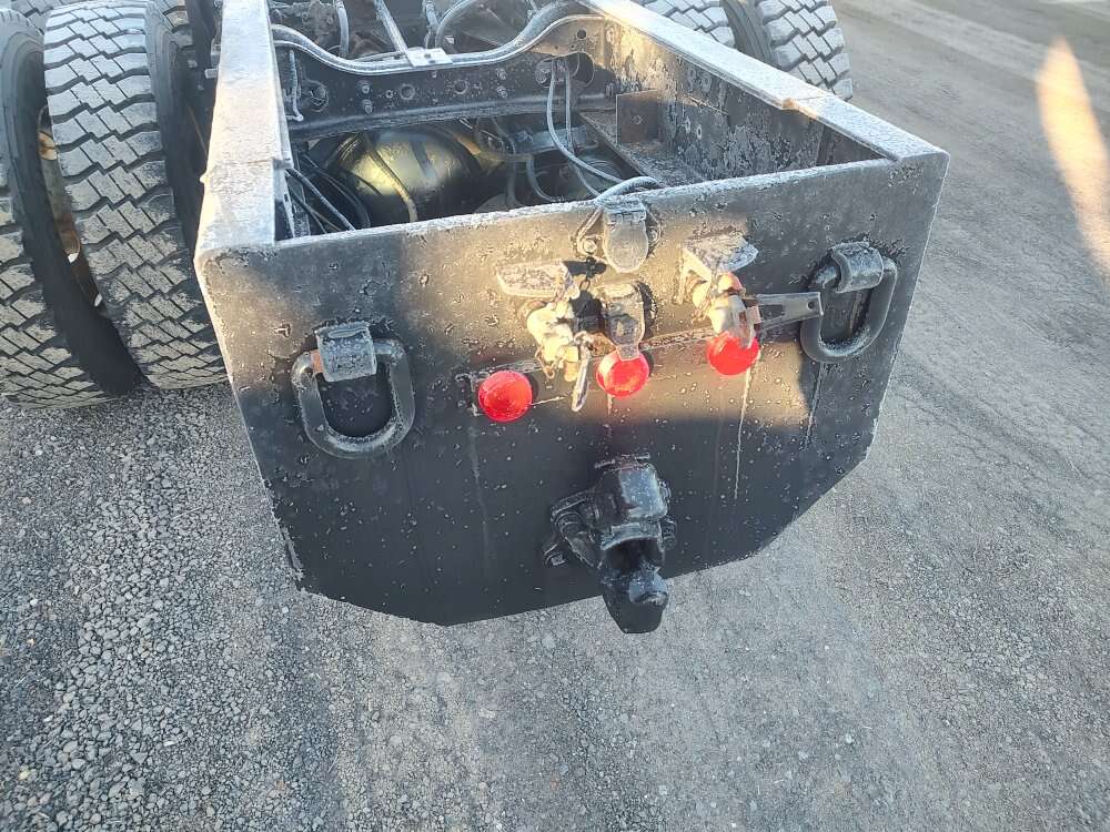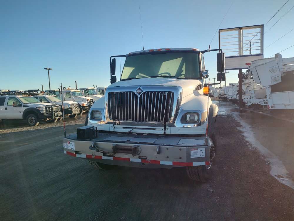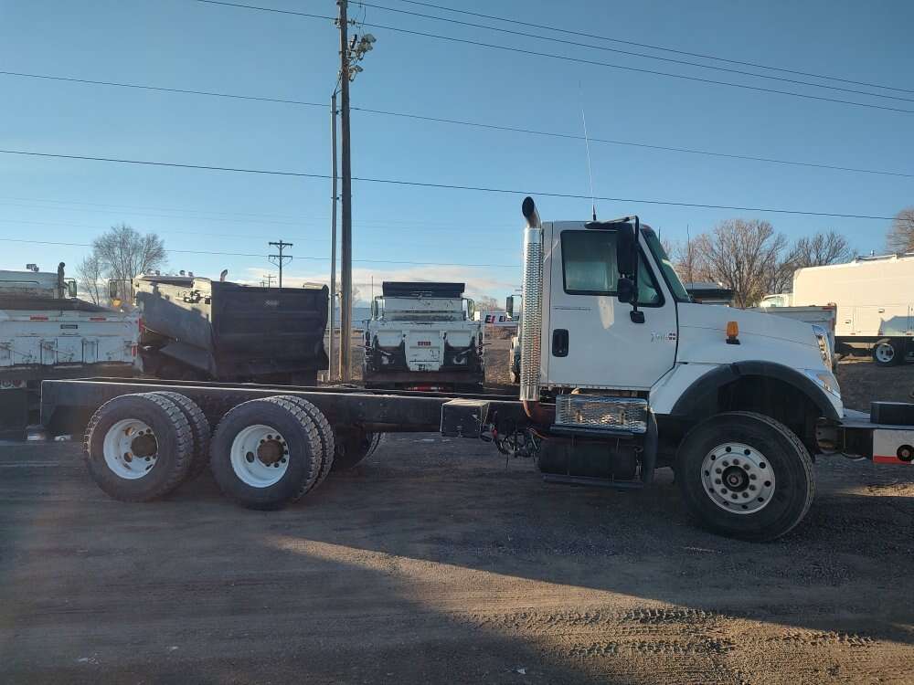 2003 International 7600 cab and chassis, 370 horsepower ISM Cummins diesel engine, 13 speed manual transmission, 116,000 miles, 9,600 hours, engine brake, differential lock, 56,000 GVW, Hendrickson pad suspension, air to the rear, pintle hitch, PTO, 120" cab to trunnion, 225" total frame, good tires, former municipal truck 208-734-3434