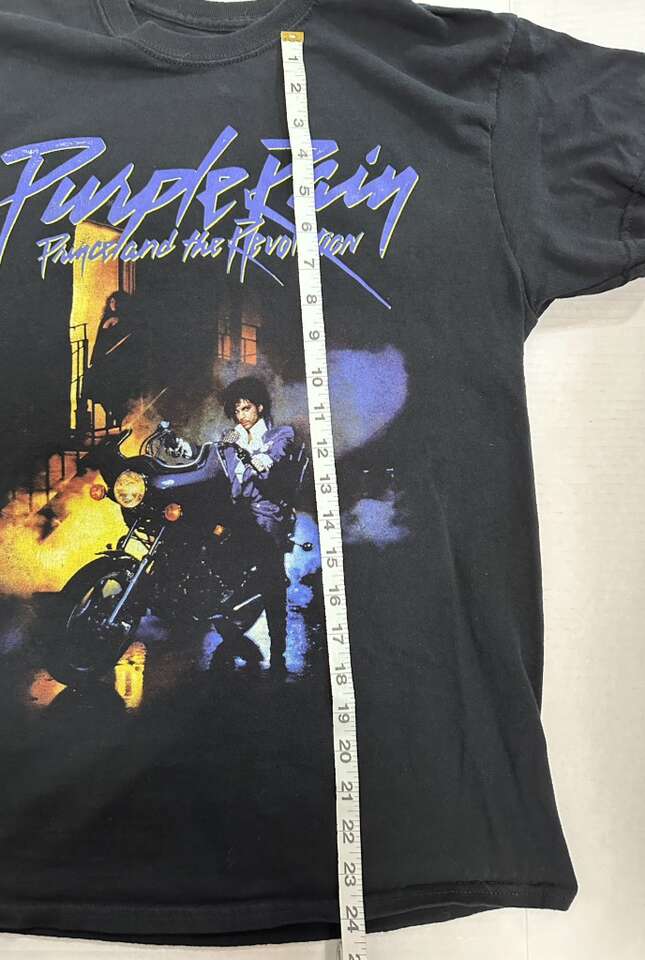 This medium-sized Prince & The Revolution Purple Rain T-Shirt features a solid black color with a crew neck and short sleeves. Made of cotton, this regular fit t-shirt is themed around music, specifically associated with the iconic artist Prince. The graphic on the shirt references the album Purple Rain by Prince & The Revolution, making it a must-have for fans of the legendary musician.