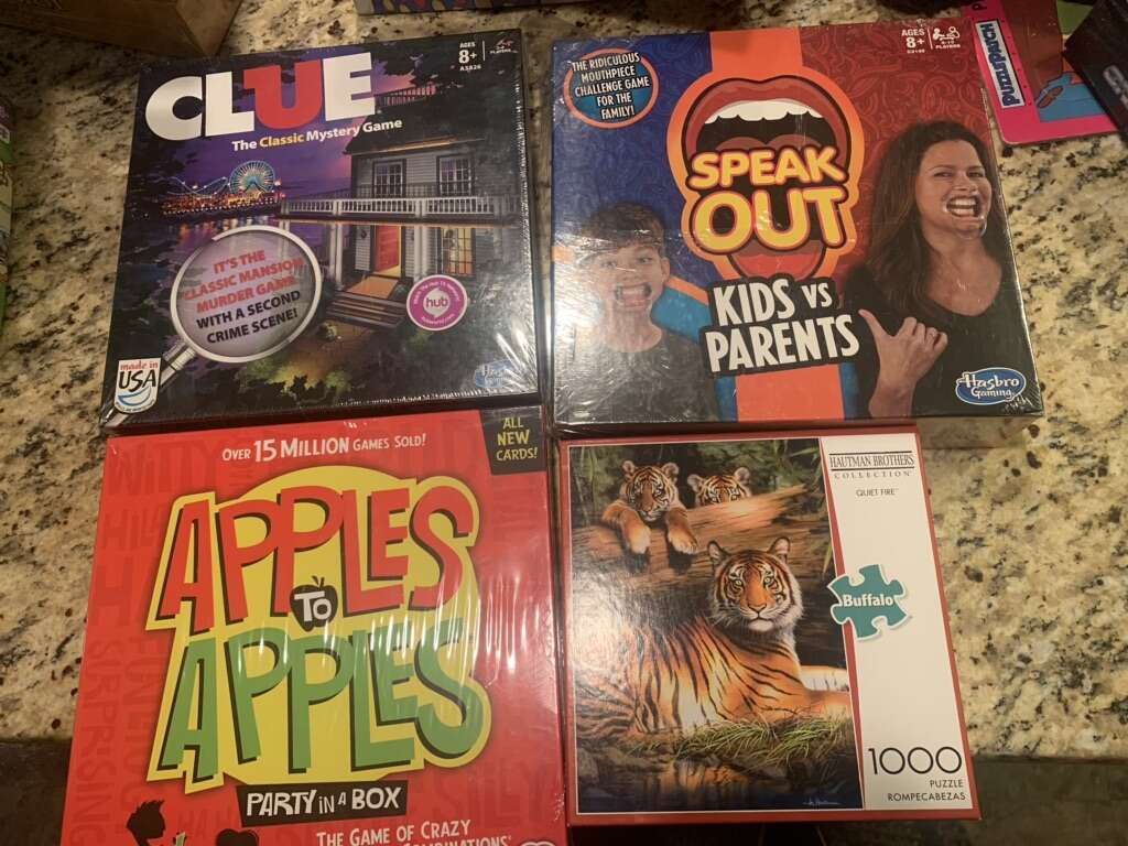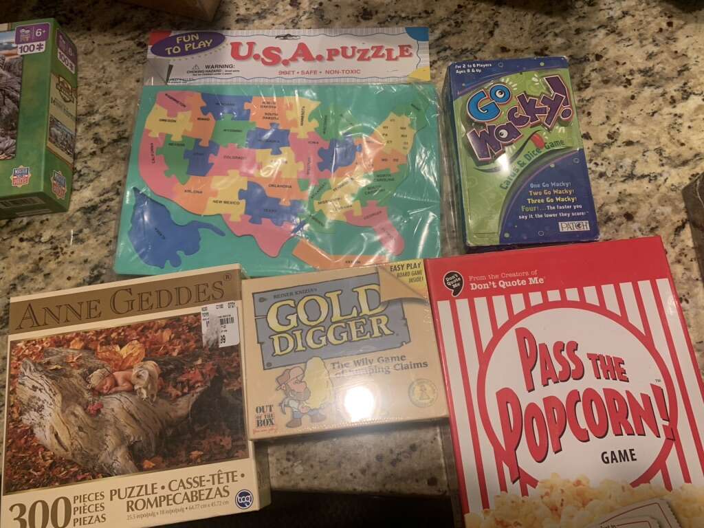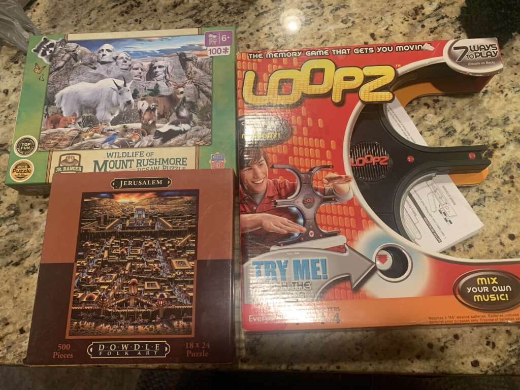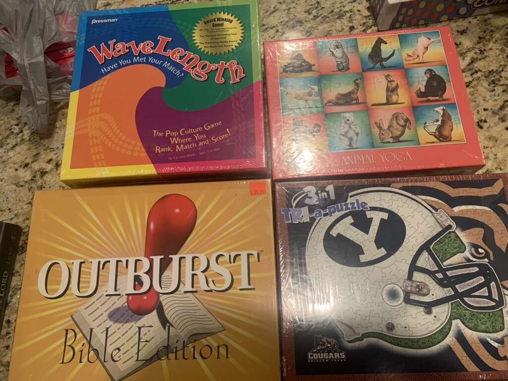 Apples to Apples party in a box $15.00 Anne Geddes Fall Baby Puzzle 5.00 (300 piece) Animal yoga puzzle $5.00 (500 piece) Byu puzzle $10.00 Clock $1.00 used Clue $8.00 Dos (used) 3.00 Go wacky $5.00 Gold digger $10.00 Hatchimals puzzle $1.00 Jerusalem dowdle puzzle (500 piece) $15.00 Loopz $15.00 Outburst bible edition $15.00 Pass the popcorn $10.00 Qwixx 5.00 Rook $2.00 each (used) Scrabble slam $4.00 (used) Speak out $10.00 String activities $5.00 (used) Tiger puzzle (1,000 piece) $10.00 USA puzzle $1.00 Wavelength game $30.00 World map jumbo (used) had all pieces $8.00 Wildlife of Mt. Rushmore $8.00 (100 piece) Wolf puzzle $1.00 (used)