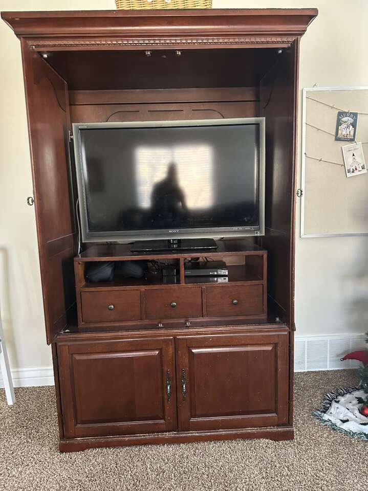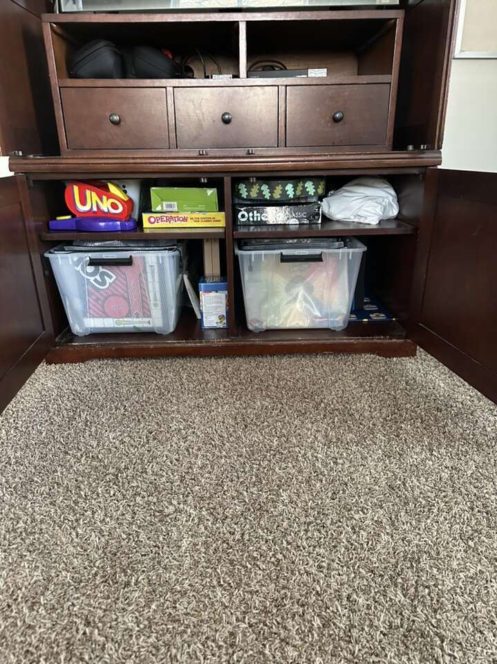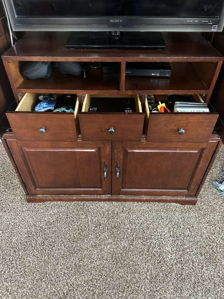 3 drawers, 2 large cupboard underneath. The storage is deep, so it fits quite a bit! There is some wear and tear on this piece, but it still functions great. We are just wanting a different piece for this space.