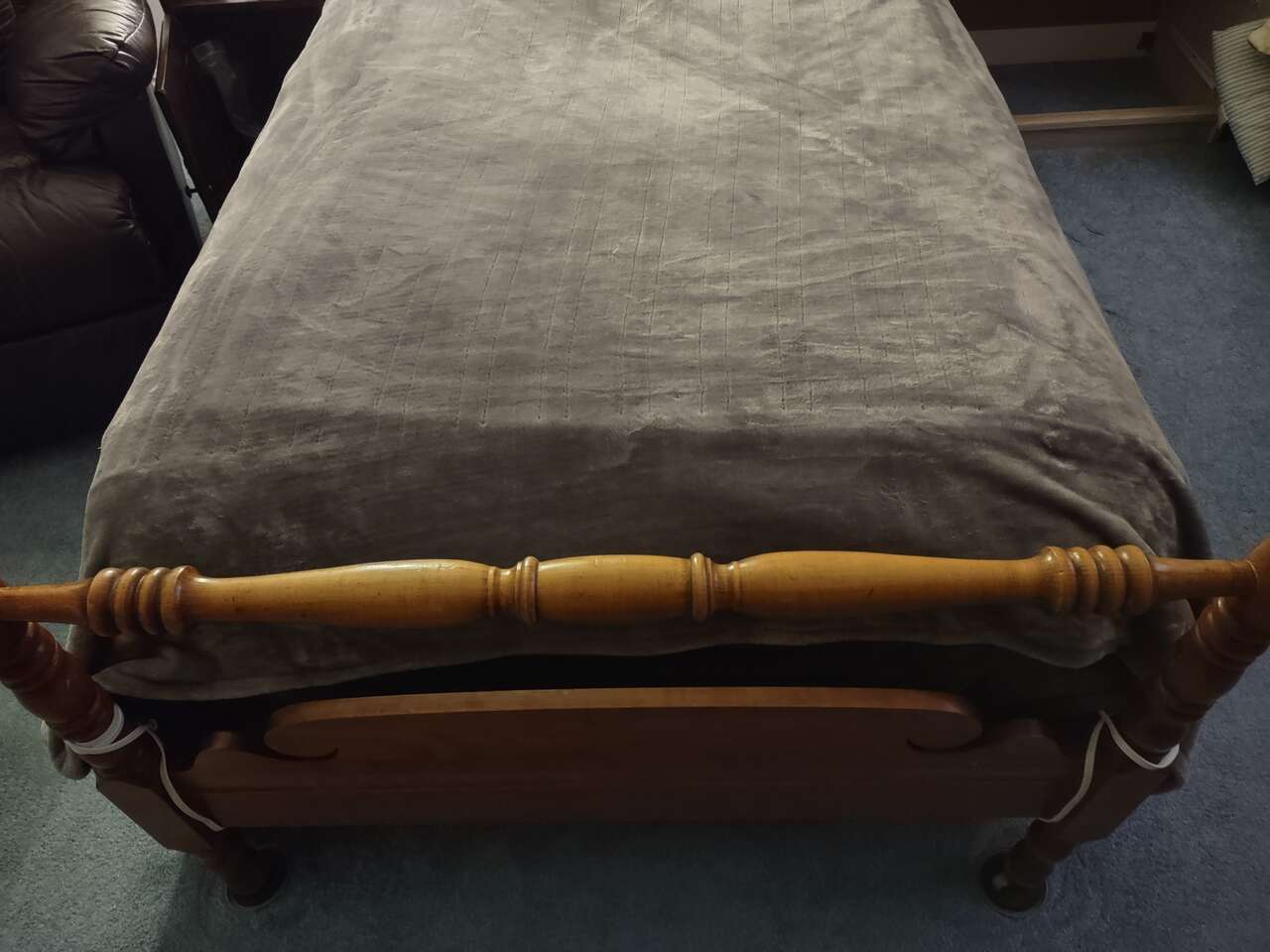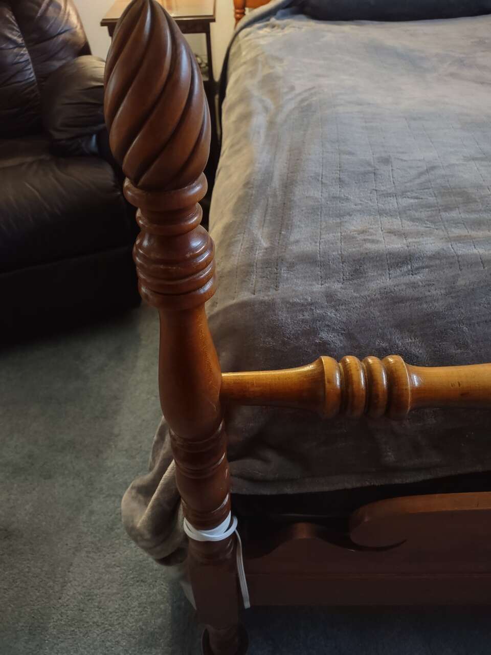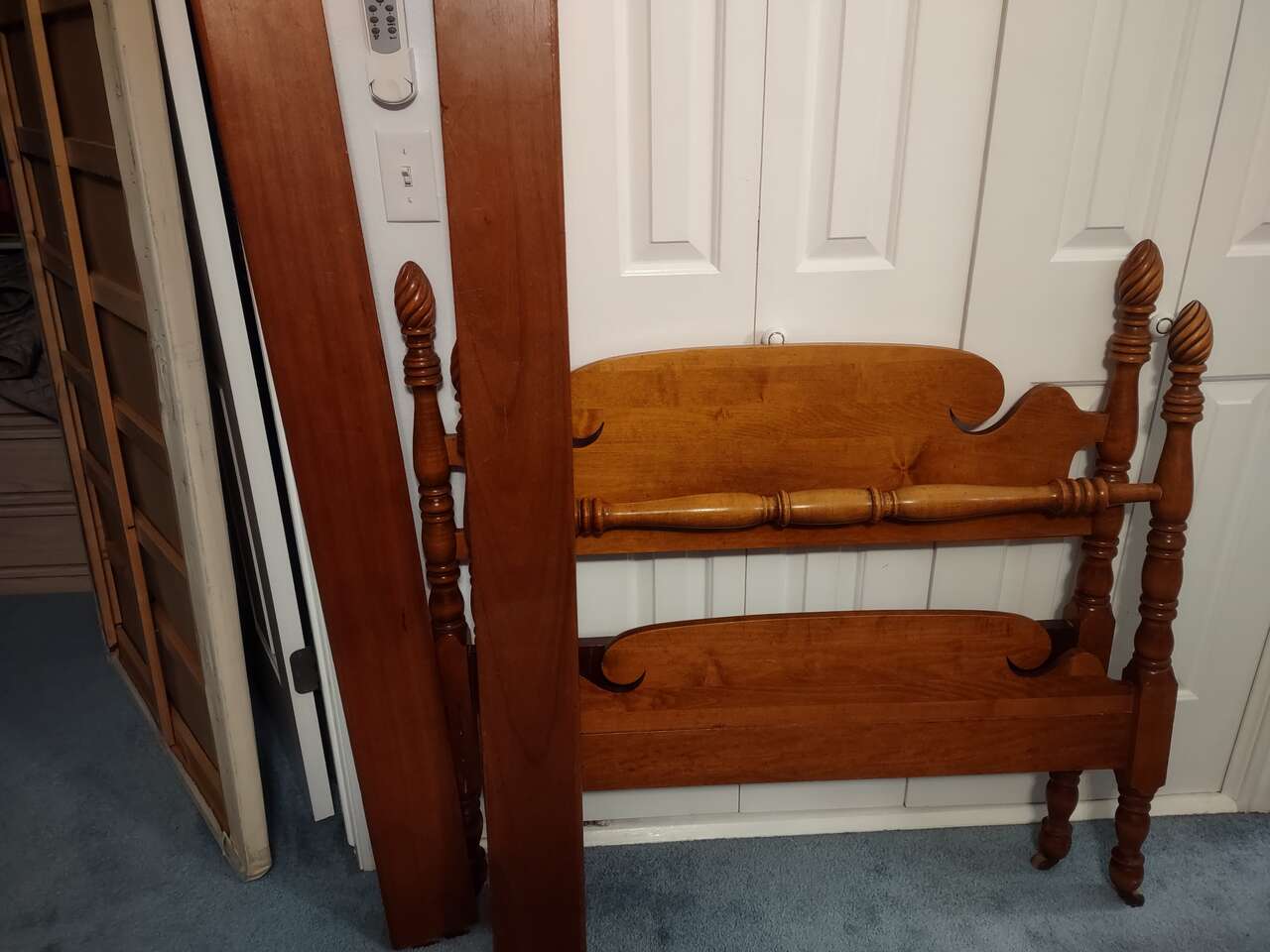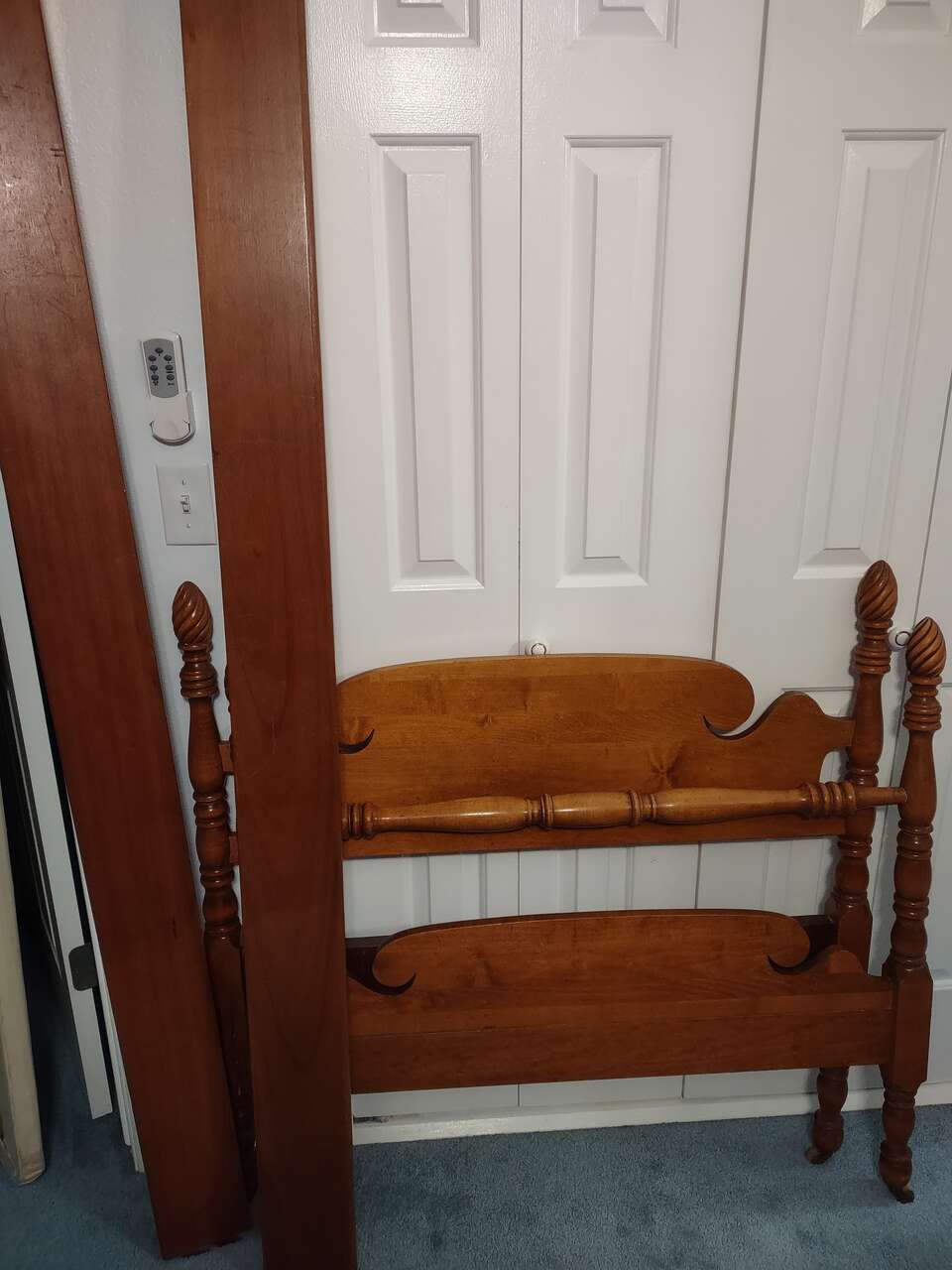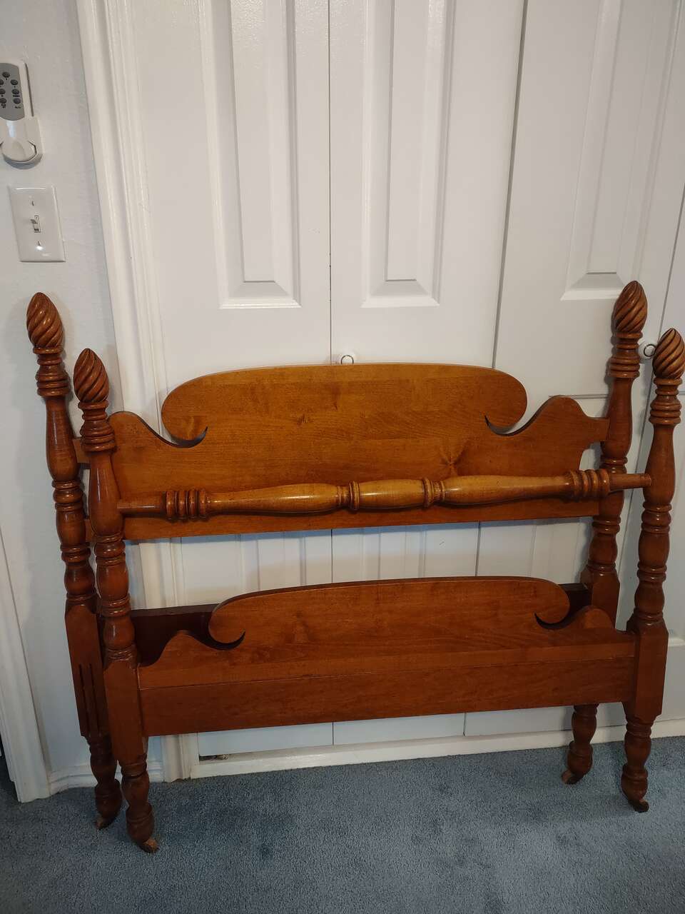 VenmoVINTAGE 1940'S SOLID MAPLE WOOD 4-POSTER TWIN BED FRAME. HEADBOARD, FOOTBOARD, SIDE RAILS WITH SPINDLE CARVED POST TOPS. On Casters. Only one owner. Heirloom must part with. In excellent condition. See all 7 photos. Comparable beds on ebay and etsy running $1,400 to $1,900. Only $295 Cash/Venmo. In Sandy. 801-201-5350
