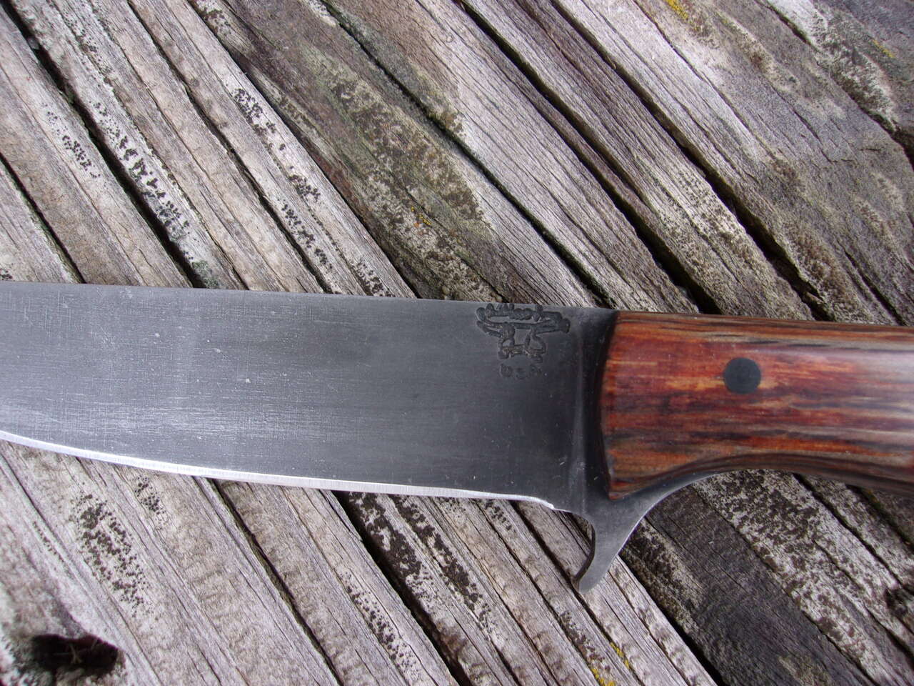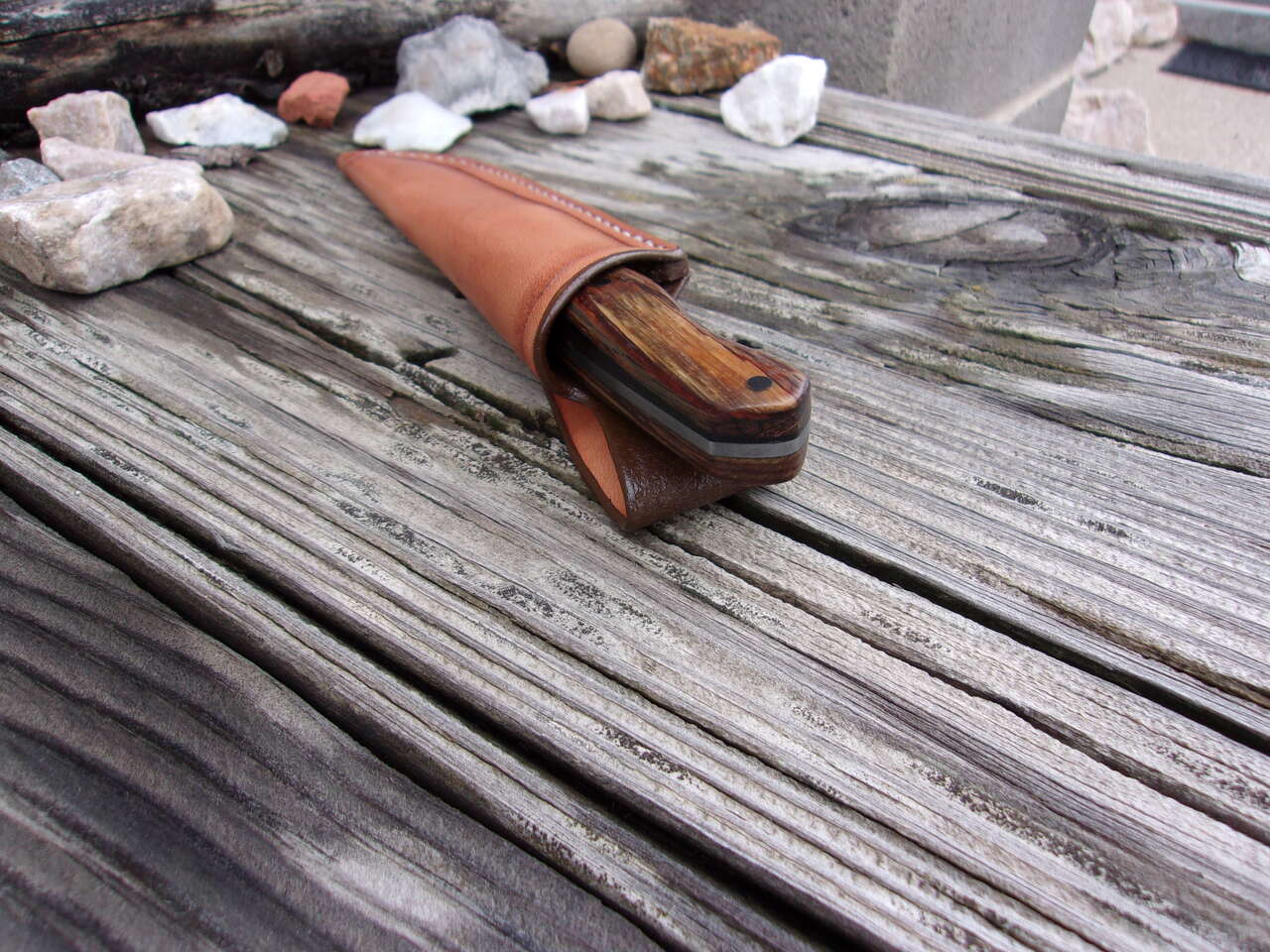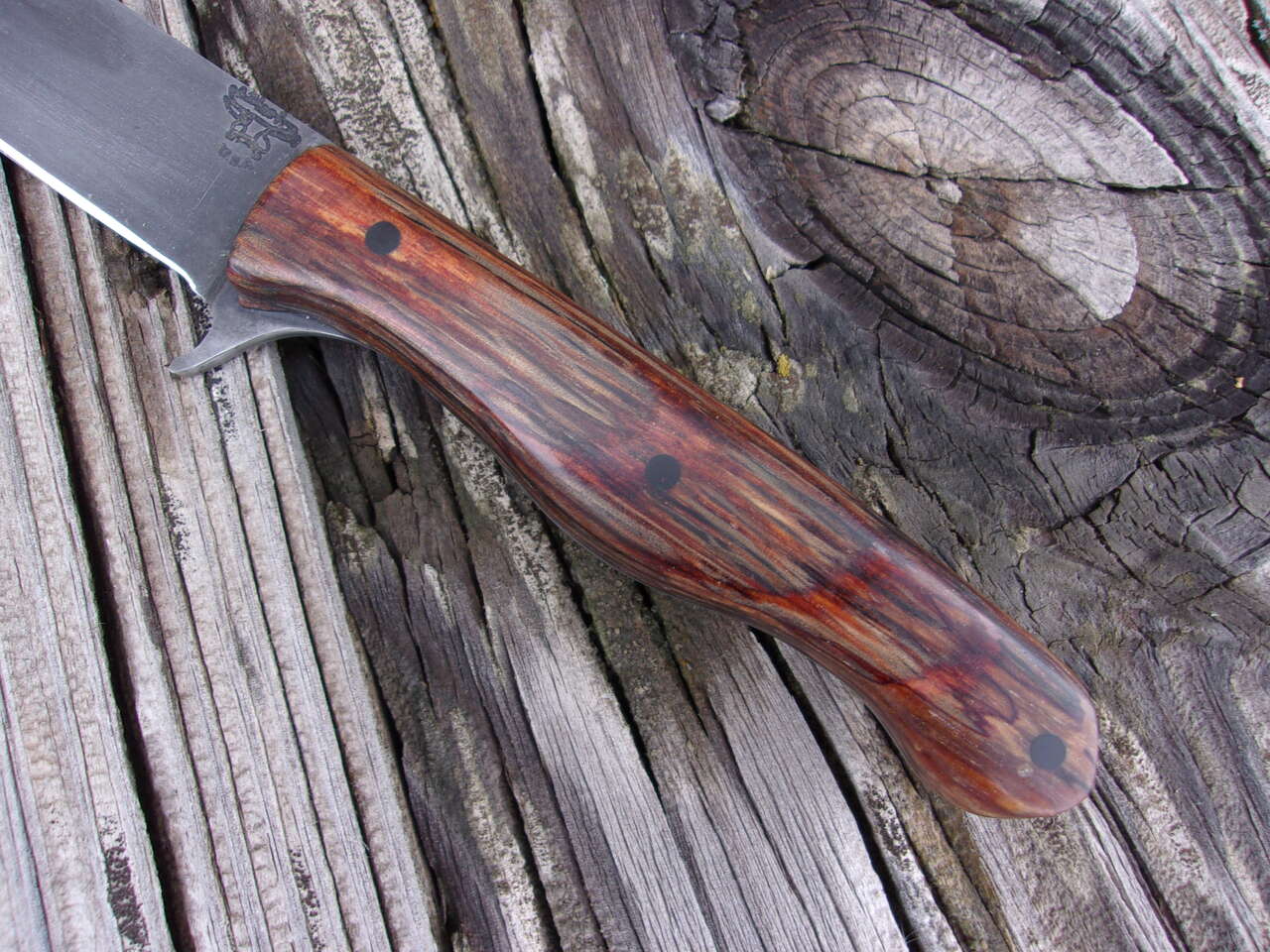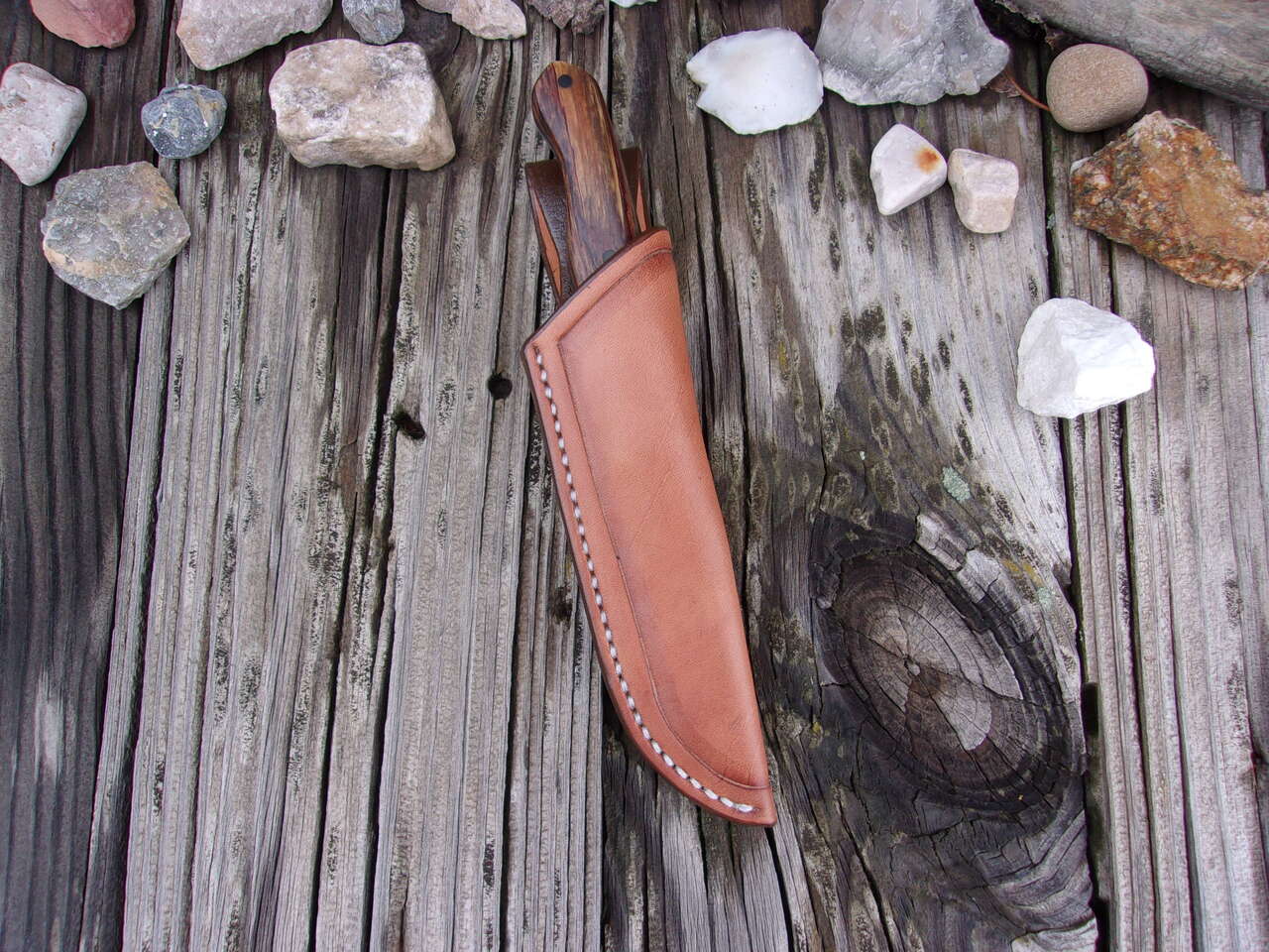 This knife is new having only being handled for the build of the sheath and the photos for the ad. This piece has a nice balance along with a 4.5” hybrid wild oak handle that will accommodate most any size hand that feels comfortable to hold and nimble to handle as well as having a very sharp full tang blade.