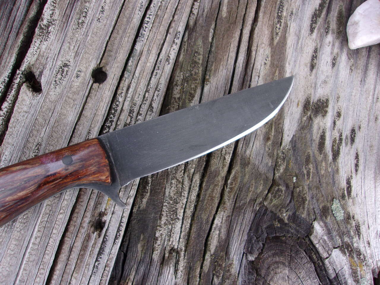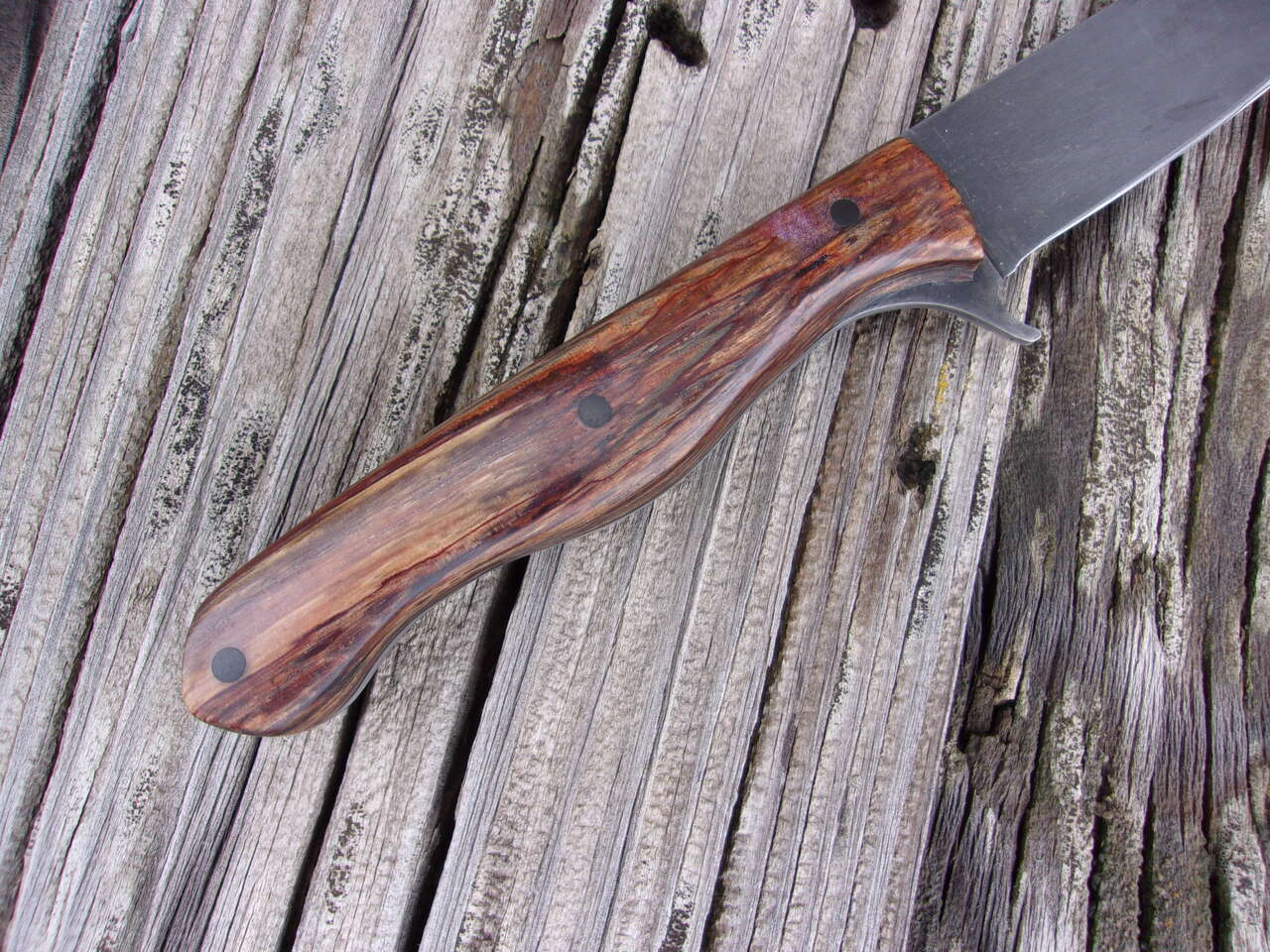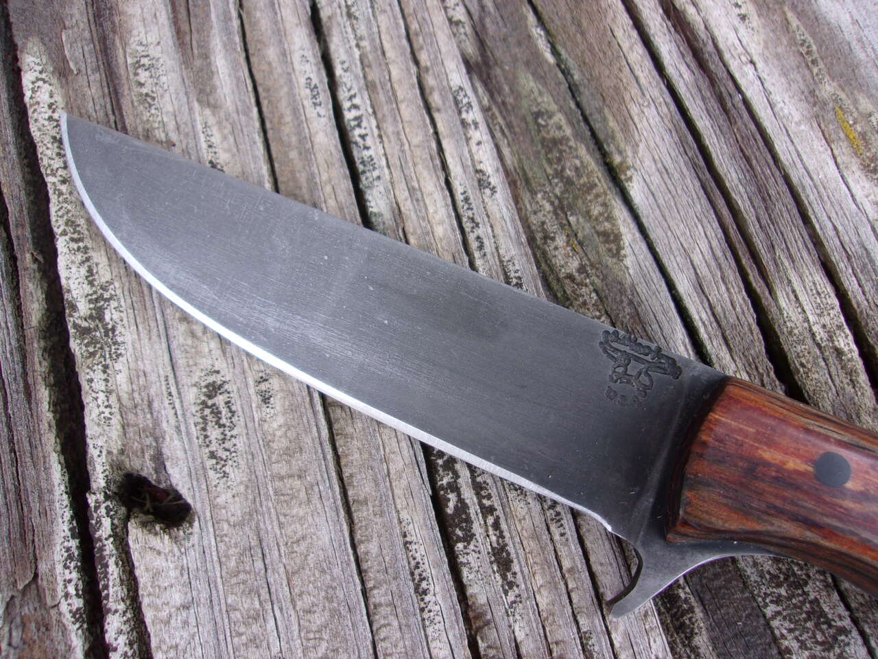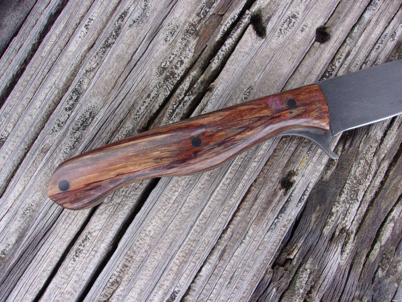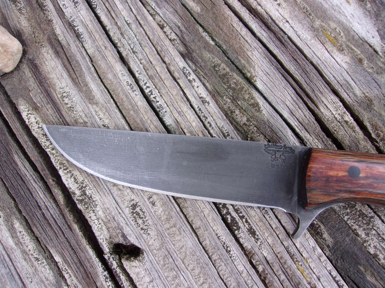 This knife is new having only being handled for the build of the sheath and the photos for the ad. This piece has a nice balance along with a 4.5” hybrid wild oak handle that will accommodate most any size hand that feels comfortable to hold and nimble to handle as well as having a very sharp full tang blade.