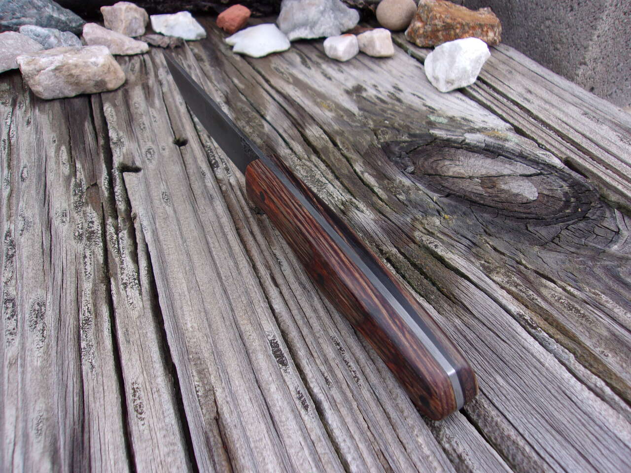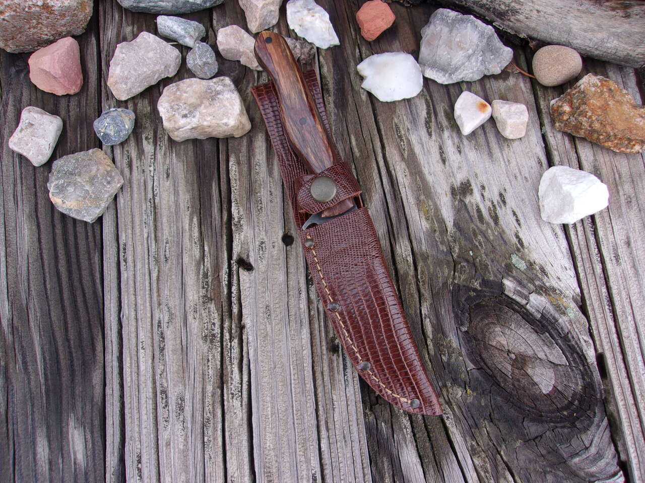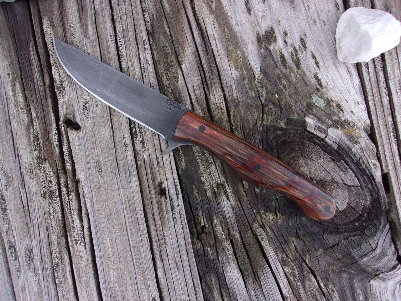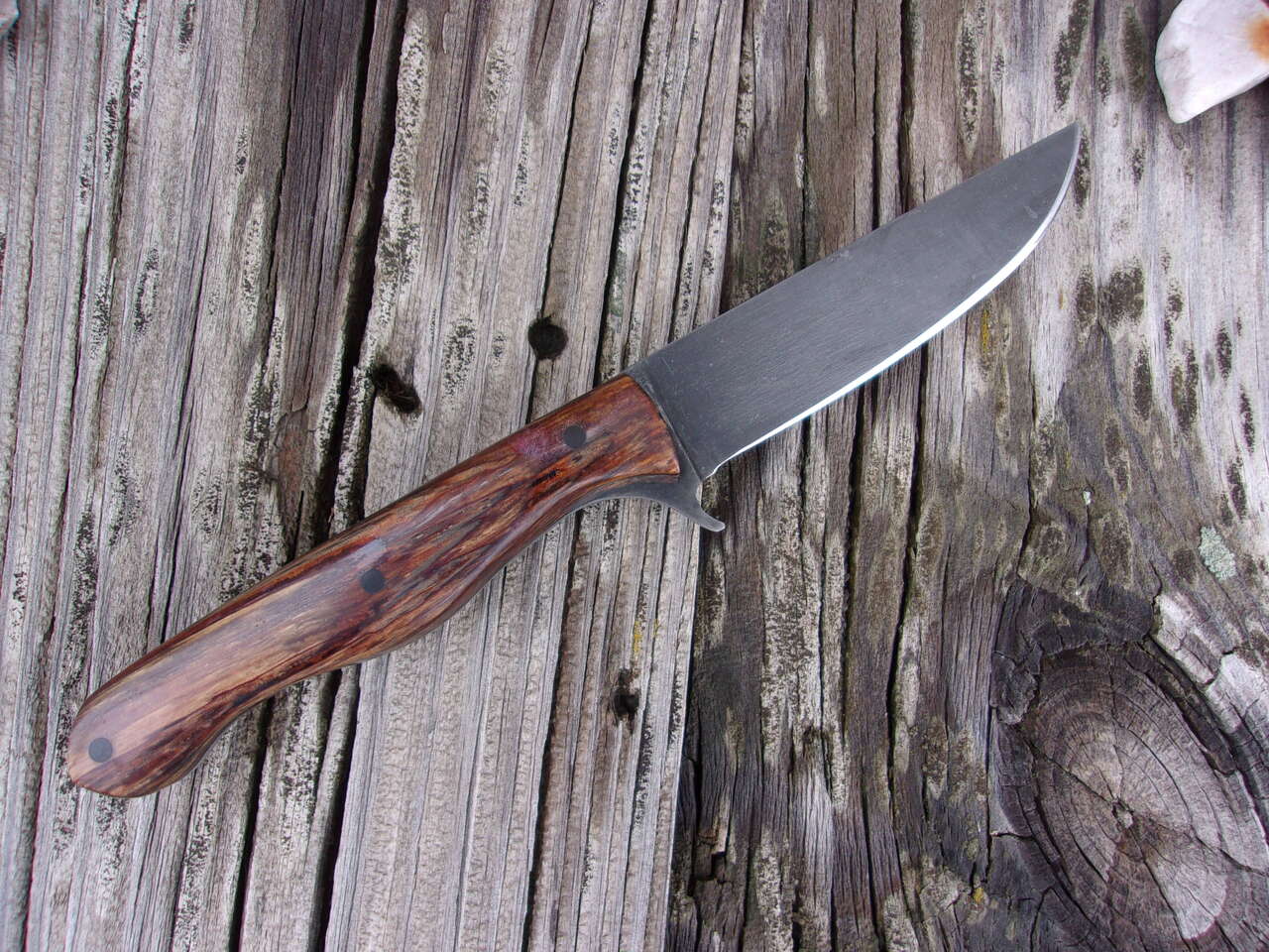 This knife is new having only being handled for the build of the sheath and the photos for the ad. This piece has a nice balance along with a 4.5” hybrid wild oak handle that will accommodate most any size hand that feels comfortable to hold and nimble to handle as well as having a very sharp full tang blade.