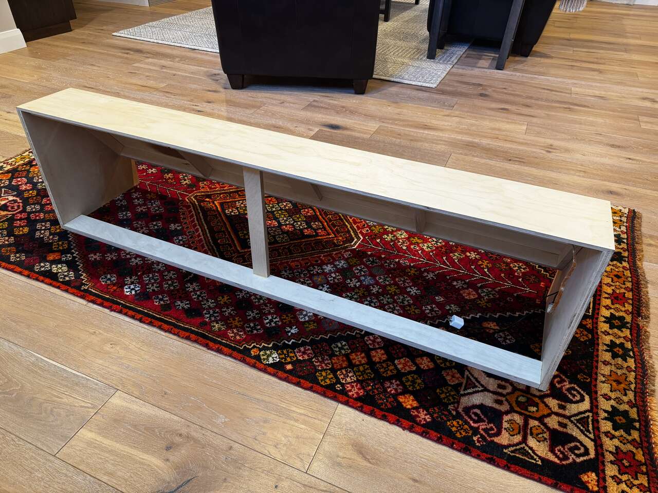 ApplePaySolid built display stand. Made from 3/4" baltic birch and is unfinished for _your_preferred finishing needs. Used to organize desktop synthesizers, but could be used for just about anything. Has LED track built for ambient lighting, but needs new LED light strip. 17.5" high x 15" deep x 64" long