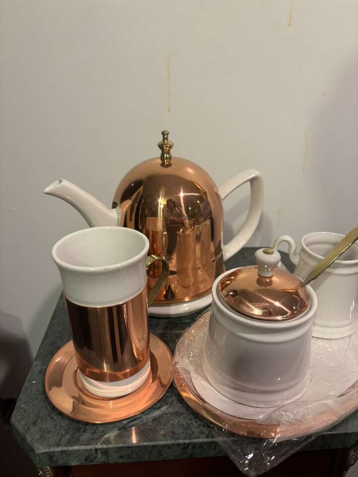 PayPalCopper kettle with cozy. Has sugar and creamer dishes including a spoon. It also has four cups with copper coasters.New in boxes. Never used.