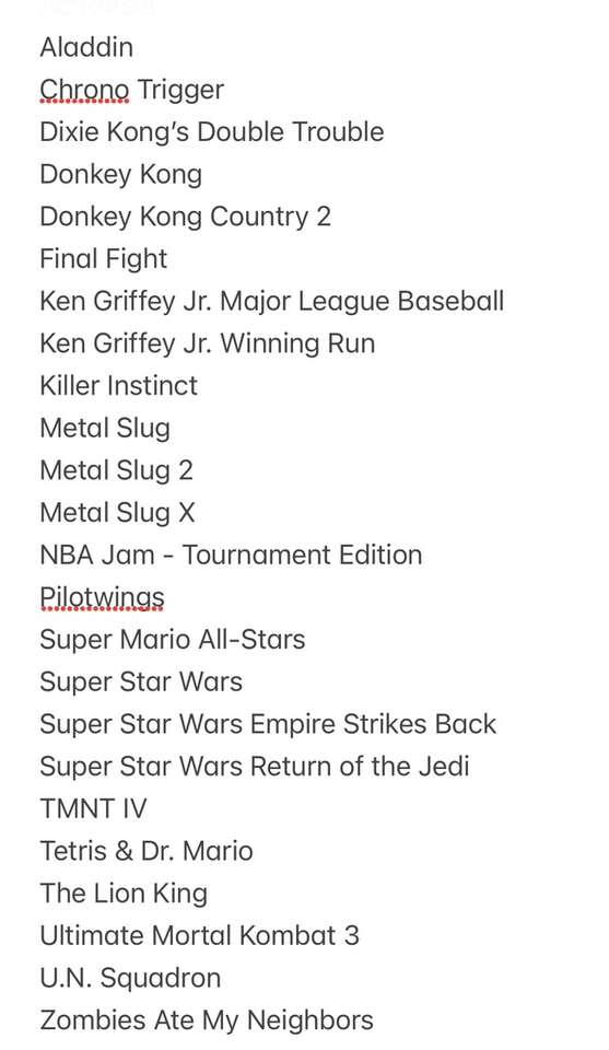 ActRaiser Aladdin Chrono Trigger Dixie Kong’s Double Trouble Donkey Kong Donkey Kong Country 2 Final Fight Ken Griffey Jr. Major League Baseball Ken Griffey Jr. Winning Run Killer Instinct Metal Slug Metal Slug 2 Metal Slug X NBA Jam - Tournament Edition Pilotwings Super Mario All-Stars Super Star Wars Super Star Wars Empire Strikes Back Super Star Wars Return of the Jedi TMNT IV Tetris & Dr. Mario The Lion King Ultimate Mortal Kombat 3 U.N. Squadron Zombies Ate My Neighbors