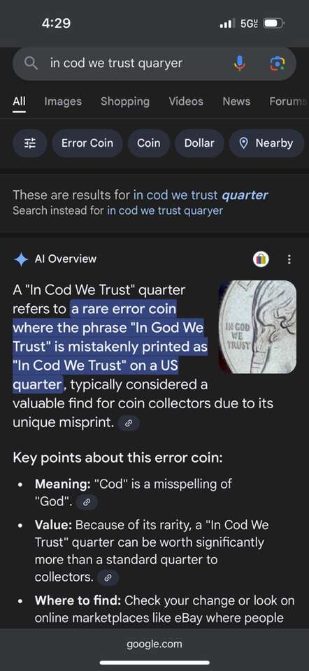 VenmoJovita Idar 2023 mint error quarter “ in COD we trust” These error coins are selling between $400 and $3000 dollars on the market - you can check them out online I am asking $900 obo my Quarter is in near mint condition