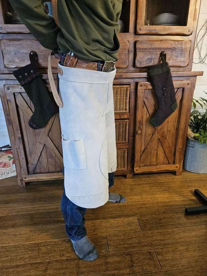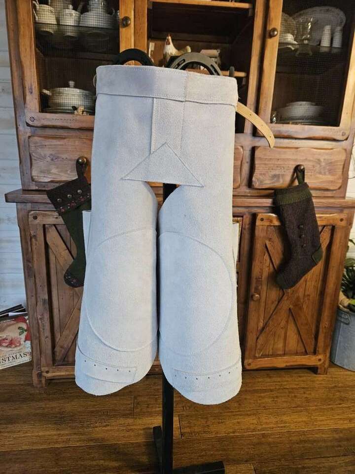 Brand new and made by PK Leather. Mule hide shoeing chaps. They have a knife/hoof pick pockets on each side and nail holders.