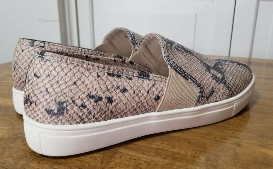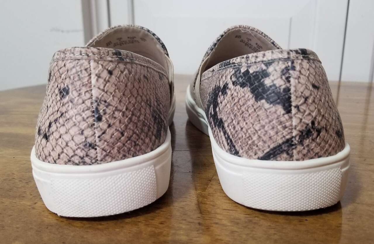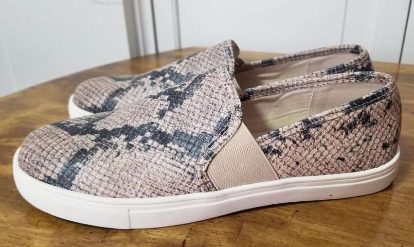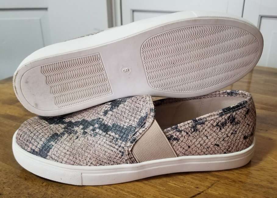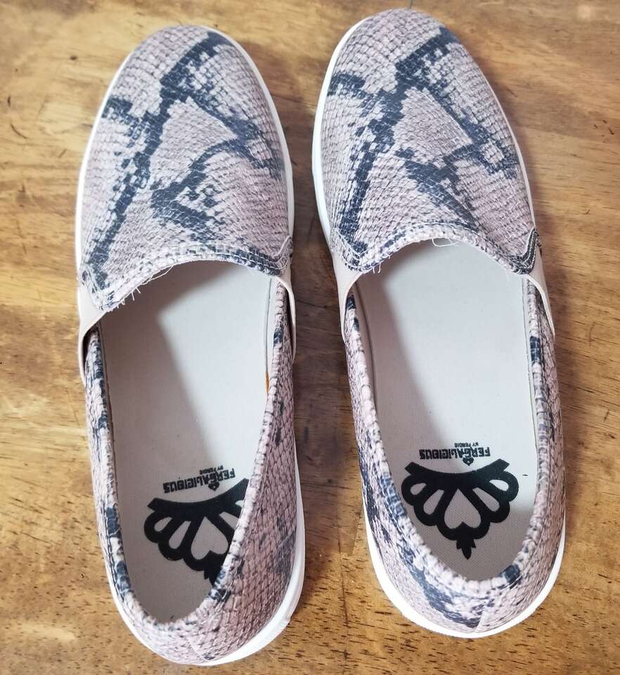 CashAppStep into effortless style and comfort with these Fergalicious slip-ons, a perfect addition to your casual wardrobe. The beige snakeskin print adds a touch of exotic flair, while the low-top design and flat heel ensure all-day ease. With a size 8 US, these shoes are tailored for a nice and comfortable fit. . . Wore these for about a week and were a tad too small. Still in excellent condition. Comes from a smoke/pet free environment. Please see photos for closer details, and thanks for looking!
