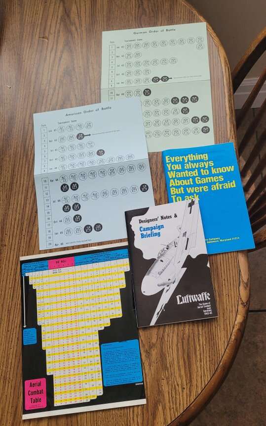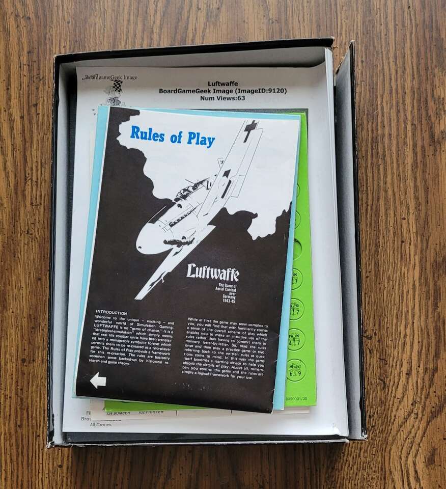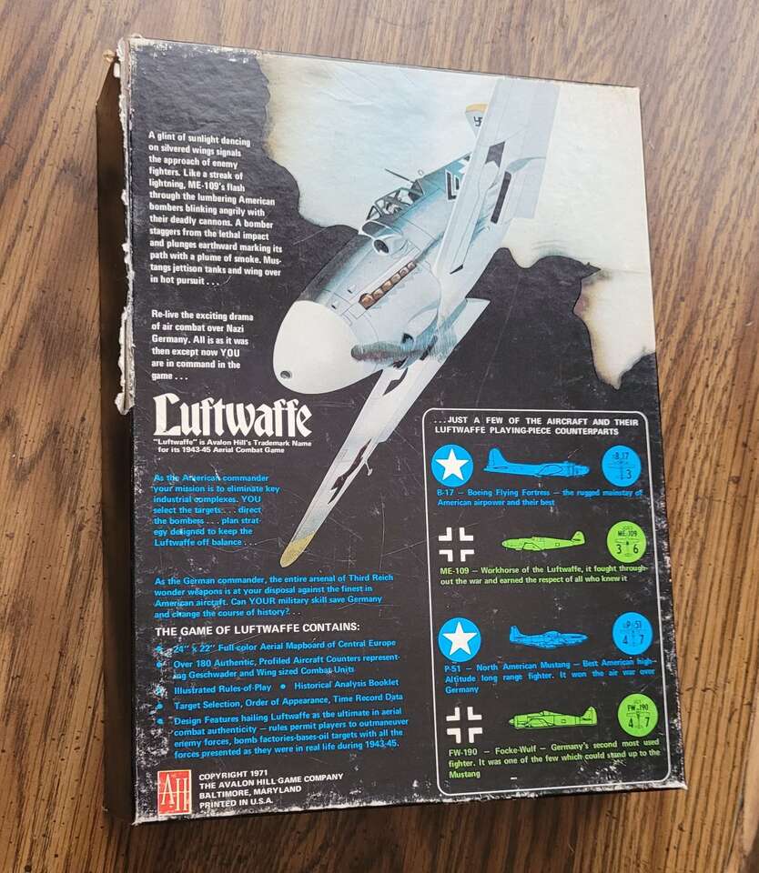 Luftwaffe Bookcase Board Game 809 Avalon Hill Box has some wear. See photos for full condition and items included. A handful of pieces have been punched out and are not in the box.
