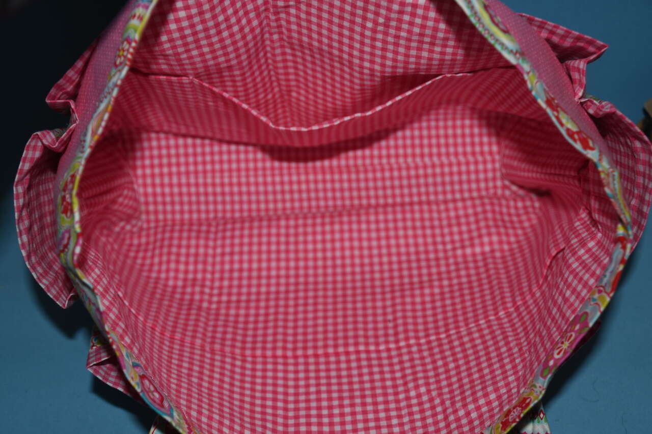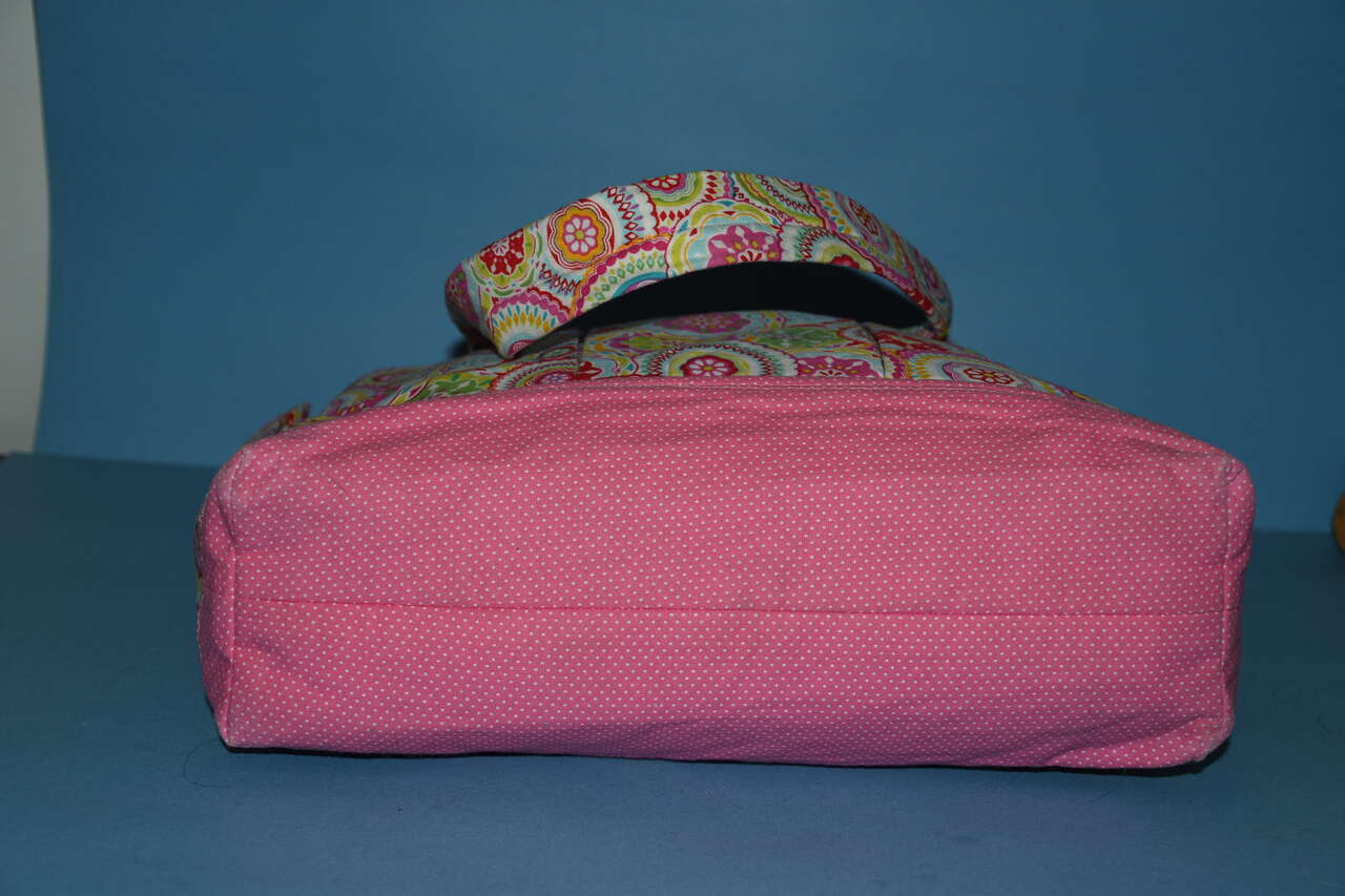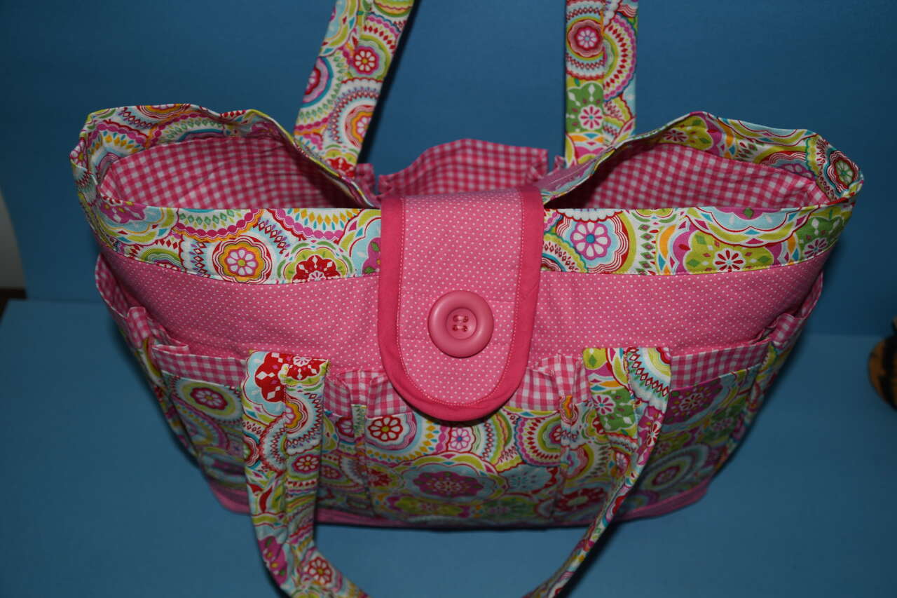 This Women's HANDMADE HANDBAG/TOTE is about 12" x 17" x 4". It has a velcro closure. It has 8 Outside pockets & 6 inside pockets. The bottom edges have some lightwear. It is Clean. Our home is smoke free. Questions??? Please ask. We are located in Plain City. Cash only please.