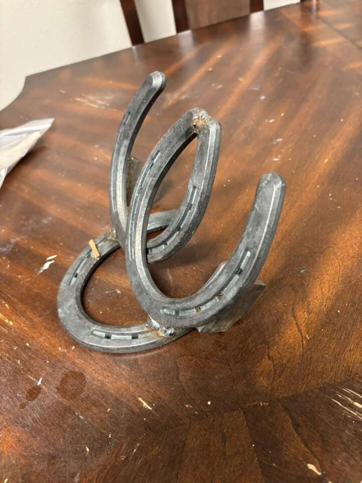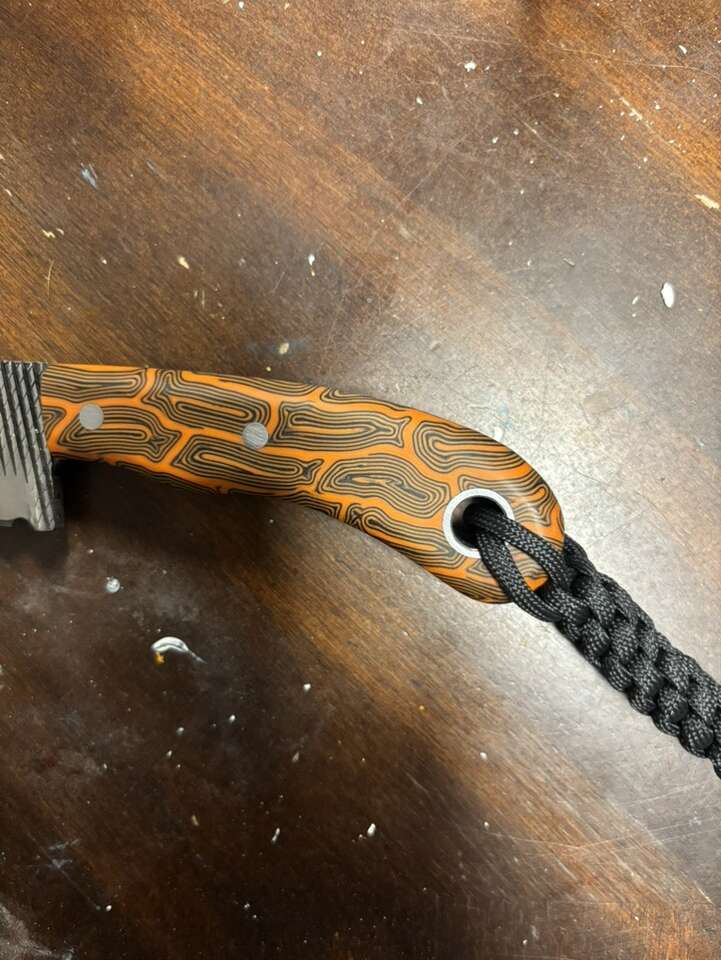 This knife was made by hand and hand sanded until polished. The orange handle is made from G10 handle material. It is fully sharpened and are ready for use. Yes the stand is included and are made out of horseshoes and pieces of rasp. I’m looking for $125 for the knife and stand. Price is obo