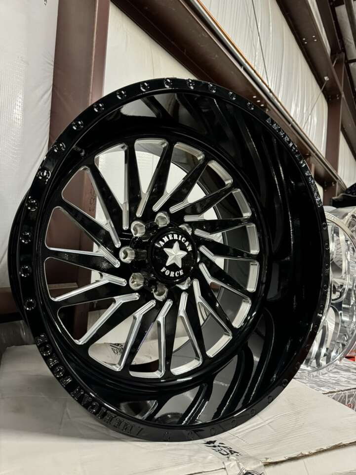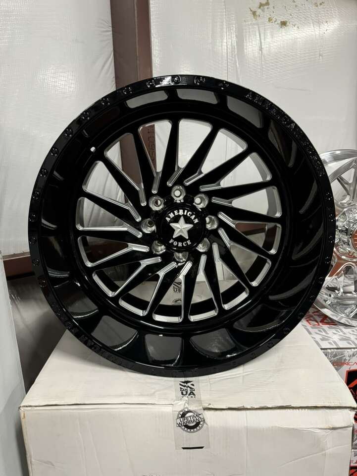 ZelleBRAND NEW REGULAR PRICE ON THESE IS $7650 24x14 American force “morphs” Floating billet caps Black and milled finish Billet forged wheels Concave design -90mm offset