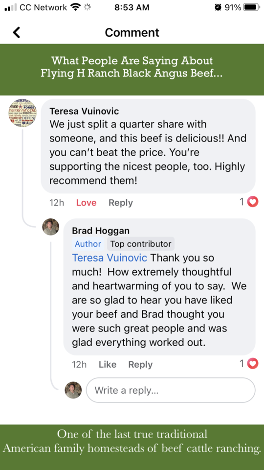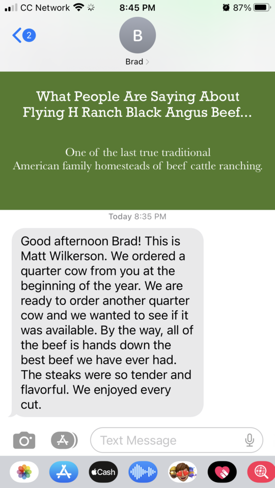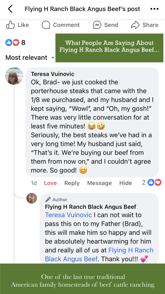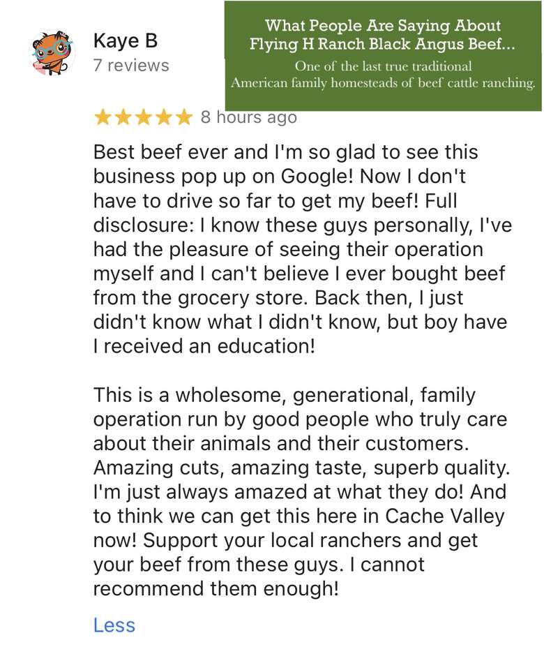 FLYING H RANCH is local, family owned & operated. My father Brad is 73 years old and he knows everything about beef, cattle, ranching and it all comes with a smile and a handshake.
