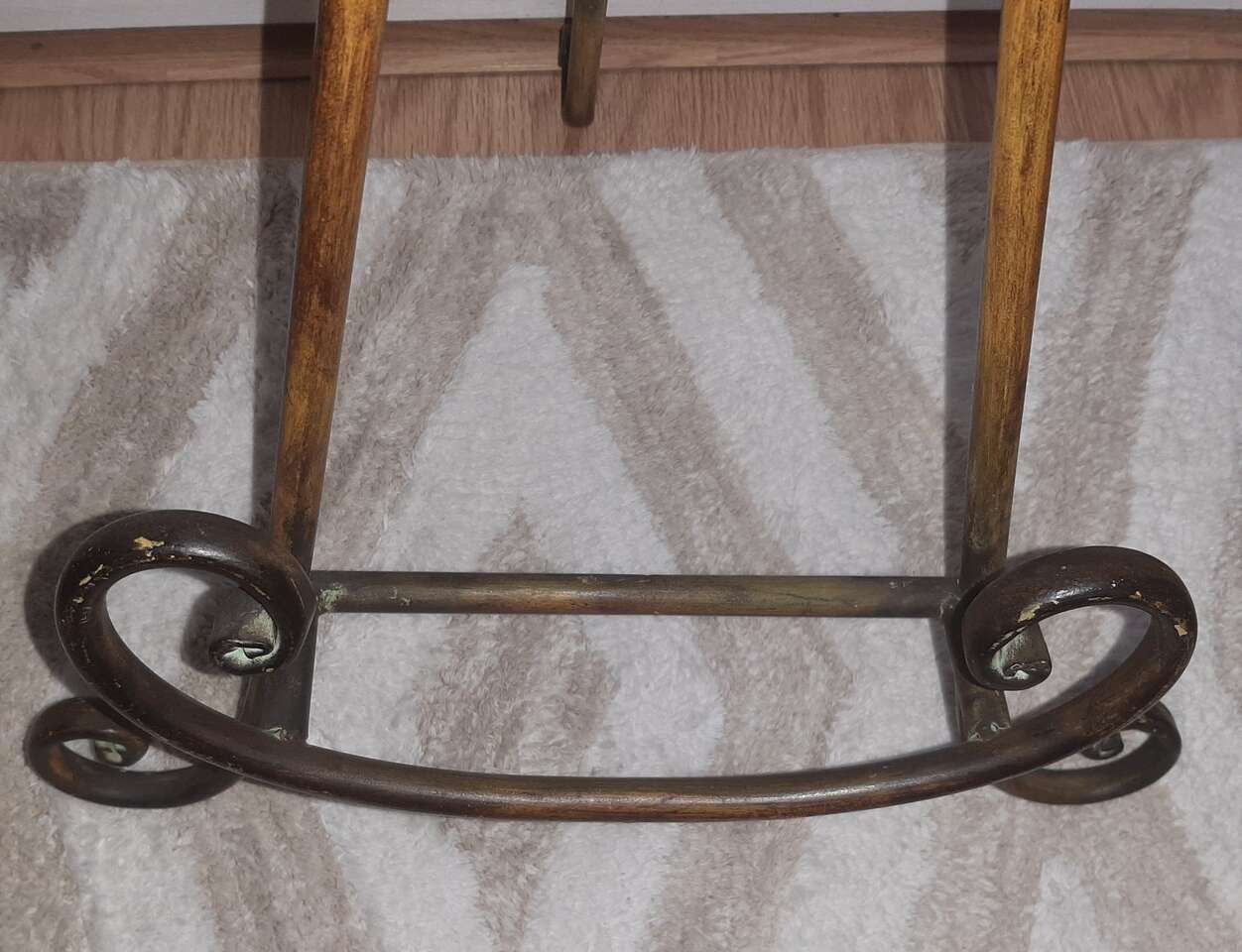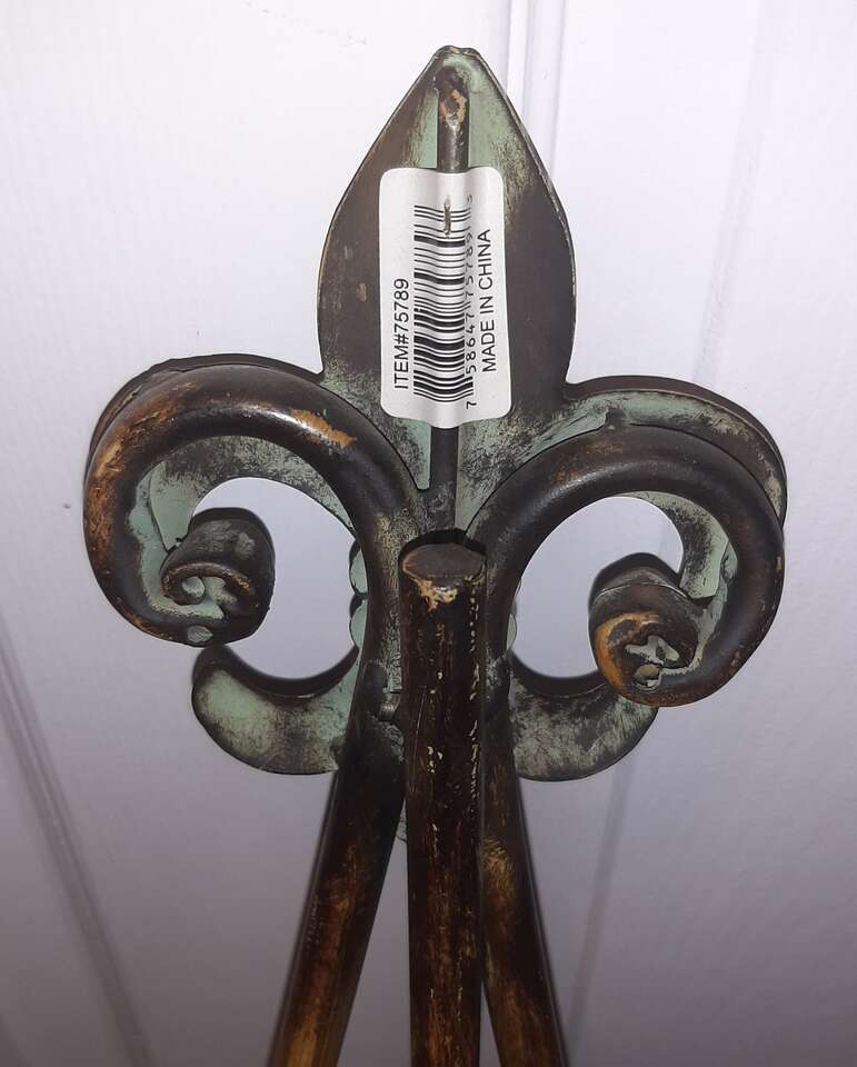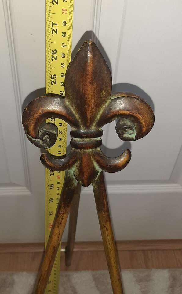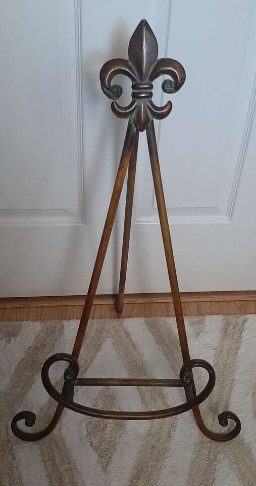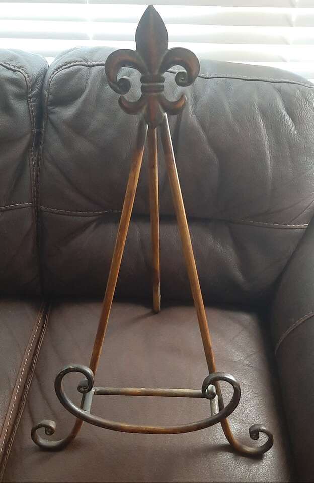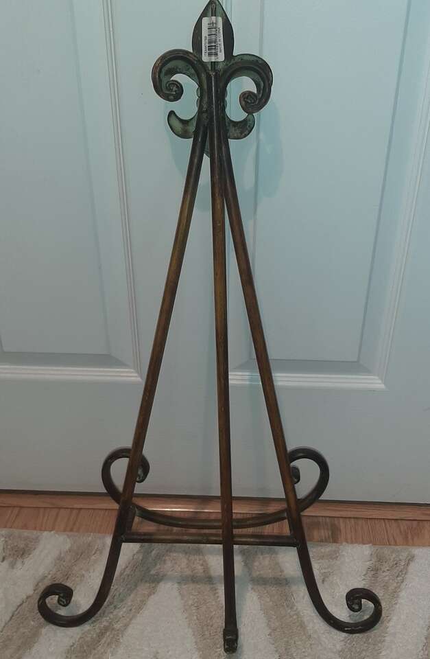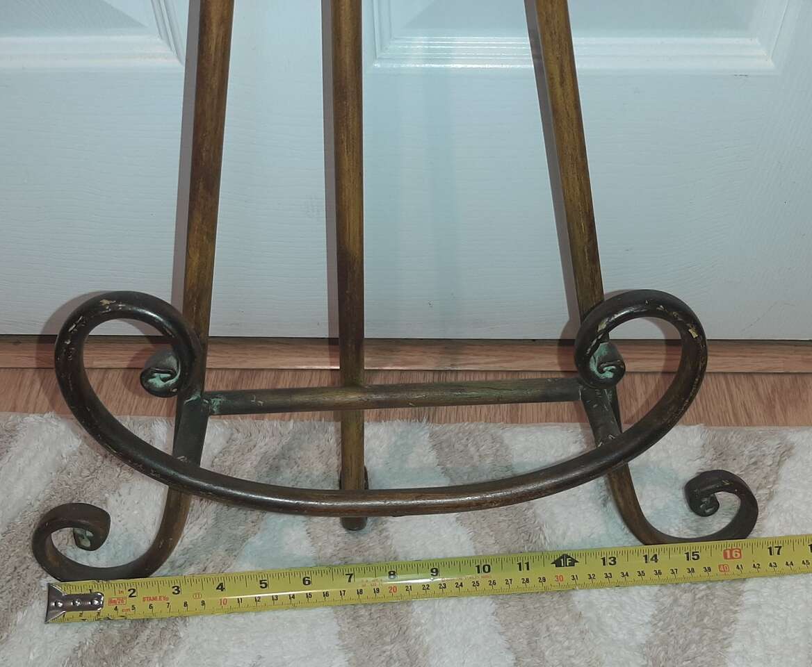 27 inch tall metal decorative easel for holding portraits, pictures, canvas, literally anything you can think of. It's about 16 inches wide at the widest part (bottom) and two 2 inches wide where the item can be placed. It is foldable, so it flattens. Great condition. Has a purposeful "old metal" or patina look to it. Would be great wedding decor. Smoke free.
