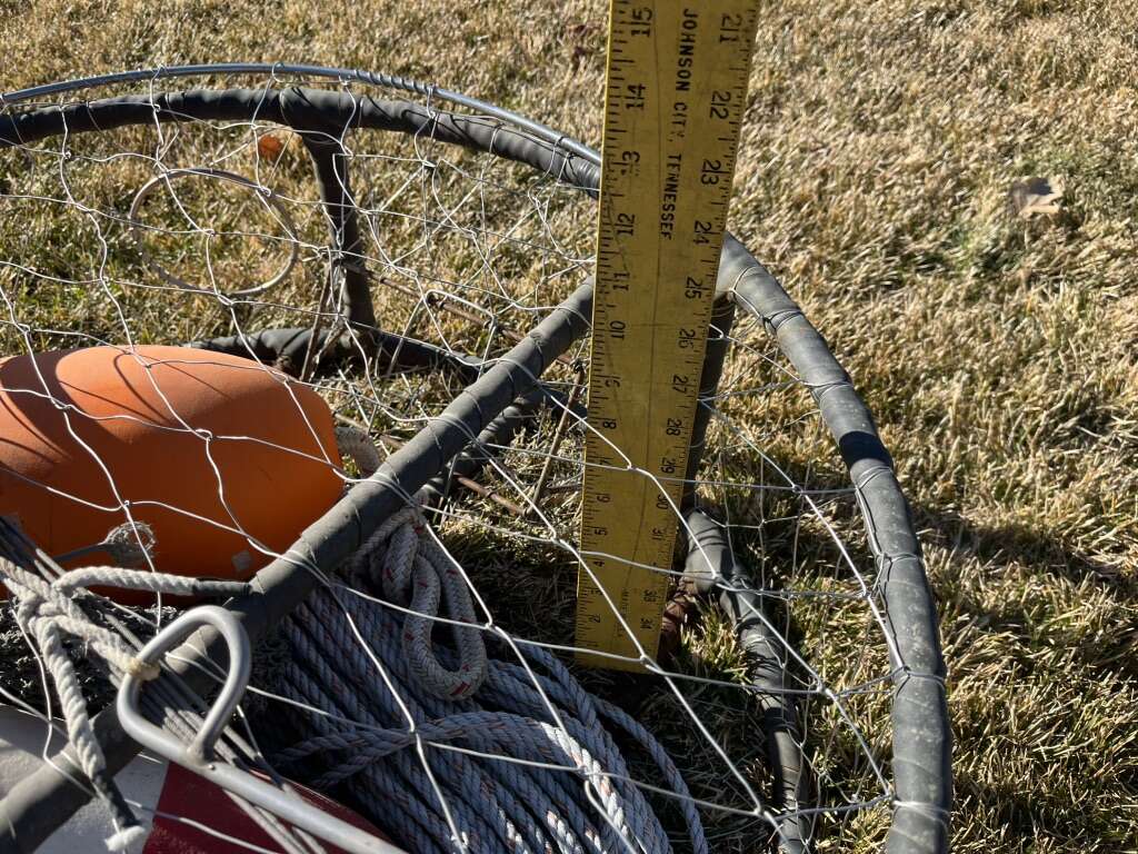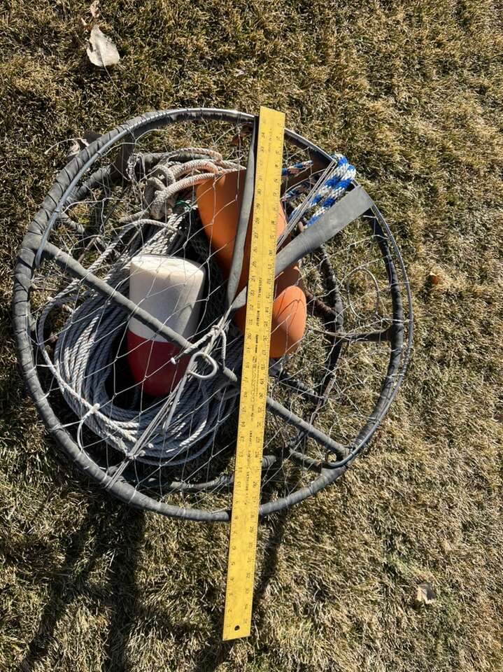 Crab pot with leaded line and buoys Measuring stick is in picture