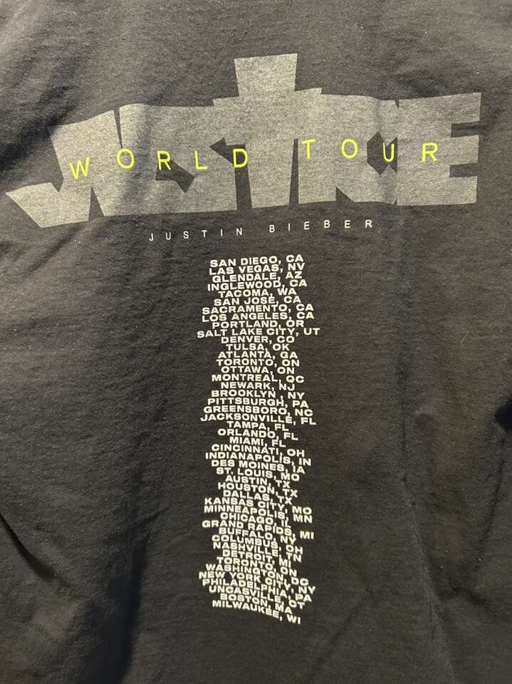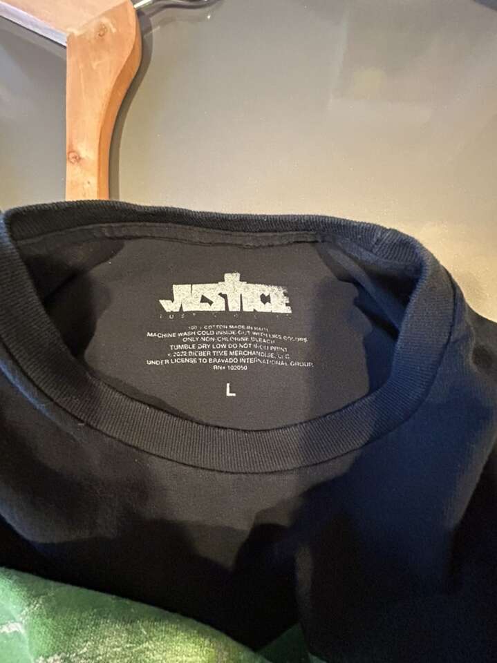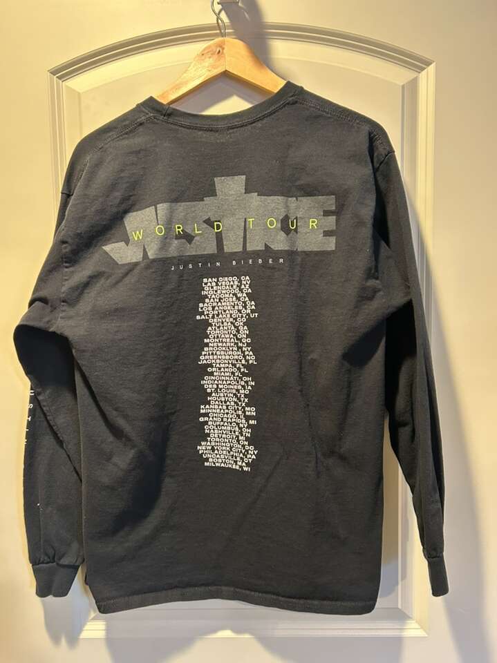 VenmoSize large Justin Bieber World Tour long sleeve black knit concert t-shirt in like new condition. Silk screen is in excellent condition. Justin Bieber in white lettering runs down one sleeve. Justice brand. Clean smoke free home. Cash or Venmo. Porch pick up from Alpine.