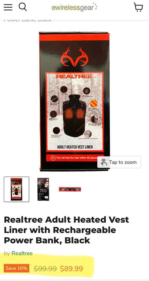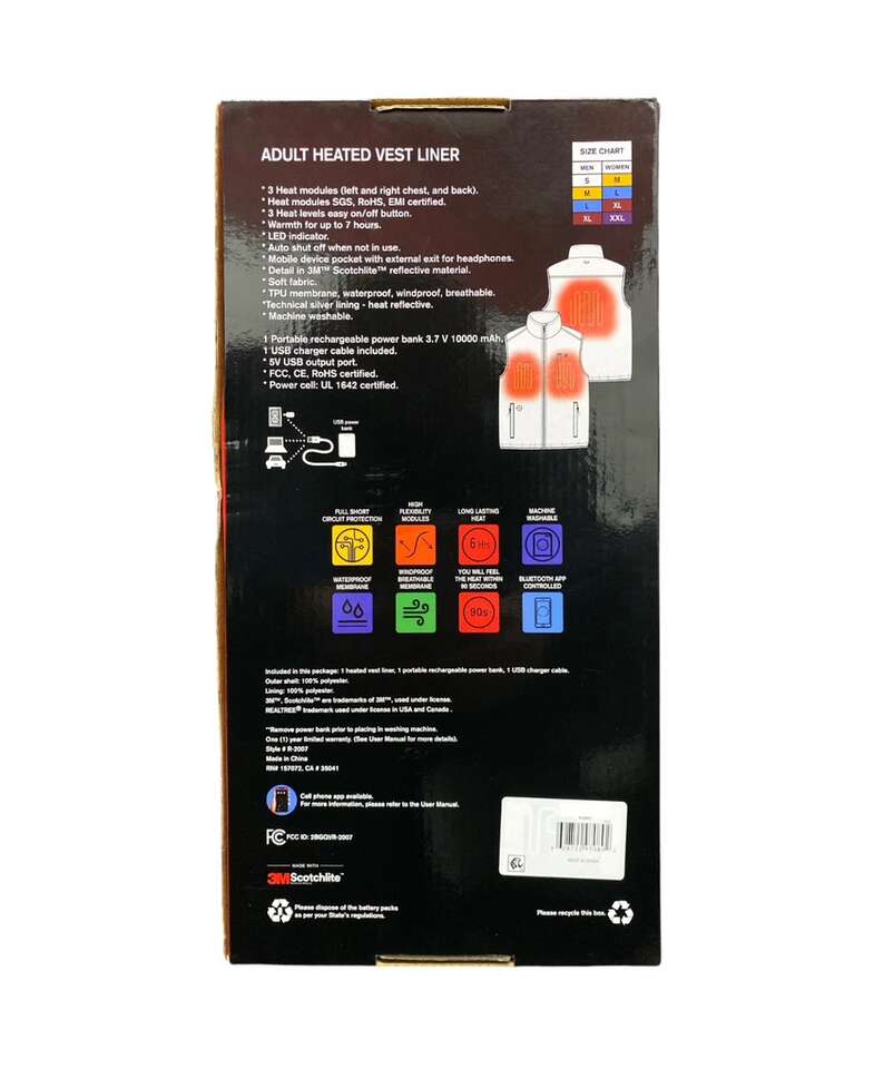 Ultimate Cold Weather Essential The Realtree adult vest liner is the perfect solution for chilly weather. Lightweight and versatile, it can be worn alone or layered for extra warmth. With a choice of heat levels controlled by an easy-to-use LED button or a Bluetooth application, this vest ensures you'll feel cozy in just 90 seconds. Advanced Heating Technology The vest's inner lining features technical silver heat-reflective material that works alongside your body heat. This enhances the warmth produced by the three heat modules within the vest. The shell fabric incorporates a TPU membrane, making the vest wind-proof, water-proof, breathable, and washable for ultimate convenience. Powered for Warmth The heating modules are powered by a lightweight, portable 10000 mAh lithium-ion power bank. Conveniently tucked away in an inner pocket, it ensures you stay warm without compromising on mobility or comfort. Thoughtful Design Features The Realtree adult vest liner is designed with your comfort in mind. It features a chin guard to protect against zipper chaffing, a storm placket for extra wind protection, and reliable YKK zippers. The vest also includes 3M Scotchlife reflective piping for added visibility in low-light conditions. Stylish and Functional This innovative vest is not just practical - it's also stylish. Designed to provide comfort, fit, and function, it's the perfect addition to your cold-weather wardrobe. Whether you're heading out for a winter walk or need an extra layer for a day at work, the Realtree adult vest liner is a versatile and fashionable choice. Made with PFAS Chemicals. Shell Fabric: 95% polyester, 5% spandex, water repellent Lining: 100% polyester Remove power banks before placing garments in the washing machine 1 portable rechargeable, quick charge 10000mAh, power bank with 1 charger cable included Bluetooth application 3 heat module on left and right chest and back Up to 7 hours of warmth LED indicator Auto shut-off when not in use