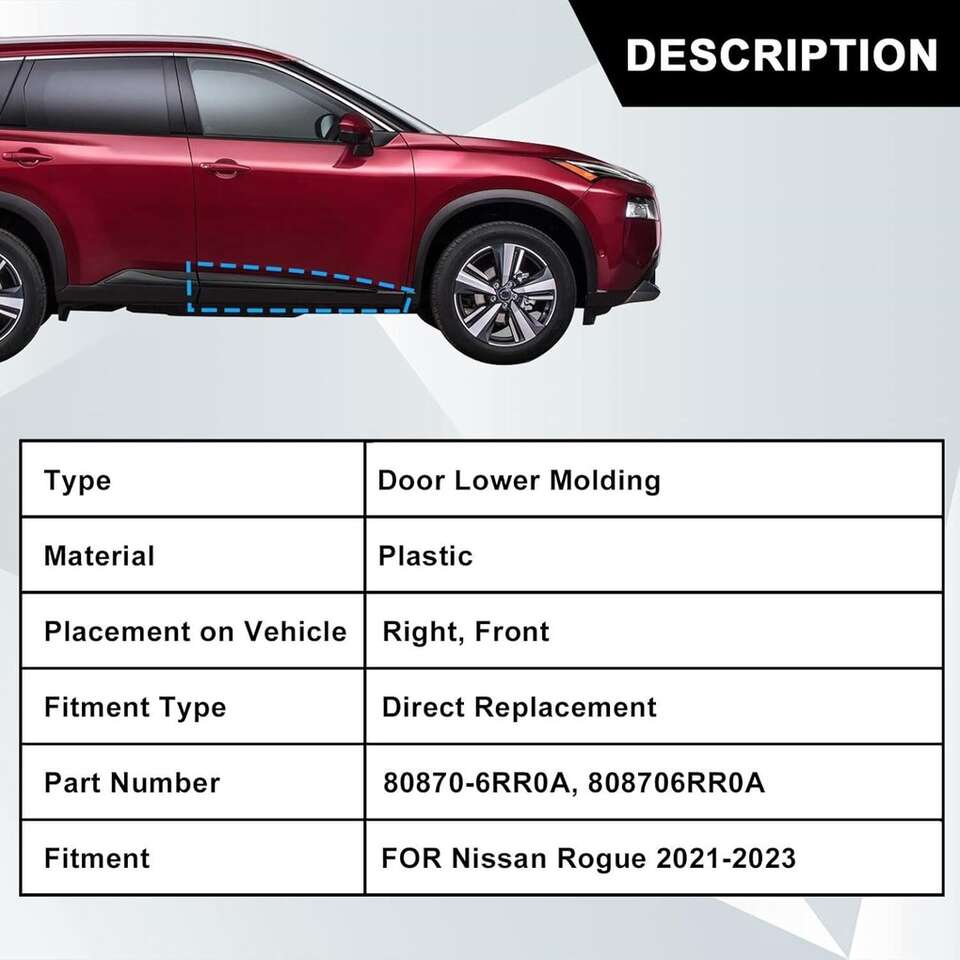Fitment: Compatible with Nissan Rogue 2021 2022 2023 Front Right Lower Side Door Trim Molding Part Number: 80870-6RR0A 808706RR0A