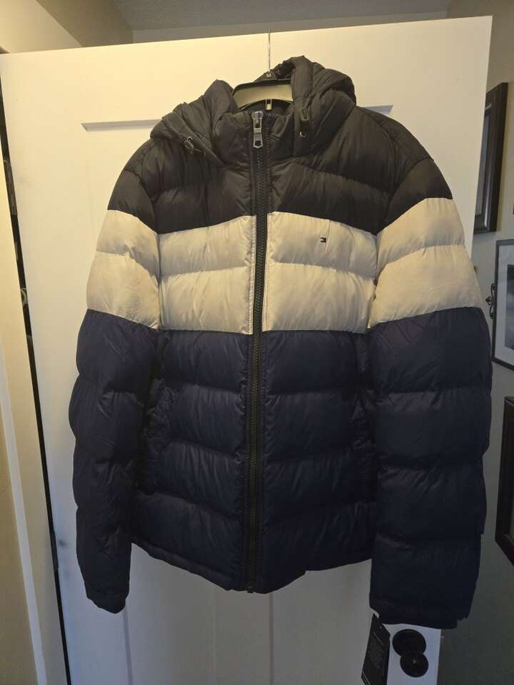 Brand new with tags Tommy Hilfiger hooded puffer coat. size is mens XL. Colors are a little of in the photo. Upper it's dark blue, chest is white, lower is medium blue. I found it online for $135 on sale. Buy here for well under half price. $50 FIRM. Cash only, no Venmo. Sold as is, no returns. Located in Erda, just north of Tooele. Pickup only. No delivery. I rarely go outside Tooele area. See my other listings. I have a lot of random stuff currently listed.