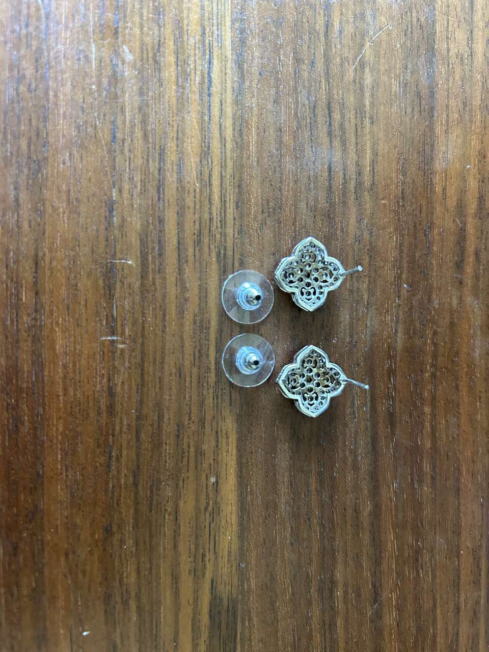 VenmoClover stud earrings in silver-tone. I bought these costume earrings years ago but never ended up wearing them since I already have too many, so I’d like these to go to a good home. I’m not sure what the materials are because they didn’t come with a description and there are no markings - they’re also lightweight! Earrings each measure 5/8” x 5/8”.