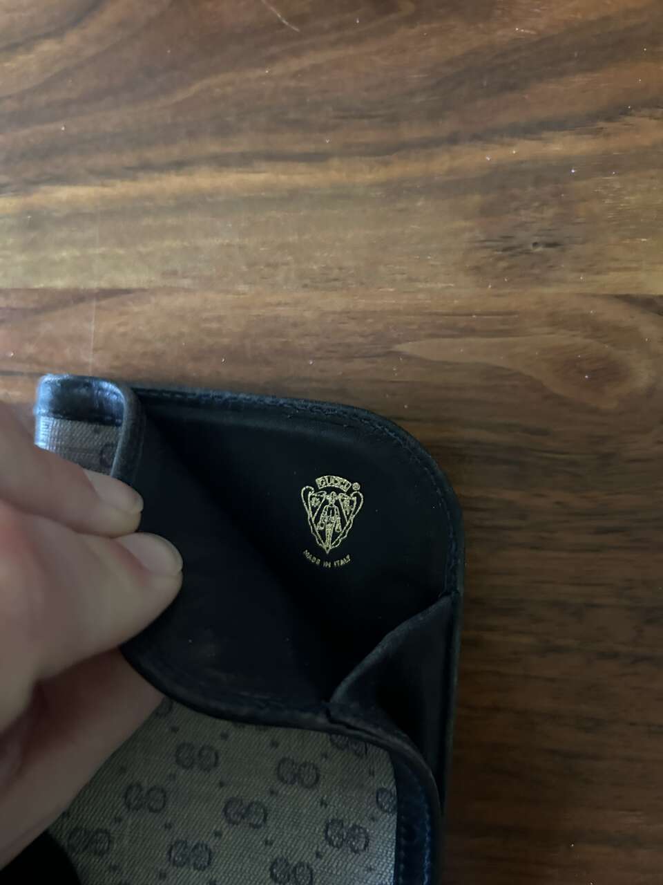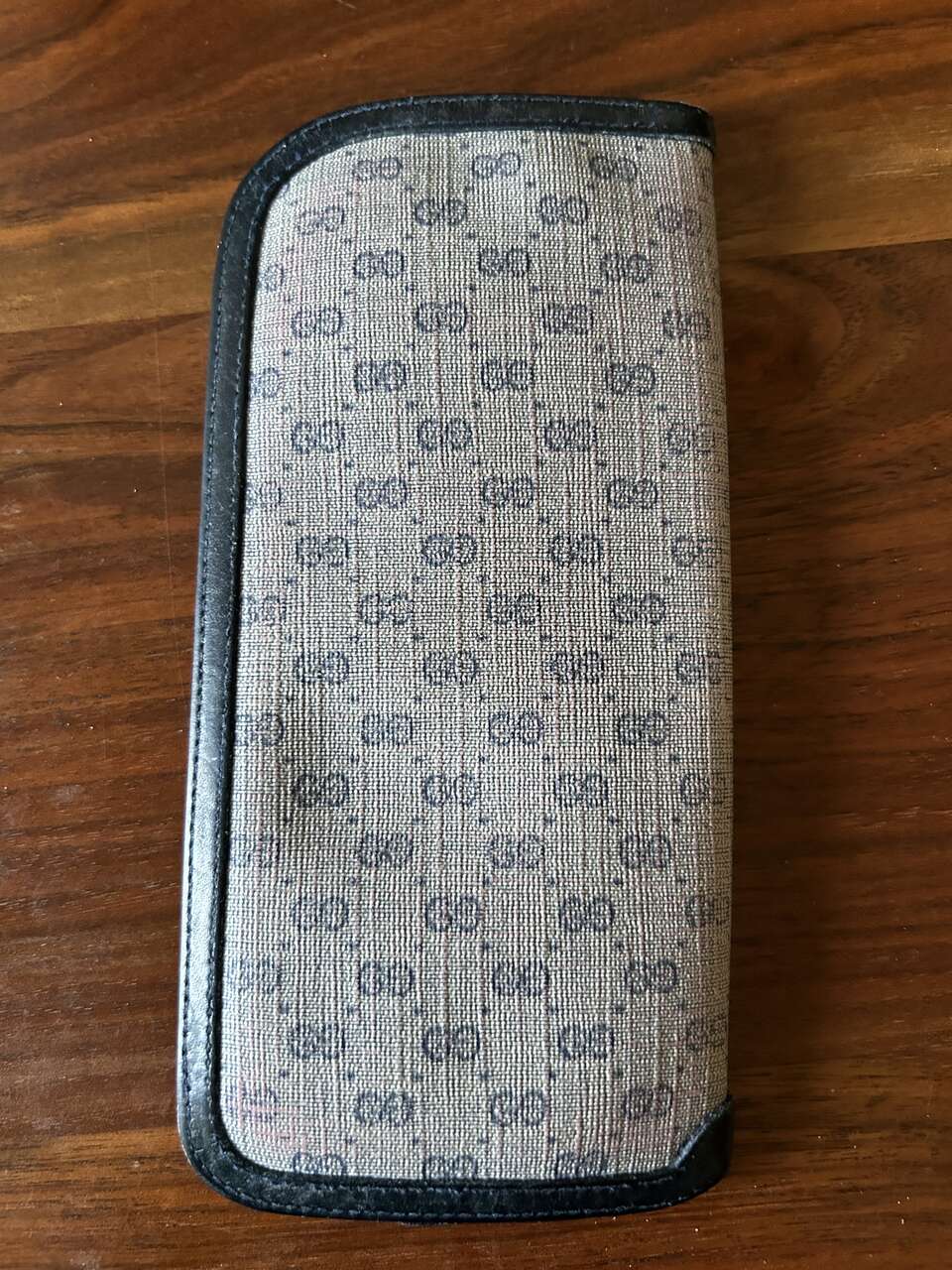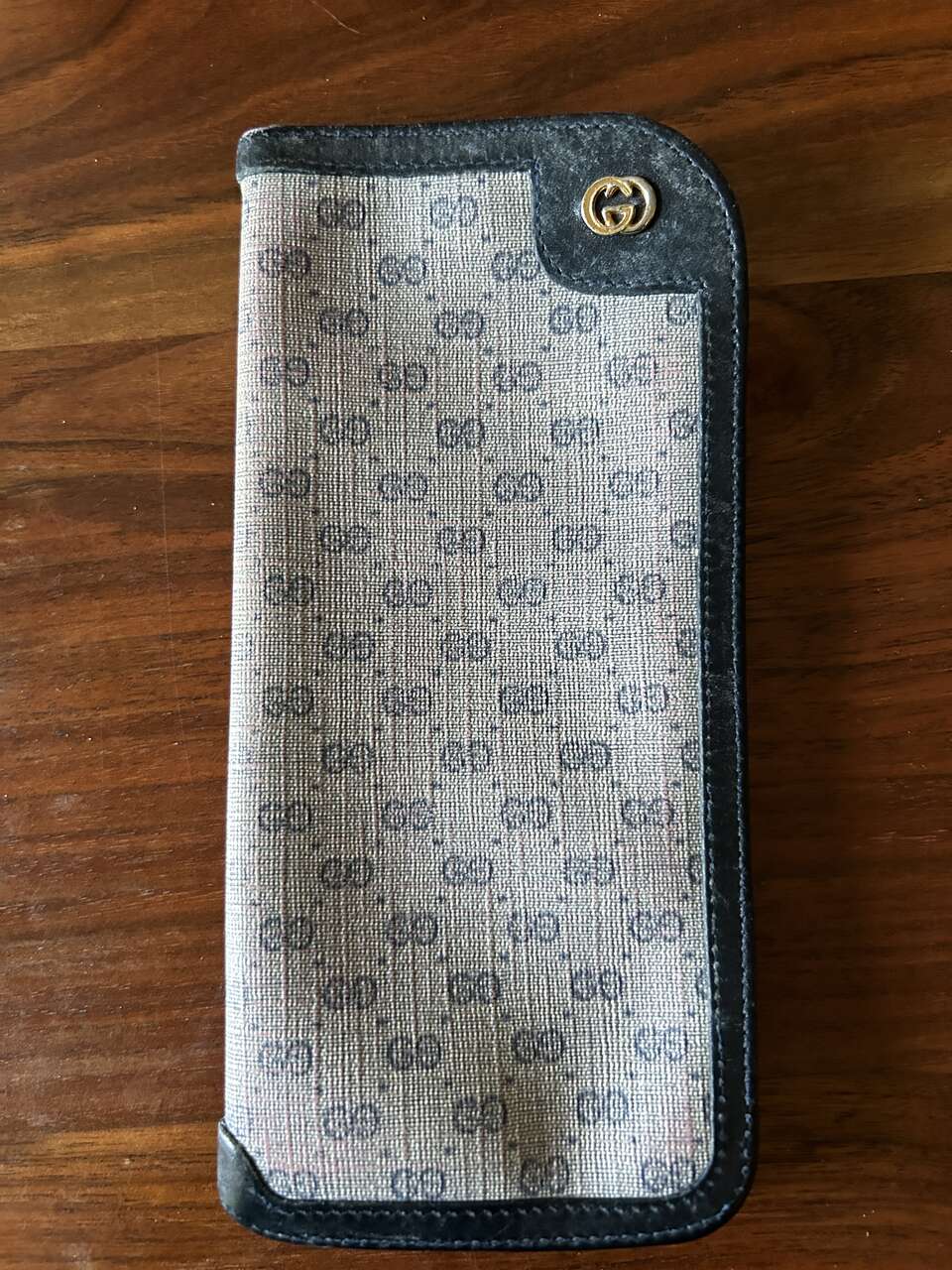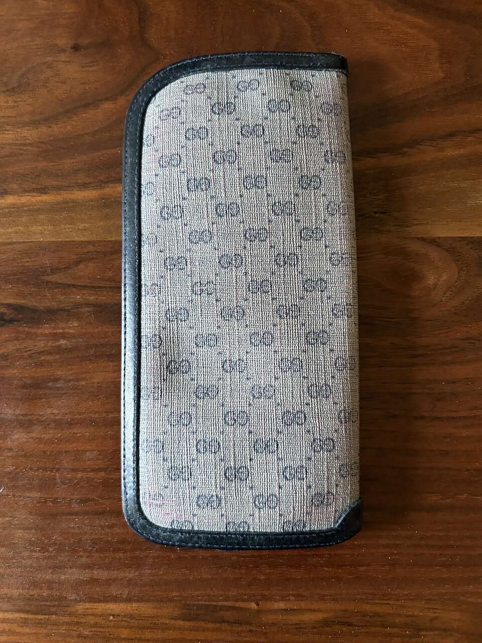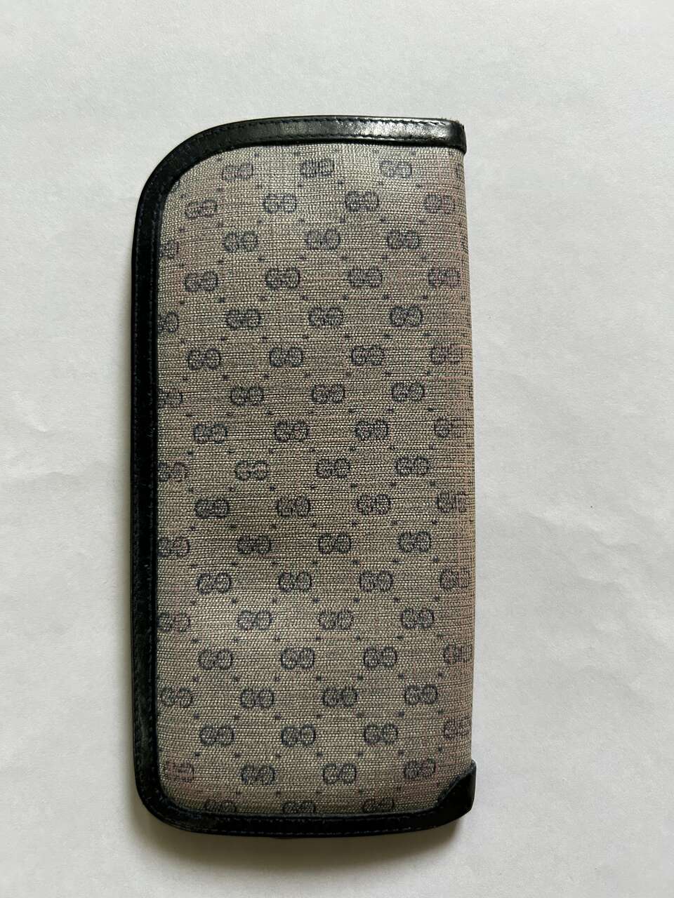 VenmoGucci Monogram Glasses Case in Navy Blue. There is natural wear on leather trim but still good condition – just some worn down on the top left corner. Canvas is in great condition but there is some pink-ish color transference on both sides - not sure where it came from, possibly from being in my Mom's red purse. It's super light and I don’t think you would have noticed unless I mentioned it. Gold stamp inside reads GUCCI MADE IN ITALY. Mom purchased in 1980s or 1990s. Measures 7L x 3.25W x 1D