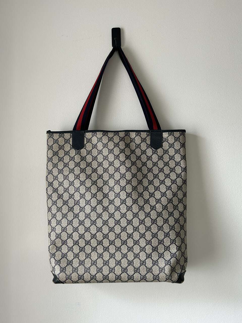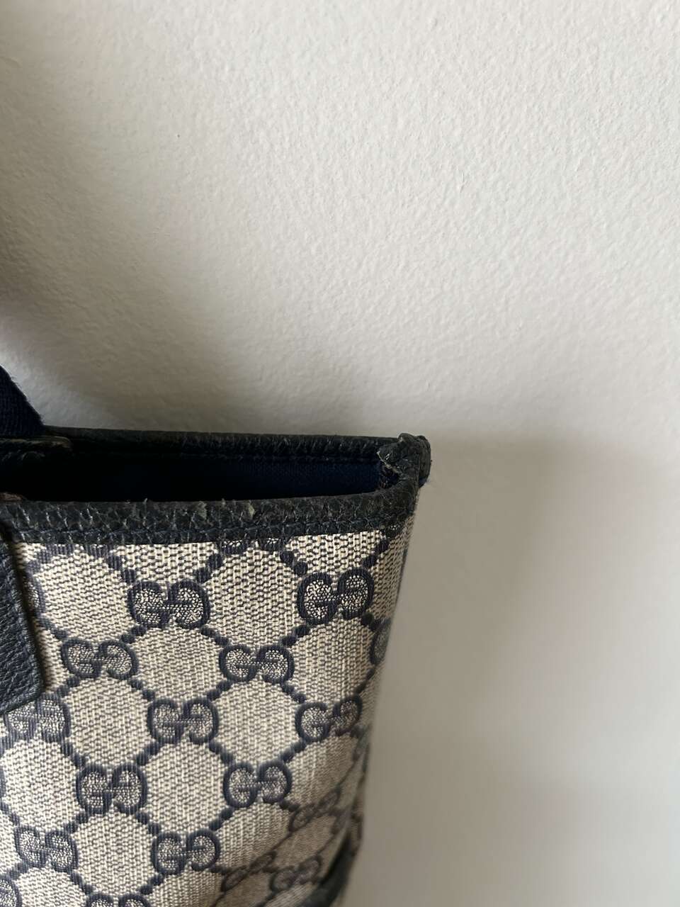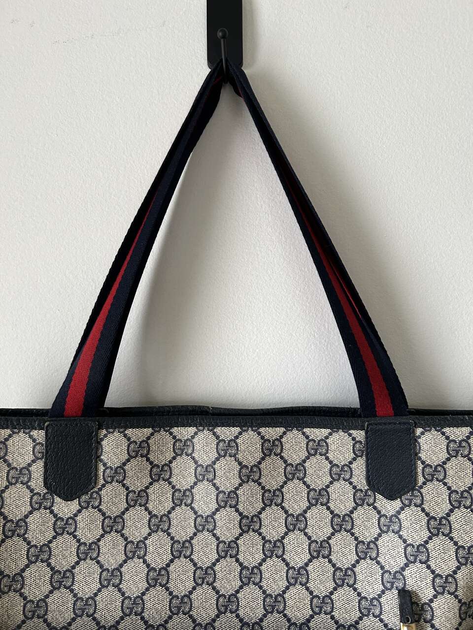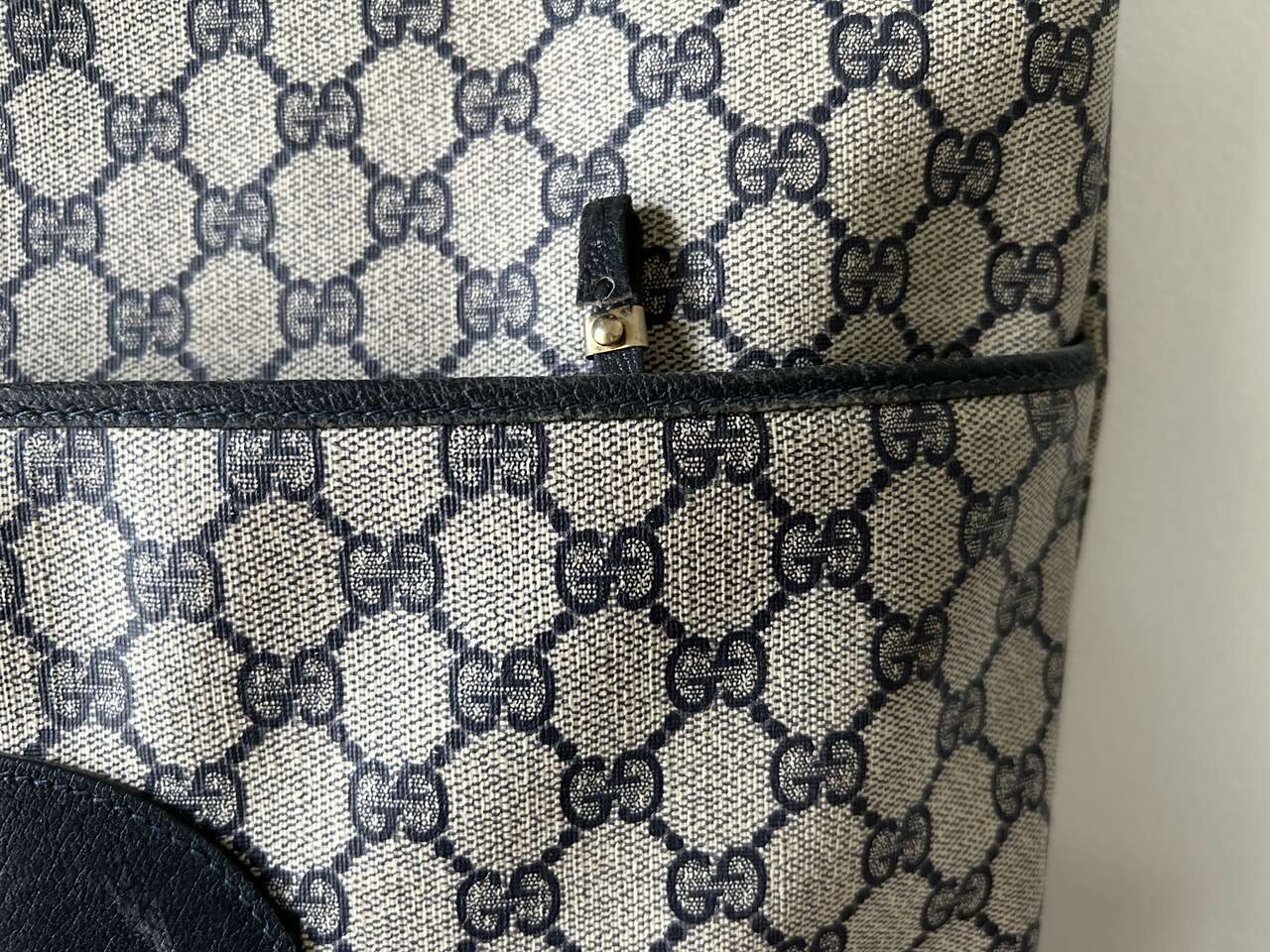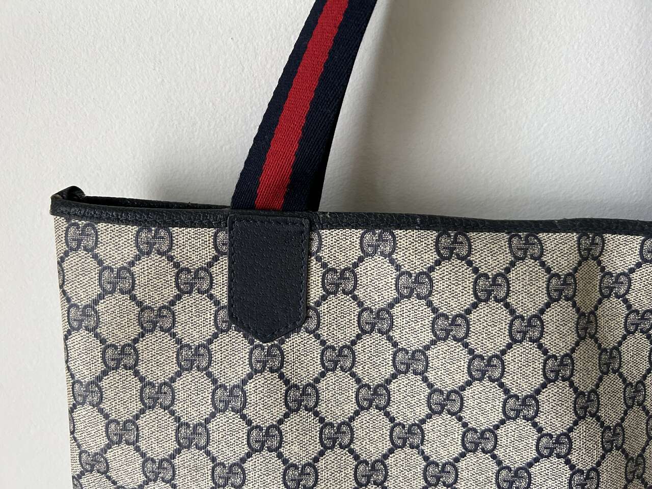 VenmoGucci Monogram Web Tote in Navy Blue. Mom purchased bag in late 1980s/early 1990s so there is wear on the leather corners on the bottom, small scratch on leather oval on front (easy to fix), and natural wear on leather trim. The leather on the zipper pull pulled out of grommet separating it from the gold Gucci tab (this could easily be fixed with the correct tool, I just don’t have it. Interior, blue/red straps, and coated canvas are in excellent condition – no cracks. Magnetic Closure work perfectly. Made in Italy Features: Two Canvas Shoulder Straps Magnetic Snap Closure Coated Canvas Canvas Lining Gold Hardware Measures approximately 15W x 15.5H x 3.5-4D, Strap Drop: 9