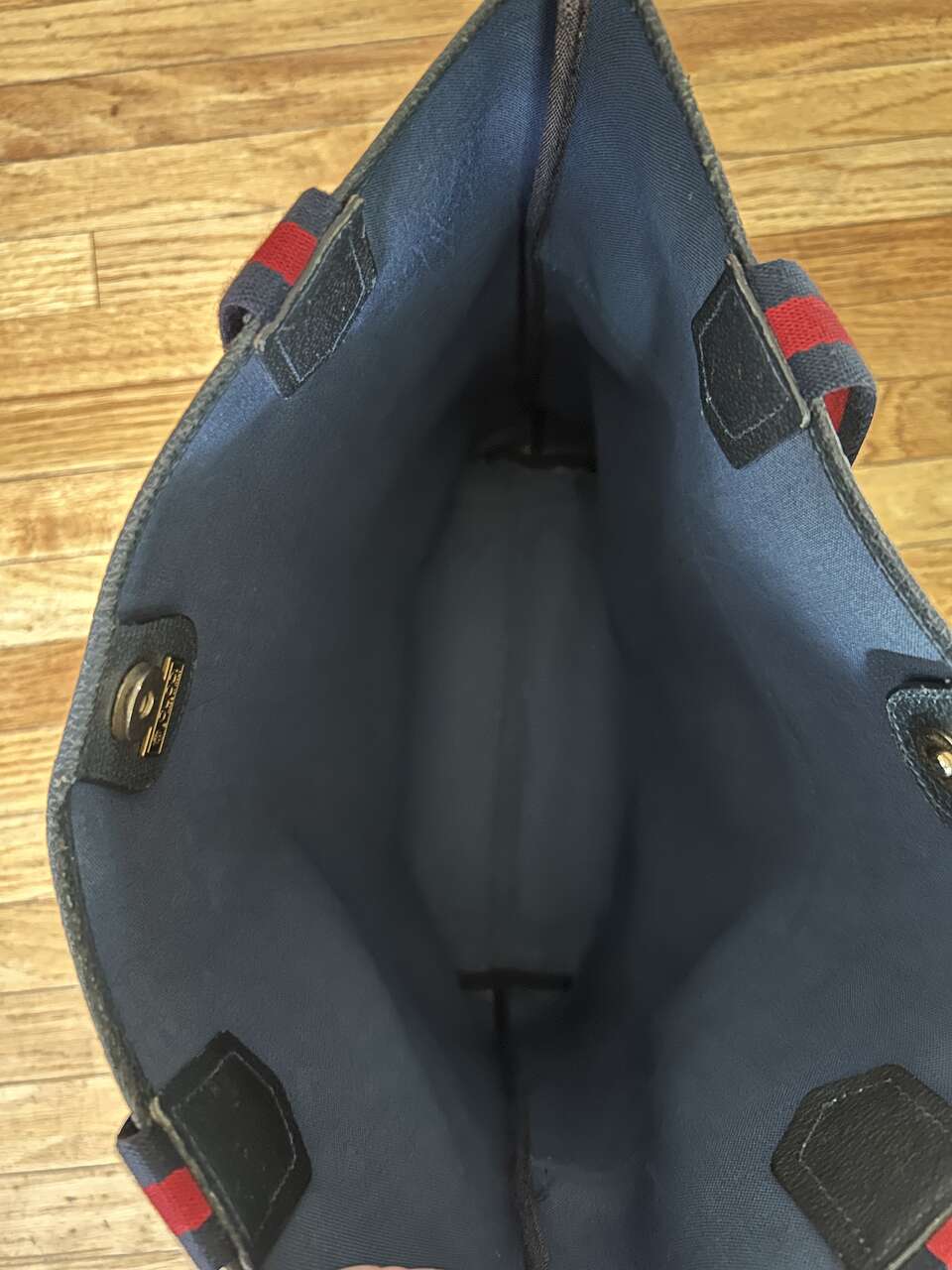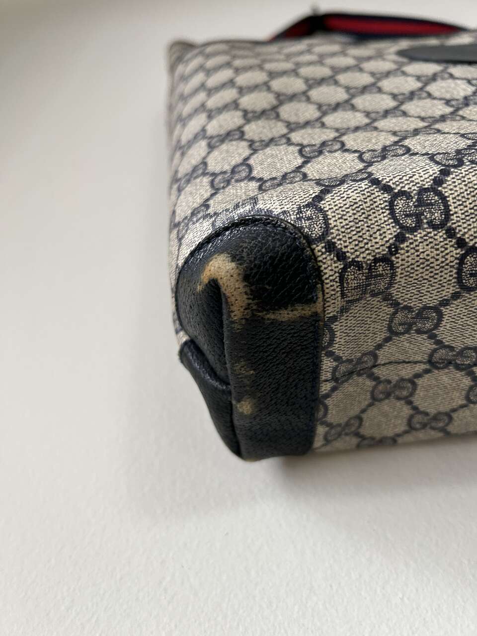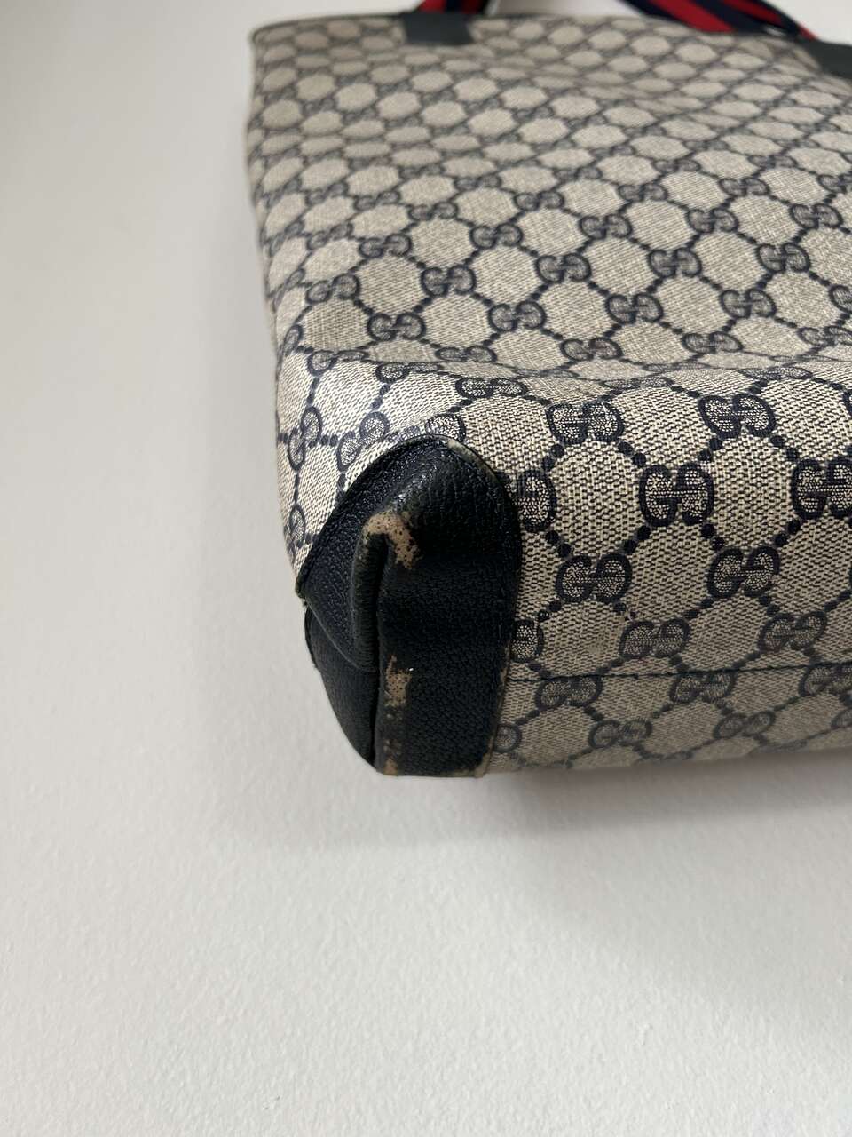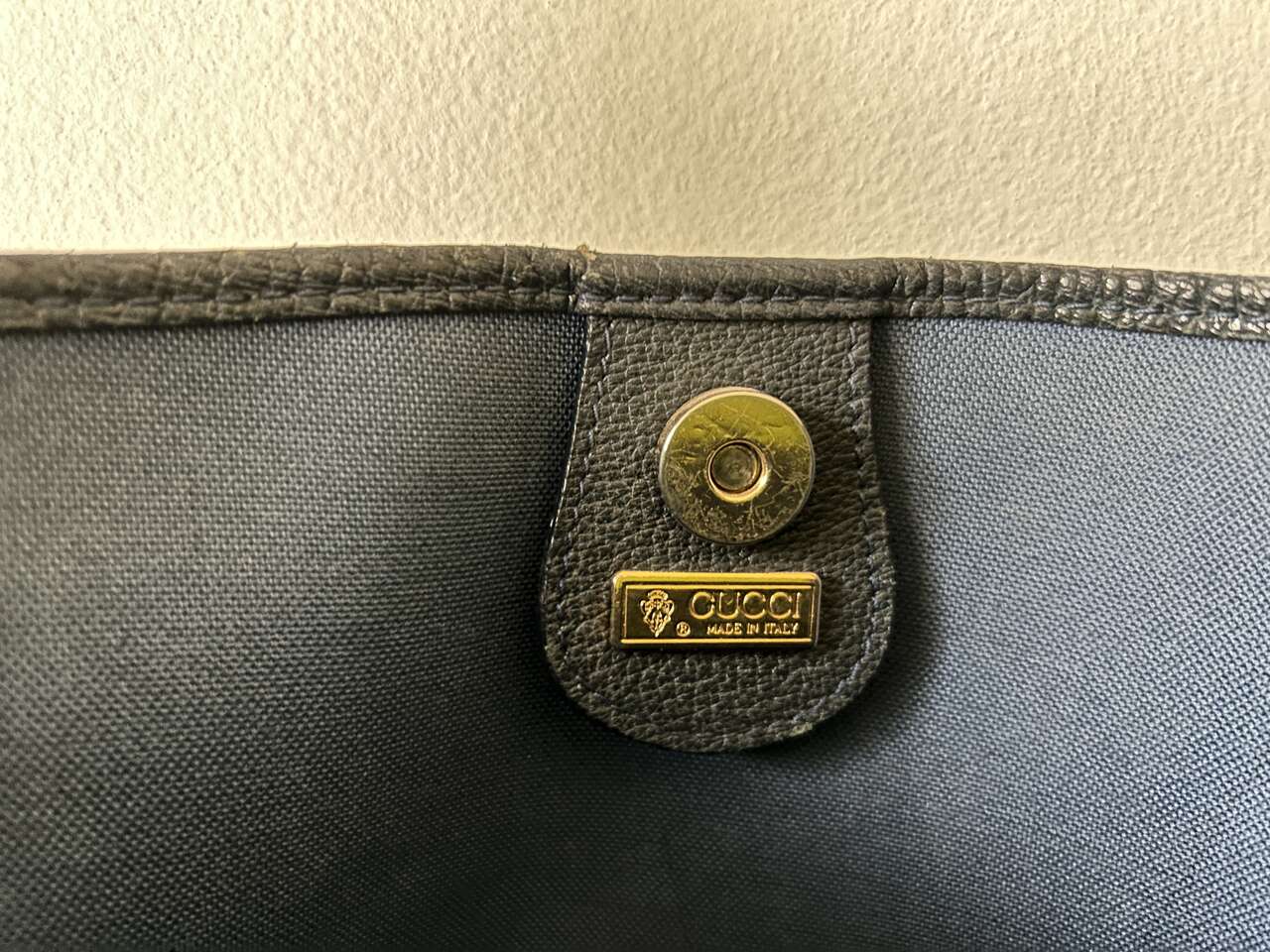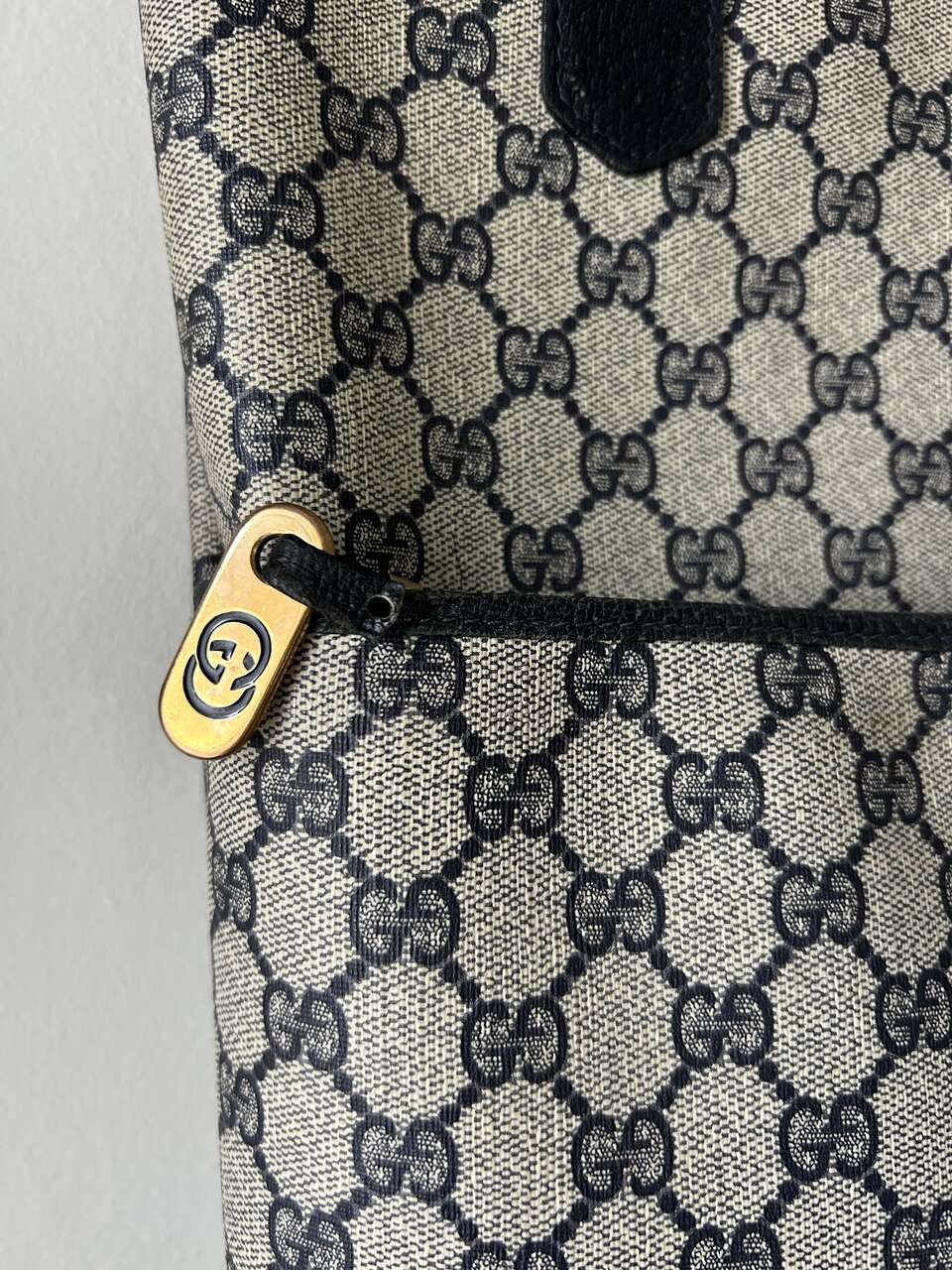 VenmoGucci Monogram Web Tote in Navy Blue. Mom purchased bag in late 1980s/early 1990s so there is wear on the leather corners on the bottom, small scratch on leather oval on front (easy to fix), and natural wear on leather trim. The leather on the zipper pull pulled out of grommet separating it from the gold Gucci tab (this could easily be fixed with the correct tool, I just don’t have it. Interior, blue/red straps, and coated canvas are in excellent condition – no cracks. Magnetic Closure work perfectly. Made in Italy Features: Two Canvas Shoulder Straps Magnetic Snap Closure Coated Canvas Canvas Lining Gold Hardware Measures approximately 15W x 15.5H x 3.5-4D, Strap Drop: 9