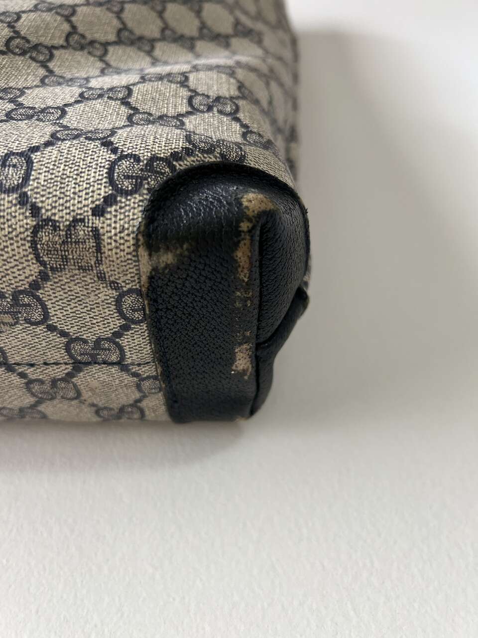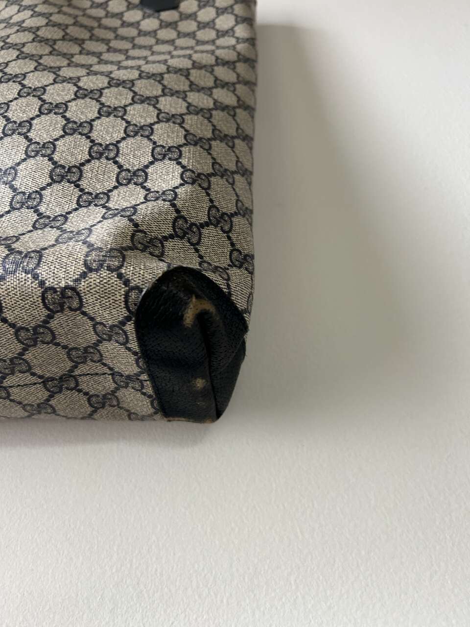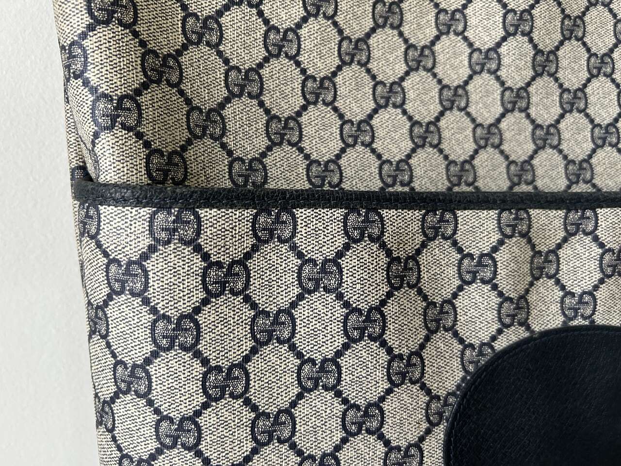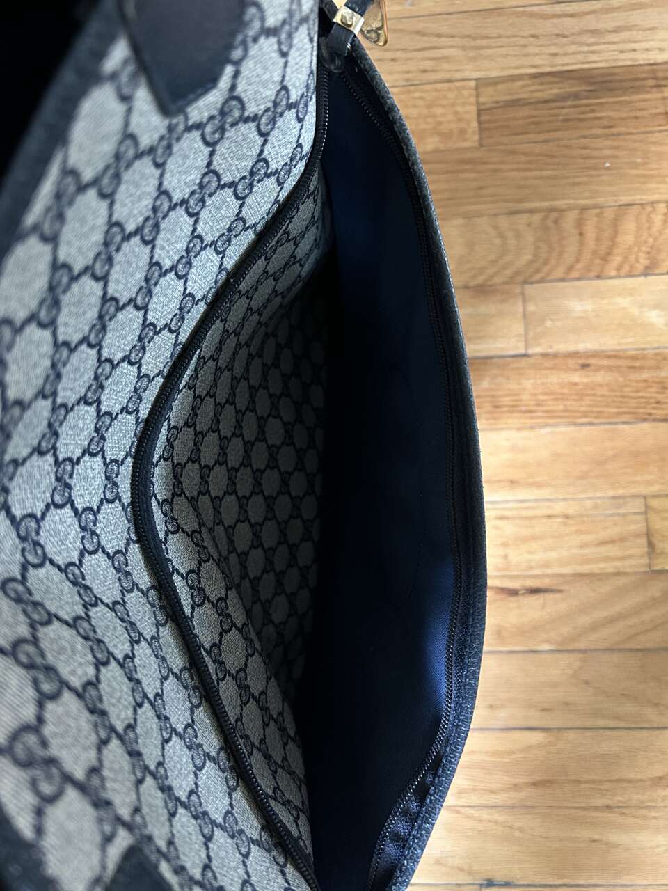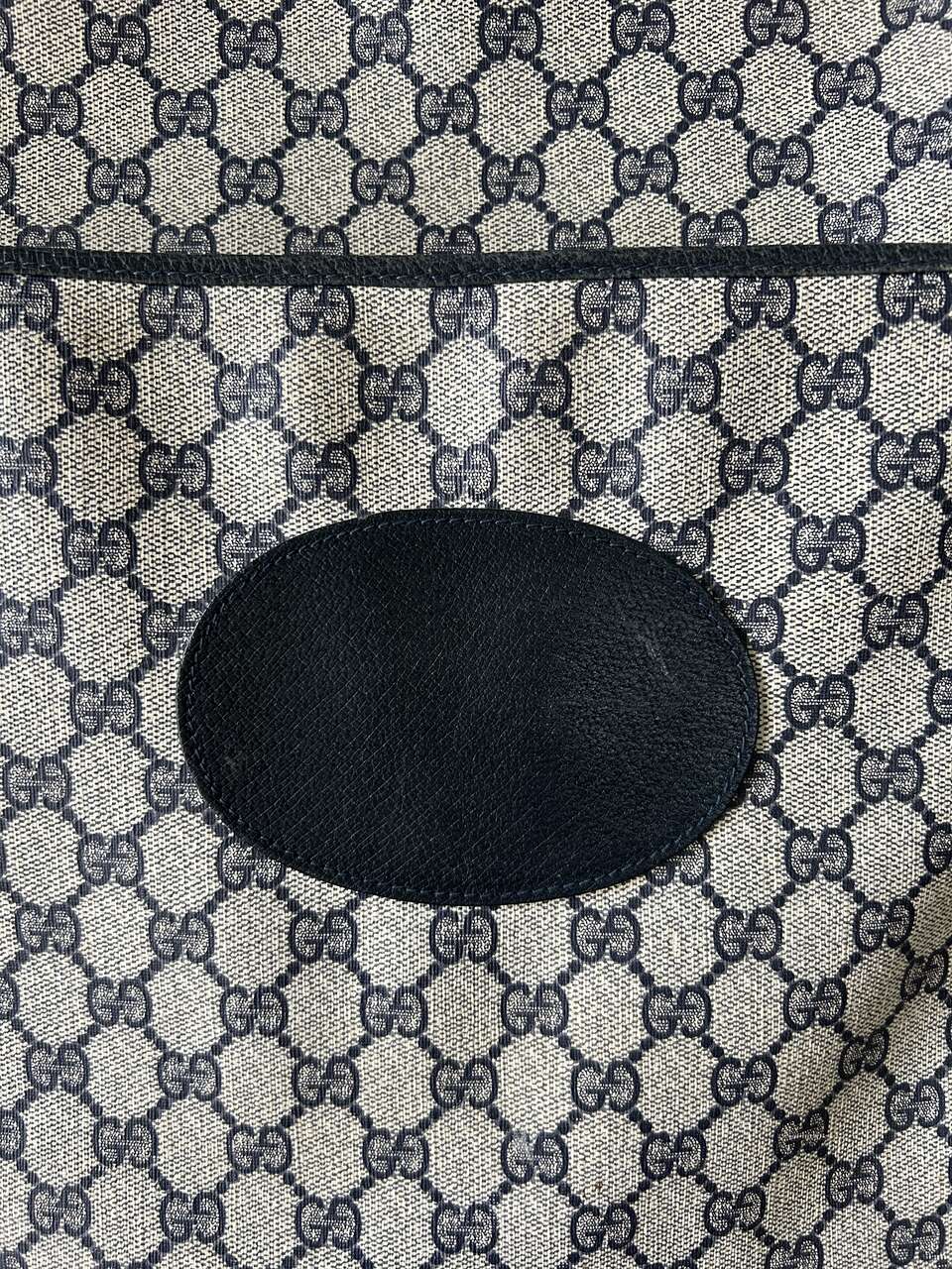 VenmoGucci Monogram Web Tote in Navy Blue. Mom purchased bag in late 1980s/early 1990s so there is wear on the leather corners on the bottom, small scratch on leather oval on front (easy to fix), and natural wear on leather trim. The leather on the zipper pull pulled out of grommet separating it from the gold Gucci tab (this could easily be fixed with the correct tool, I just don’t have it. Interior, blue/red straps, and coated canvas are in excellent condition – no cracks. Magnetic Closure work perfectly. Made in Italy Features: Two Canvas Shoulder Straps Magnetic Snap Closure Coated Canvas Canvas Lining Gold Hardware Measures approximately 15W x 15.5H x 3.5-4D, Strap Drop: 9