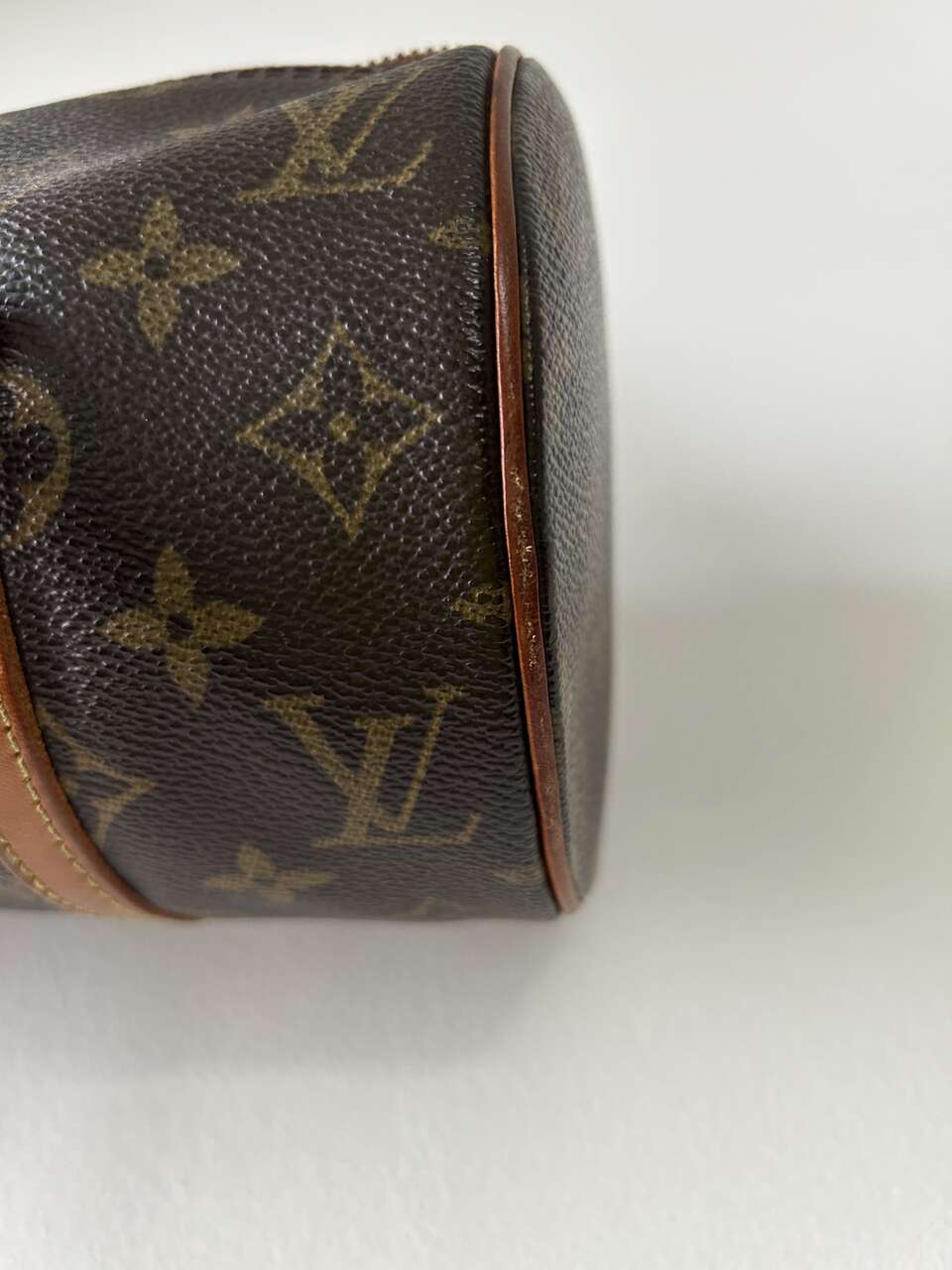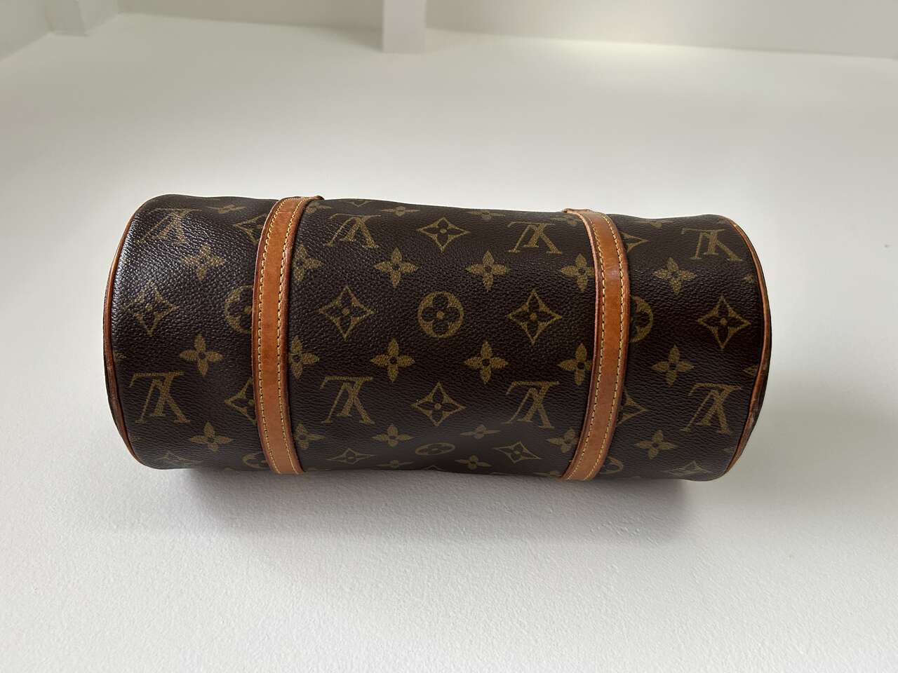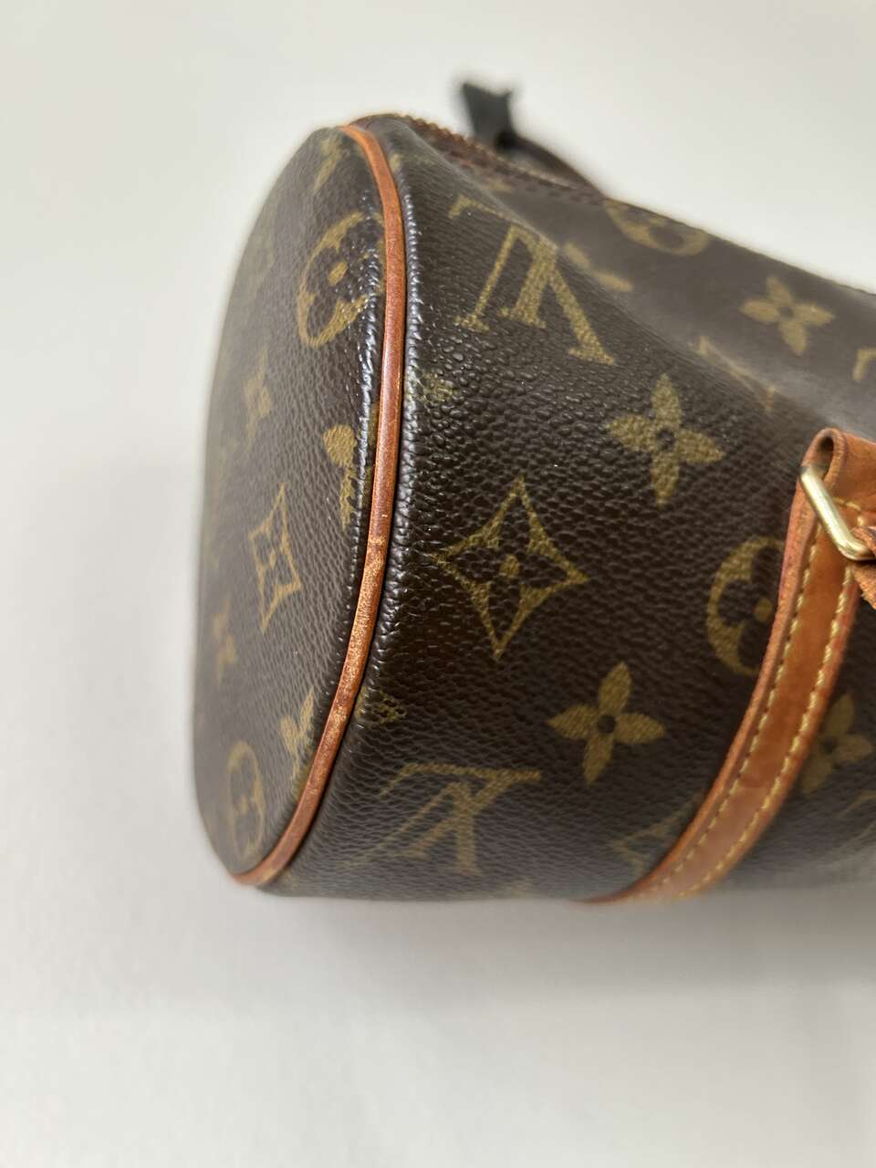 VenmoLouis Vuitton Papillon Handbag Monogram Canvas 26 in Brown. The leather straps have a natural patina. There is natural wear on the leather piping around the rim of the bag and natural wear on the LV zipper pull and zipper (see pictures. There are some marks on the end of the barrel inside on one side (see picture). No cracks found in canvas – great condition. Original dust bag also included. Mom purchased bag for me from Saks in NOLA in December 2004. To prove authenticity, I would include a picture of the stamp on the inside but it's in a location that's hard to reach with a focused camera (right behind the zipper at the very end) --- but the stamp reads SD0024. Measures approximately 11L x 5W