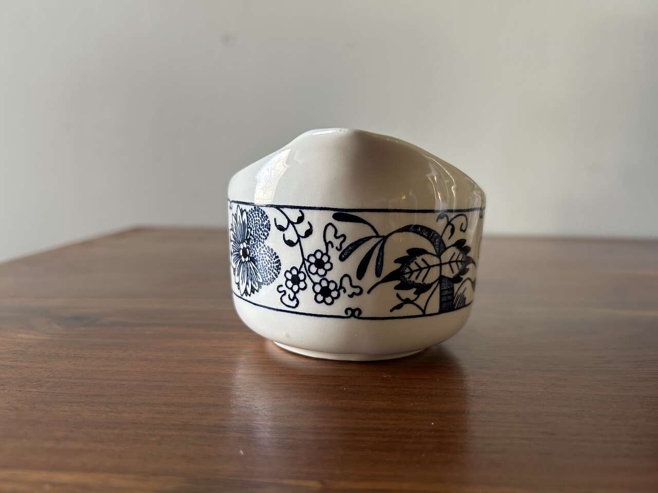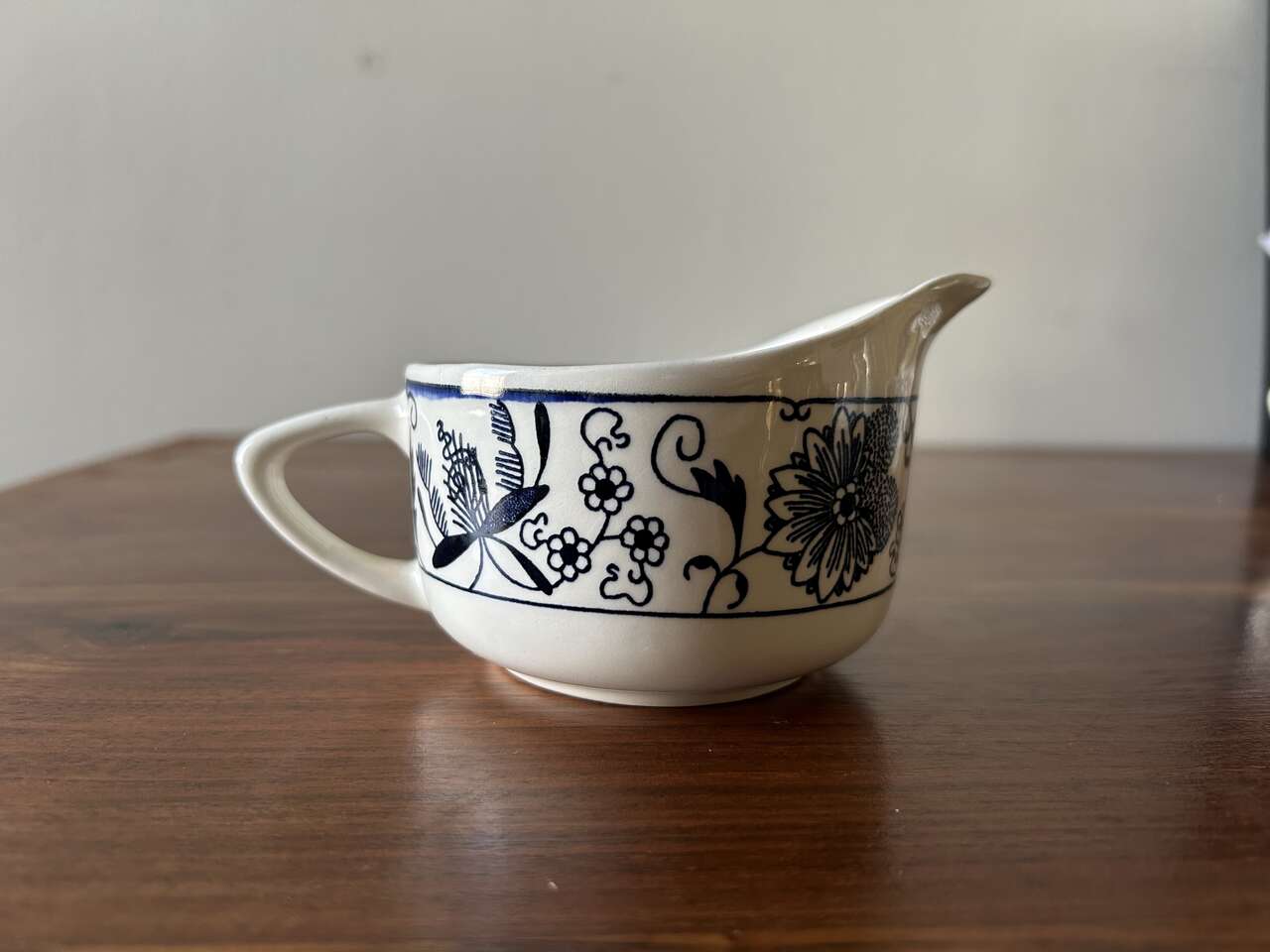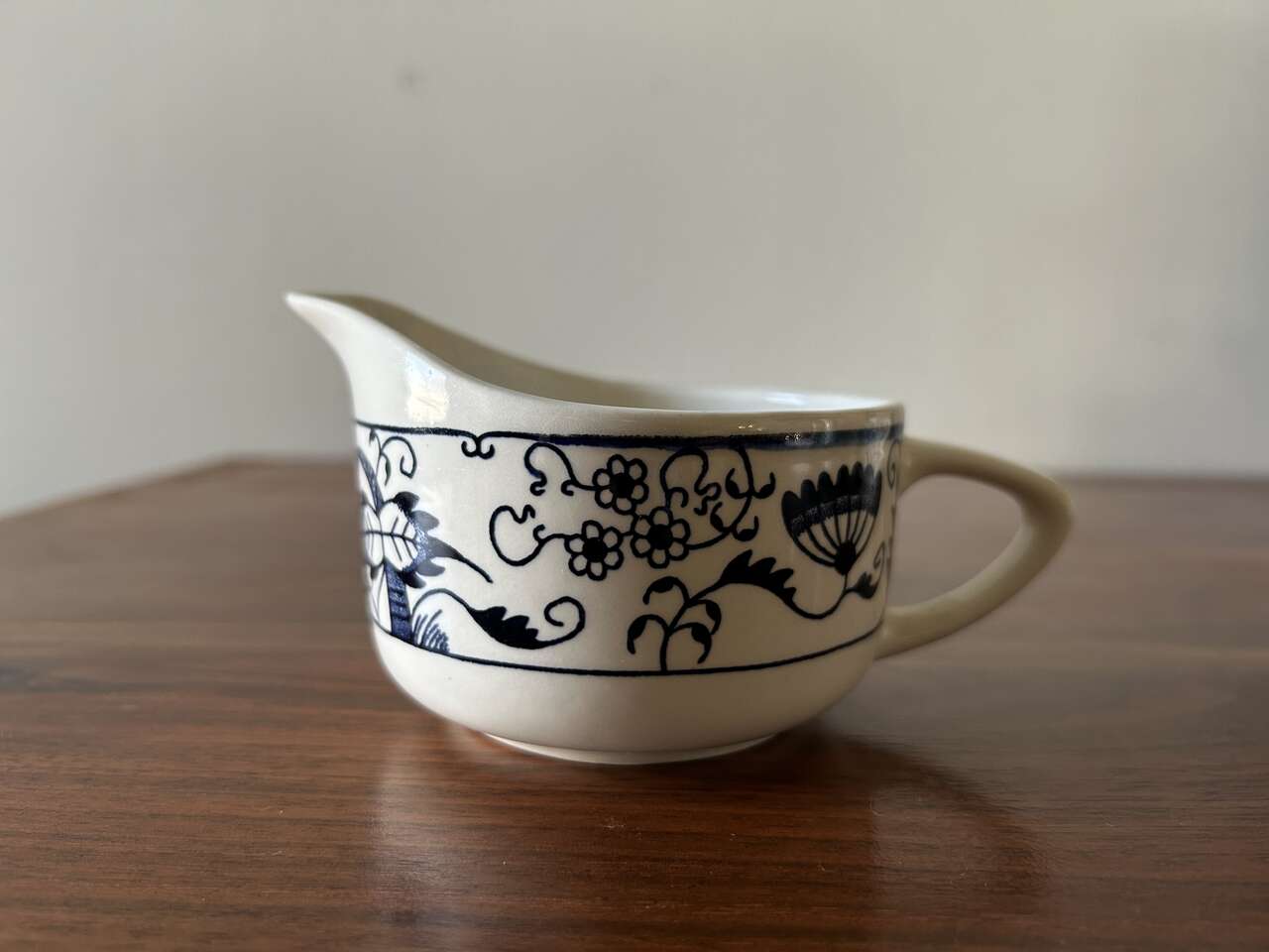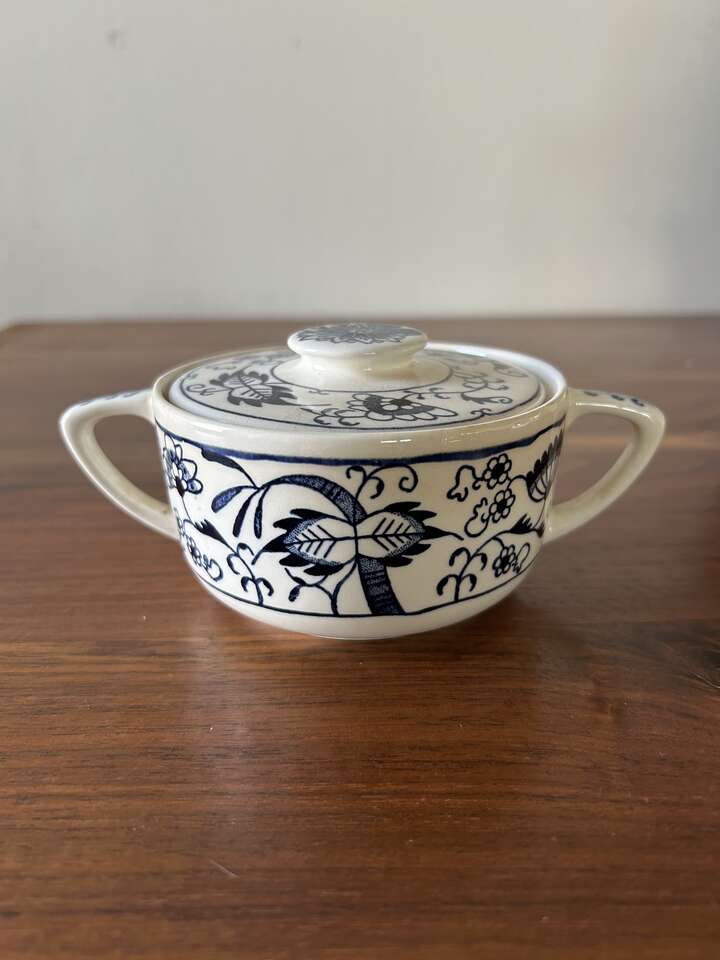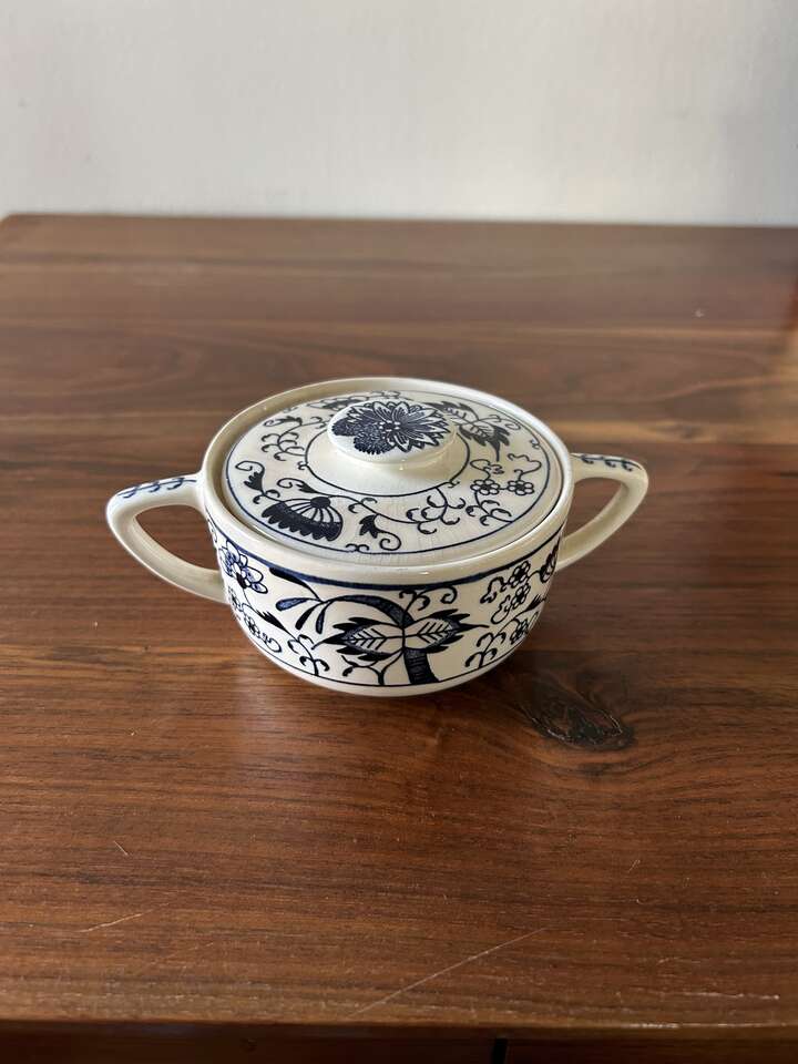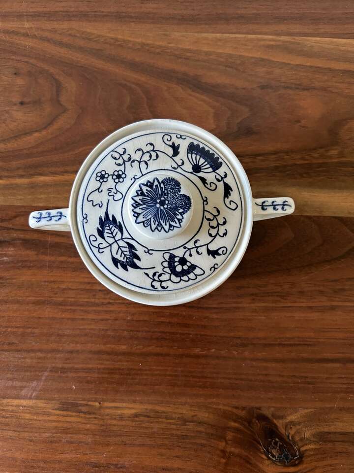 VenmoI bought this Vintage Royal Doorn Blue Onion Ironstone Creamer & Lidded Sugar Bowl set from a flea market in Ohio. Loved the style and design but I never ended up using them. There aren’t any scratches but you can see in the pictures that the glaze has cracks. This doesn’t affect the functionality of the pieces. Both pieces have been discontinued. Use this as an everyday essential or keep precious on your shelf for display. It has a very solid feel and design. Ready for your Doorn collection. Sugar bowl: 4 1/8” W x 2 ½” H Creamer: 3 ½”W x 2 1/8” H