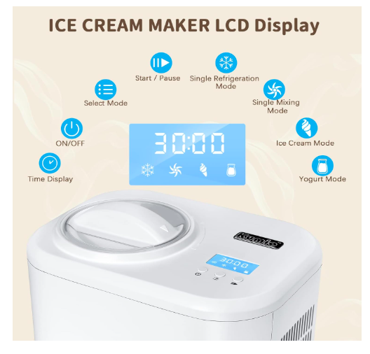 Self-freezing & Fast Make- The ice cream maker machine built-in 100W self-cool compressor, different from old school ice cream machine that needs to pre-freezing the bowl. Allows you to make tasty ice cream, yogurt, sorbet,Gelato,and dessert within a short time ever you want. 4 Modes & Keep Cool Function- KUMIO Ice cream maker features 4 Modes: ice cream, yogurt, single mix, single refrigeration. To maintain a chilled state and freshness, the sorbet maker will auto-keep cool 1hrs without other operation. Easy to Operate- A simple button control panel with LCD Display and Timer is user-friendly. Just add ingredients to the bowl, lid-lock, press ON and choose the mode, the frozen yogurt machine will show the time and does the rest! A beep sounds to indicate completed. Detachable & Compact- Easily clean up the dessert maker with the removable bowl, paddles, cover, and plastic housing. The Gelato maker is applicable to multiple places with a size of 13.9'' x 10.2'' x 8.9'', also easy to store and fits any countertop. 1.2-Qt Homemade & Healthy- Enjoy the fun of DIY your favorite frozen treats at home, 1.2-Qt capacity serving about 5~6 cups yogurt or 9~10 gelato balls or 6~7 ice cream waffles, etc. at one time. Take pure and healthy ingredients to realize ice cream and yogurt freedom, instead of purchased one.