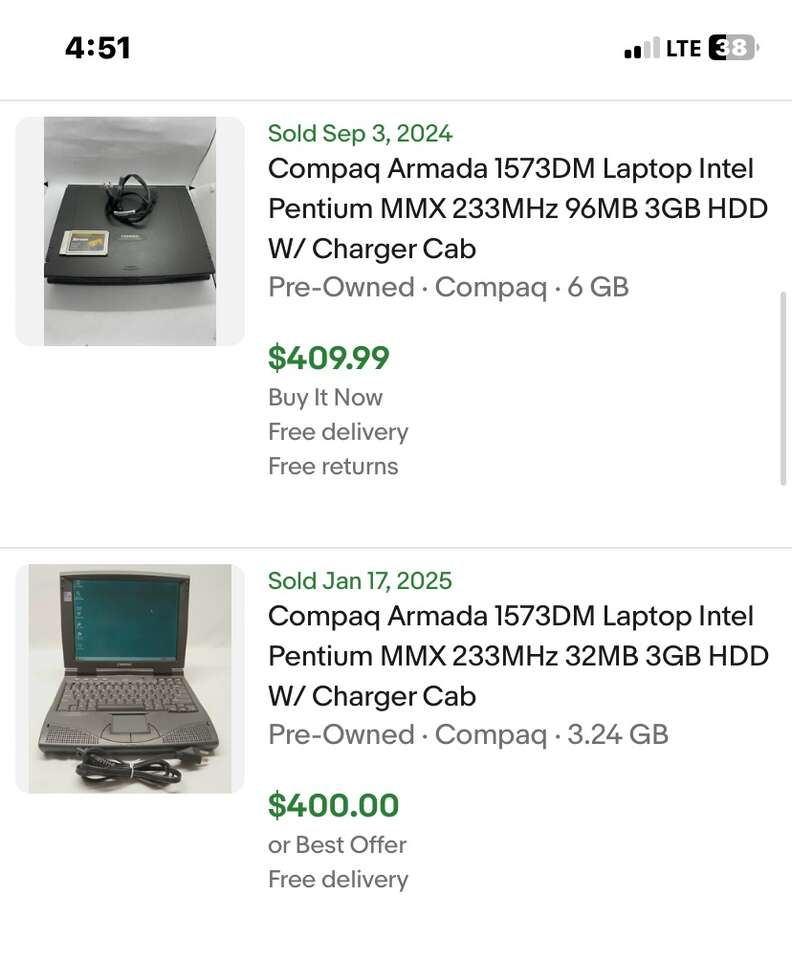 Only Cash and local pickup. Compaq Windows 95 CD-ROM Laptop with a Battery that holds a two to three hour charge. 266MHz Intel Pentium 1 with MMX. 32MB RAM (upgradable to 160MB), 4GB Hard Drive (upgradable to 128GB), 20X CD-ROM Drive (could be upgraded to DVD), Floppy Drive, 13.3 inch 1024x768 Color LCD. Good keyboard with far key travel pitch. Touchpad finger pad mouse. Laptop in nice shape. Works good for Classic games & using Floppy discs.
