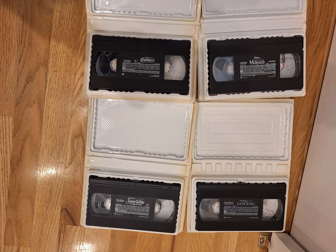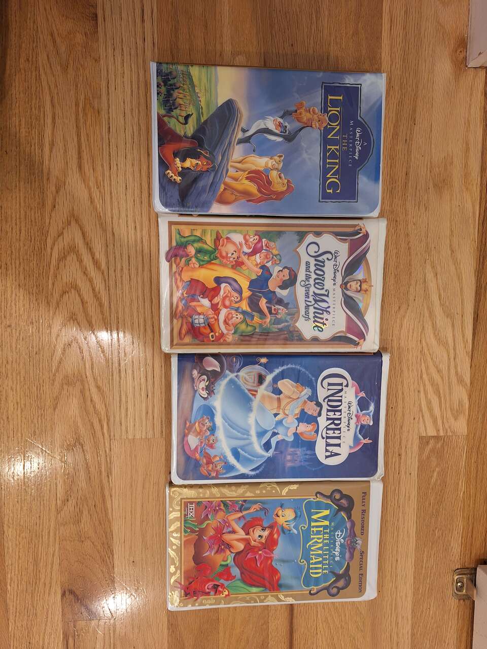 VenmoFor sale is a lot of 4 Disney VHS tapes. Includes: Lion King Snow White Cinderella The Little Mermaid Excellent condition. Rarely watched. (Cases may show wear from storage.) Smoke free pet free home.