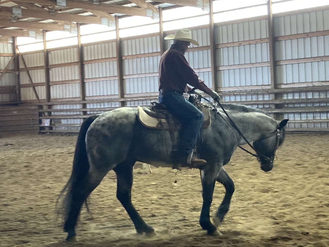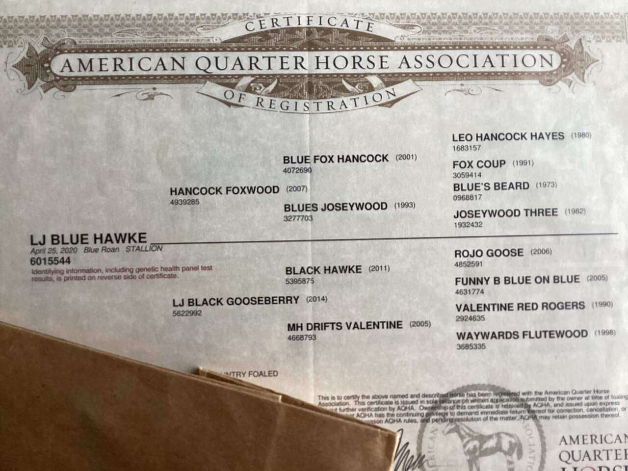 Venmo2026 BREEDING SEASON book is now open. AQHA Blue Valentine-Driftwood Blue Roan Stud If you are looking to add some size, bone and a calm disposition to your program without loosing performance check out… LJ Blue Hawke Double Registered AQHA, NFQHA 94% Homozygous Black and Roan (color test EE,aa,RnRn) Guaranteed 100% Roan Producer 8 Panel Negative Live Foal Guarantee $700.00 Live Cover/Hand Breed 15.3 hands, 1250 lbs $8.00/day mare care Performance Ranch and Versatile Breeding that will hold up Wyatt has a wonderful disposition, smart and very willing to learn, good withers, beautiful hip, good bone without becoming heavy footed. Proven Performance Roping horses in his pedigree, his grandsire “Blue Fox Hancock”has 722+ AQHA Points in 6 events and Reserve AQHA All-Around Champion on top. Bottom/top side “RoJo Goose” known as a “Great Head Horse” and on the bottom/bottom side grandsire is Black Hawke a half brother to Funny B Blue Muchaman an “Exceptional Ranch Horse” in Commerce, Texas. Blue Valentine line bred with numerous sons of Blue Valentine (Gooseberry x 6, Blues Beard x 2, Leo Hancock Hayes x 2, Rowdy Blue Man x 1). He also carries Driftwood bloodlines from Driftwood Ike x 4, Orphan Drift, and Wayward Ike. Wyatt’s foals have had his great disposition, friendly and were willing to learn, nice hips with beautiful faces, good bone and feet, correct conformation, bred to be versatile, cowy, trail, rope and ranch horses that will ride all day and stay sound. His first colt was started this fall and the owners sent glowing remarks as to the ease of starting,...at 60 days he was roping a steer as big as him and pulling that steer. https://www.allbreedpedigree.com/lj+blue+hawke.