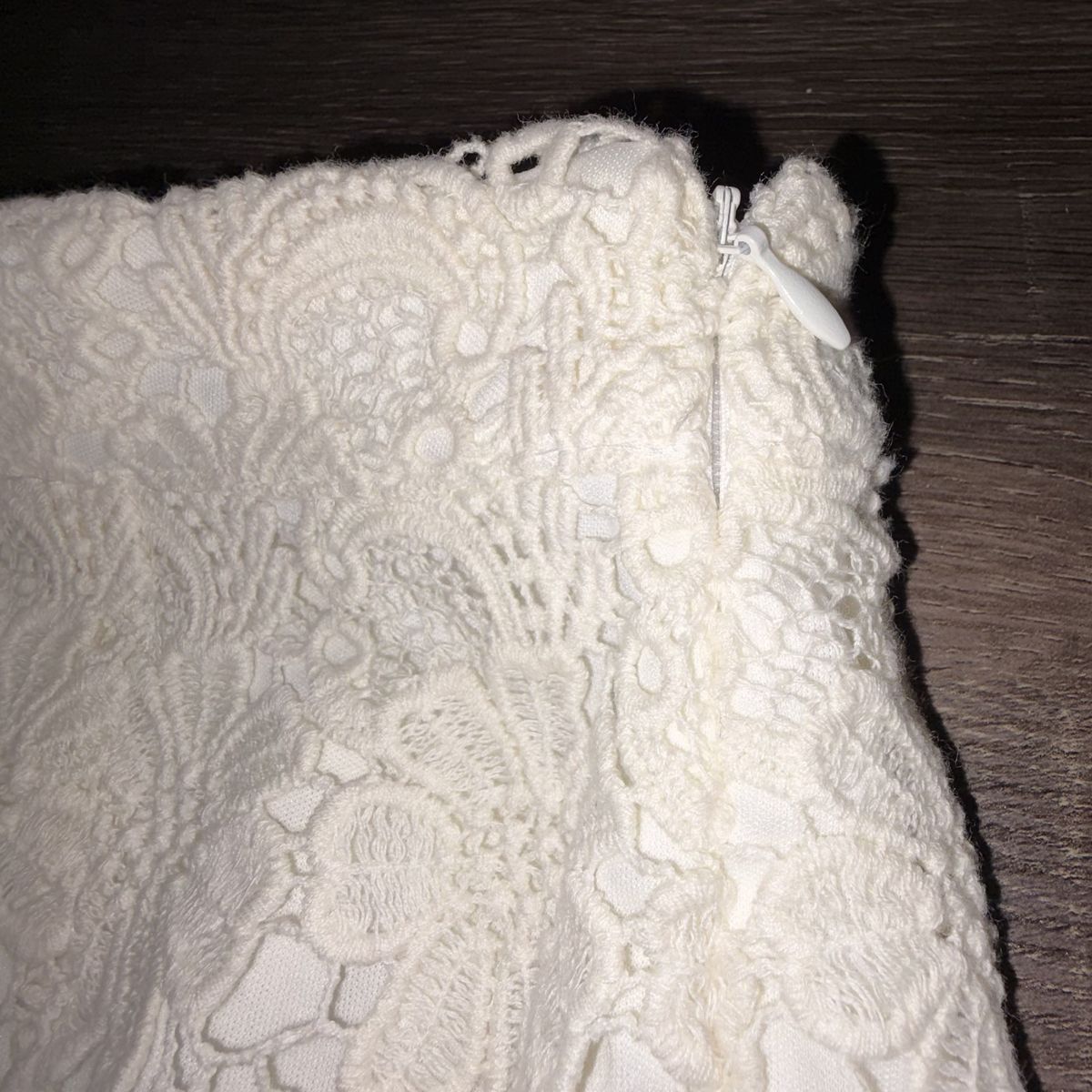 Textured lace Scalloped hem Fully lined Side zip closure