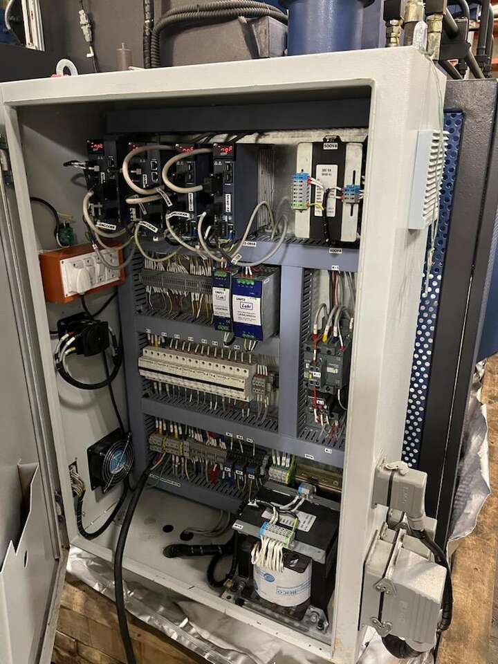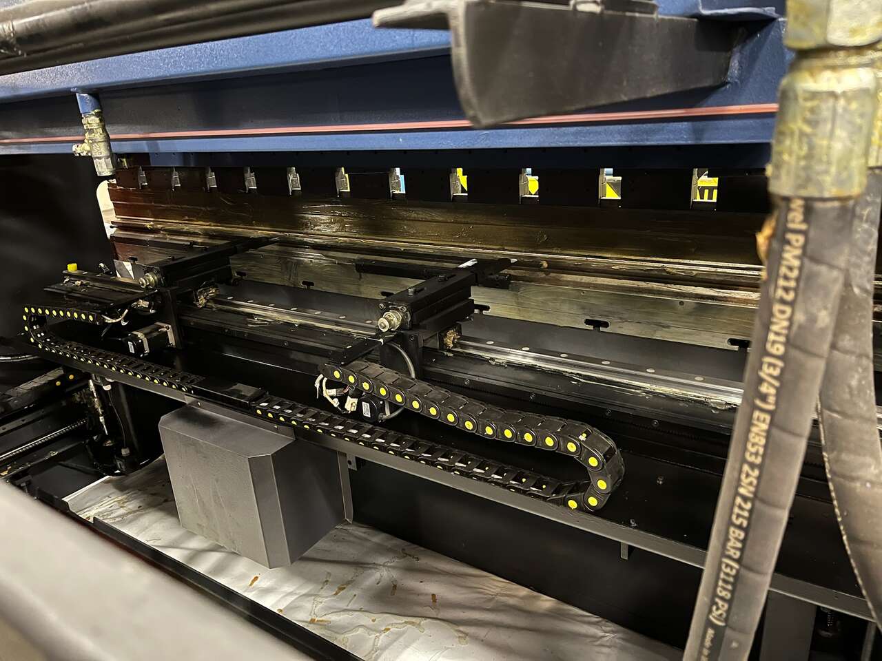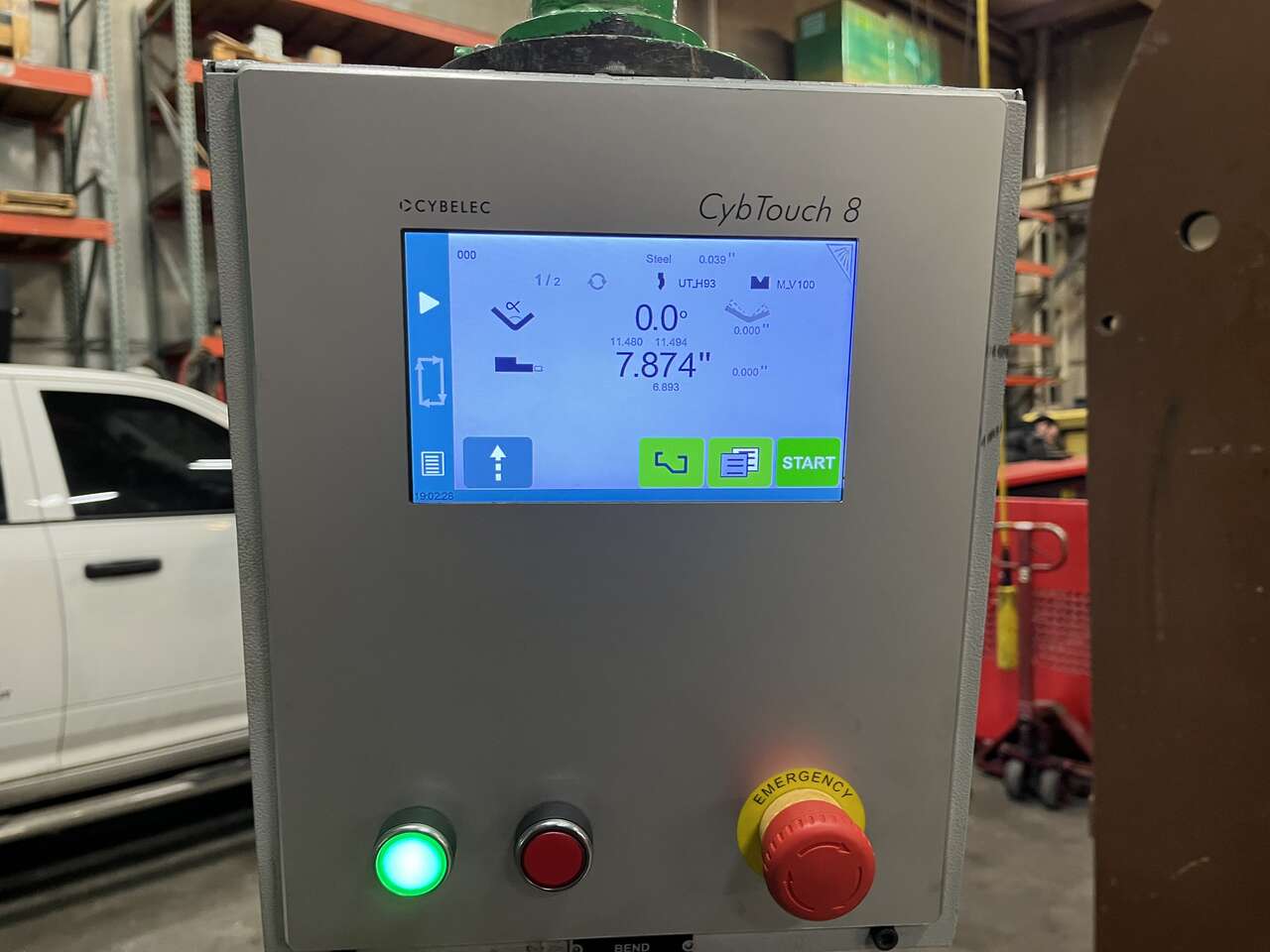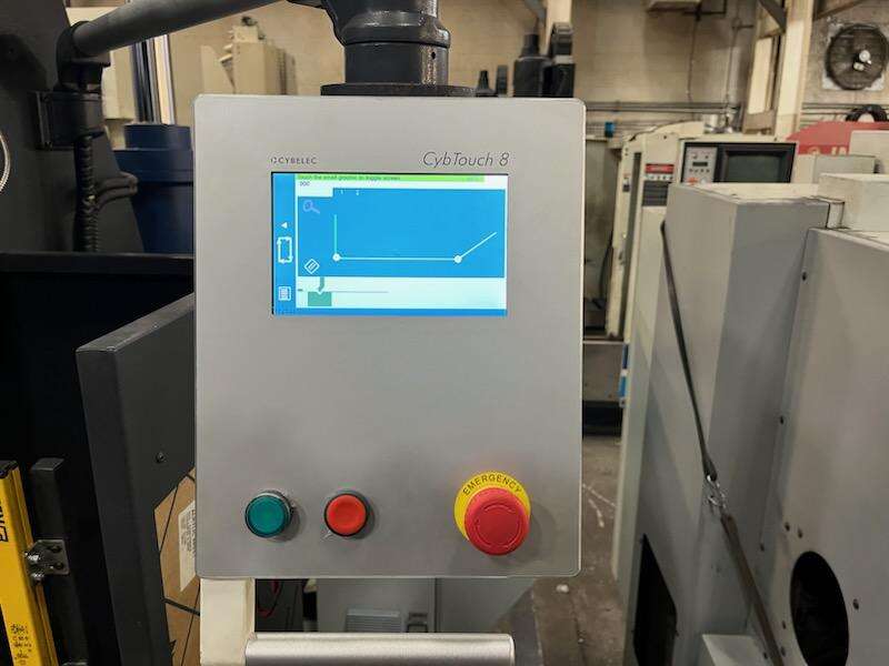 6” Open Height 13” Closed Height 7” Throat Depth 8” Approach Speed 1.1”/sec Pressing Speed .15”/sec Return Speed 1.2”/sec Motor 10HP Weight 12,500 LBS Dimensions 127”x61”x90” Y and X,R axis controlled thru CNC controller Standard Cybtouch 8PS controller Standard 7” color graphic CRT Touch screen 640 x 480 pixels with LED backlight control Standard Automatic calculation of the bend depth, back gauge position, angle correction and bend allowance Standard 50 punch/50 dies memory Standard 200 x 24 Sequence bend memory program Standard Part counter with auto stop Standard AC servo drives for X,R-axis control Standard X,R CNC back gauge assy. Included ball screw & LM guides & timer belt Standard 5-micron guided press brake scale for Y-axis position Standard Pair of lifting links Standard Centralized lubrication system with hand pump Standard Pair of sheet supports Standard Manual Crowning Standard