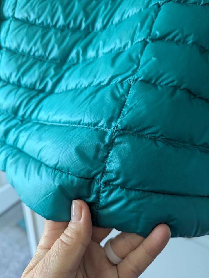 This jacket only weighs 7.8 ounces and is filled with 800-power fill down. The color is a gorgeous teal. It packs down inside its own right pocket for easy travel!