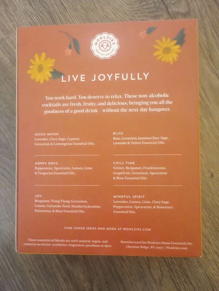 VenmoUsed ~ Woolzies Live Joyfully Essential Oils Blends~ includes 6~ 10 ml essential oil blends: •Good Mood •Happy Days •Joy •Bliss •Chill Time •Mindful Spirit I've included a pic of what the blends contain. Just not enjoying these scents as much as I had hoped. Some have been used but are still mostly full. Showed a pic of the one that has been used the most. (Still over 3/4 full) Except Mindful Spirit-the lid got damaged and it leaked and is mostly gone.] The rest are pretty much full. $8 cash or Venmo. Will hold with Venmo. Text if interested. Feel free to check out my other ads~lots for sale.