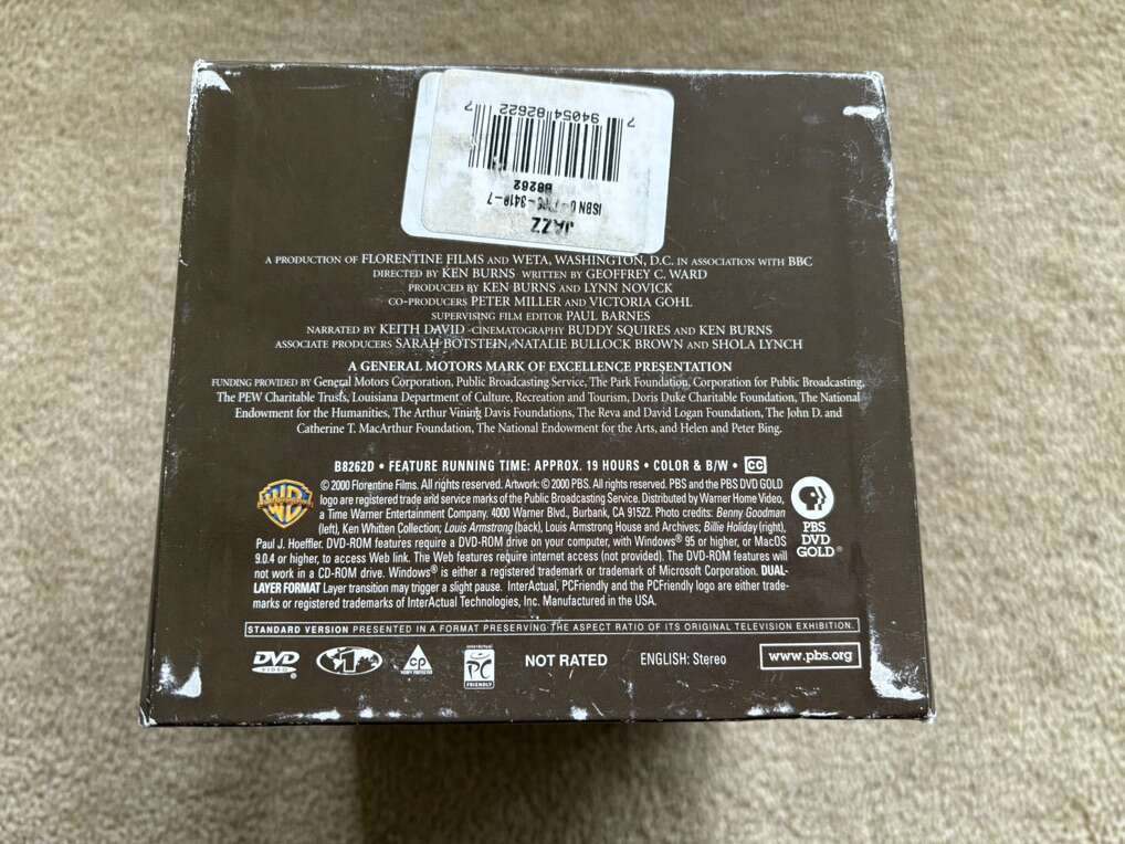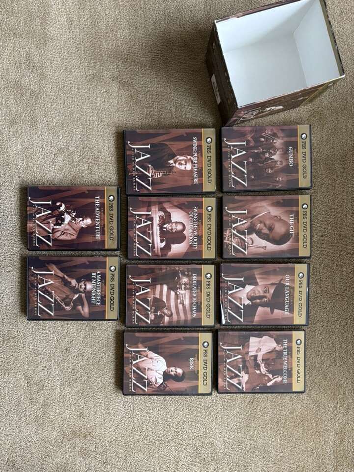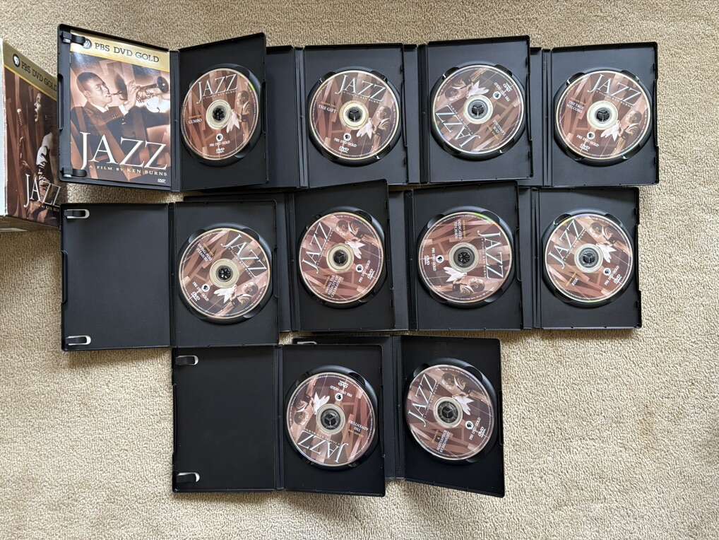 Jazz: A film by acclaimed filmmaker Ken Burns, celebrating the music of America. Complete 10-disc DVD set, about 19 hours, special features, in a sturdy box. Originally broadcast 2000. Very good condition. All discs play well. Some wear in corners of slip cover. Text only. Cash or Venmo.