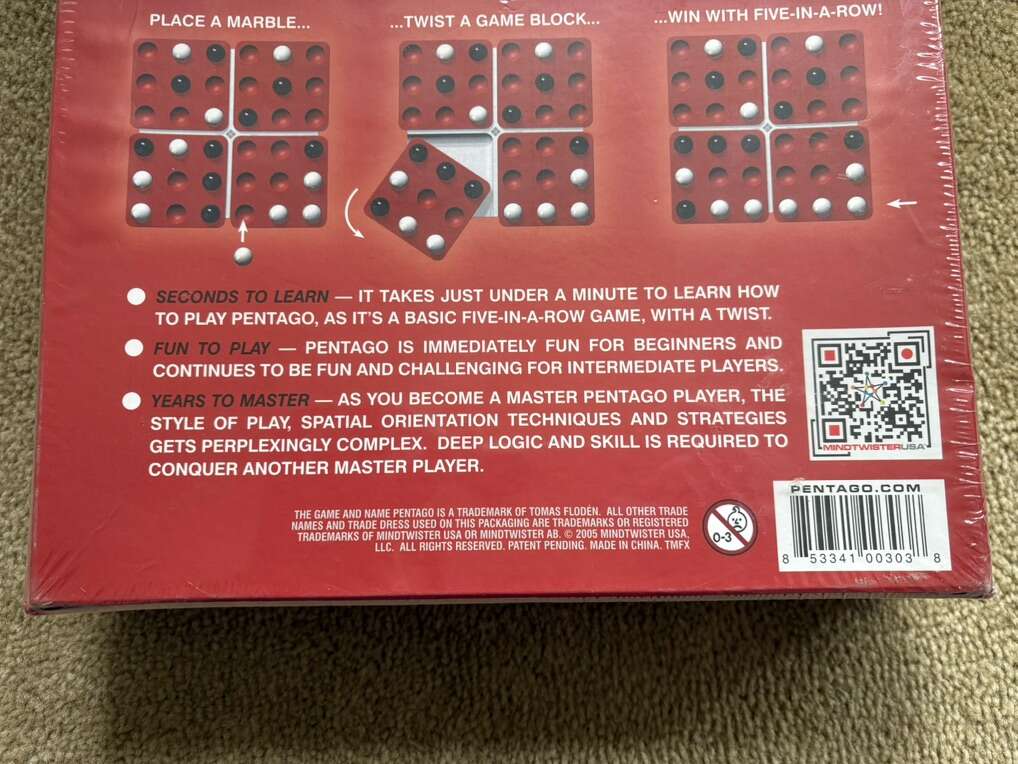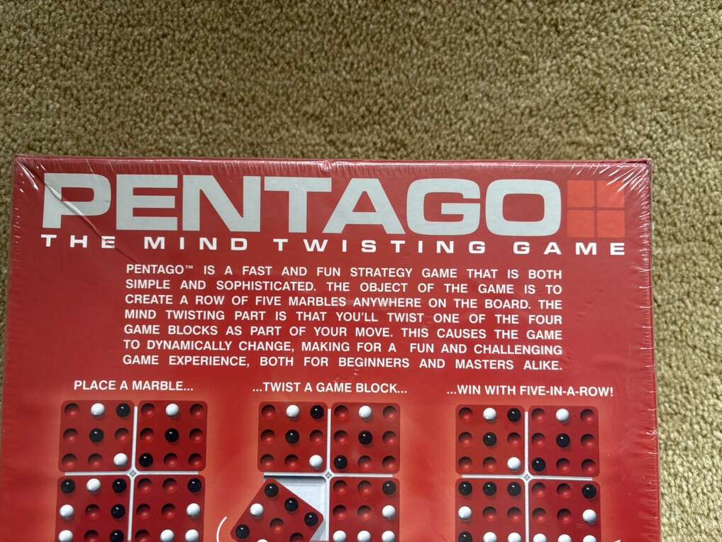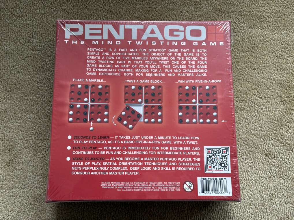 NEW (sealed in plastic) Pentago: The Mind Twisting Game. Seconds to learn, years to master. Award-winning game by Mindtwister, 2005. 2 players, age 6+. New, unopened condition. Text only. Cash or Venmo.