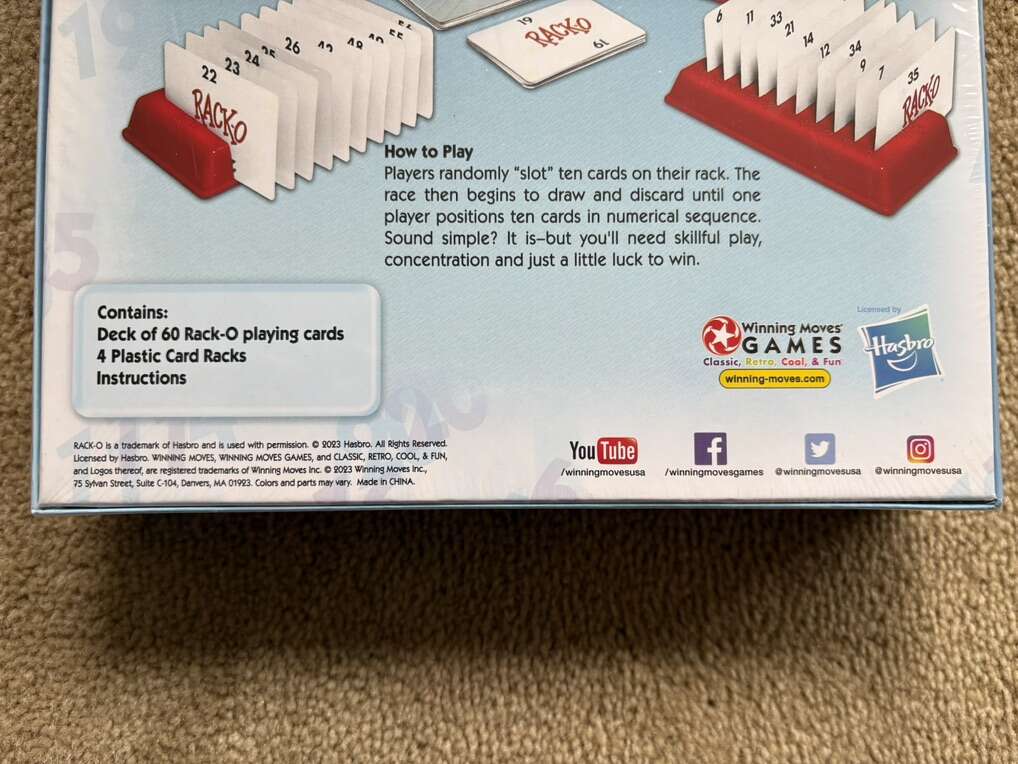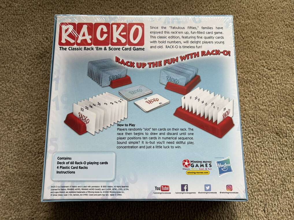 NEW (sealed in plastic) Rack-O: The classic rack ‘em & score card game. Great family fun for over fifty years! Winning Moves Games, Hasbro, 2023. New, unopened condition. Text only. Cash or Venmo.