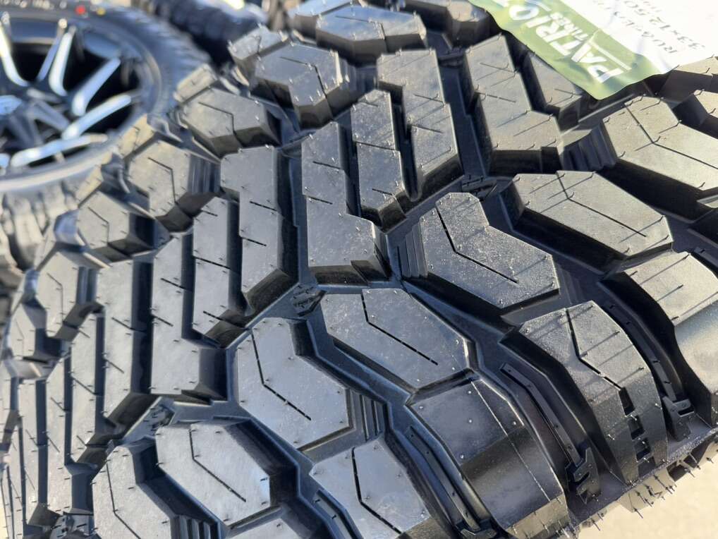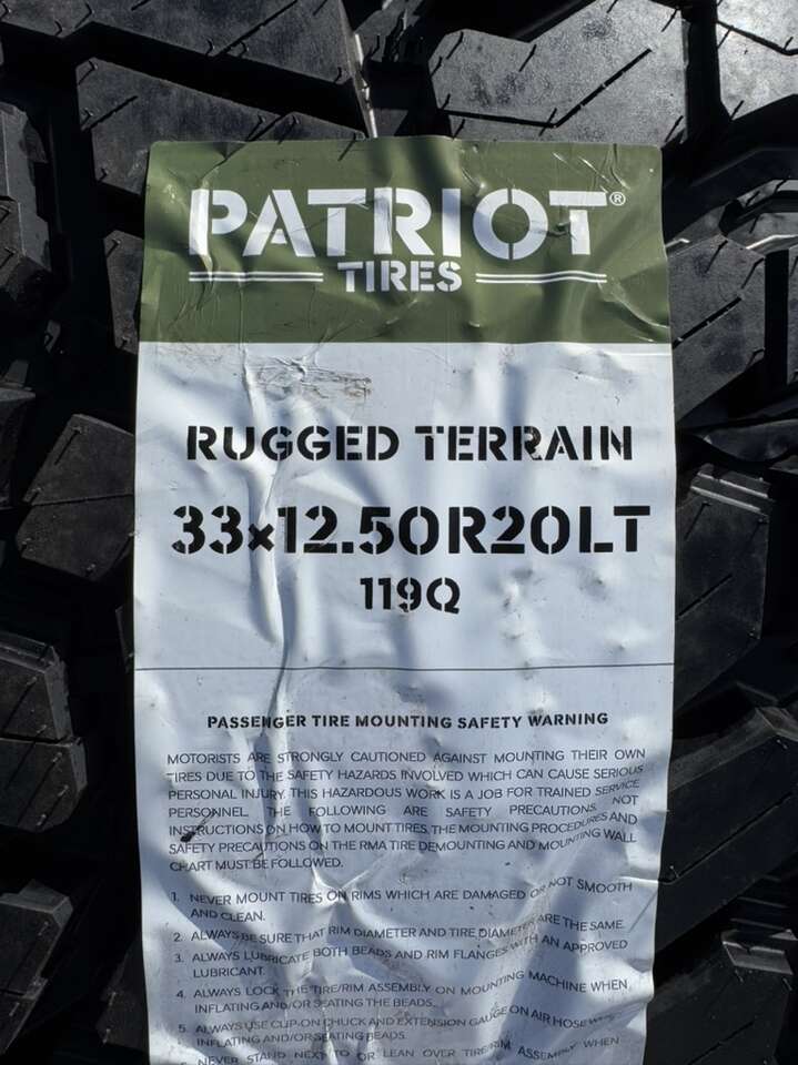 Brand new wheels and tires. Stickers still on everything, never mounted to a truck. Tires are Patriot R/T 33x12.50x20 12 ply Load Range F 119 load rating.