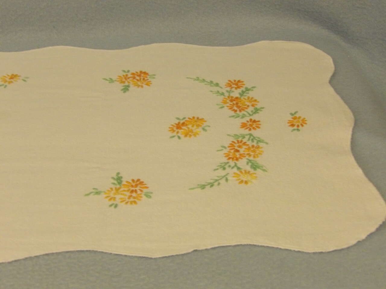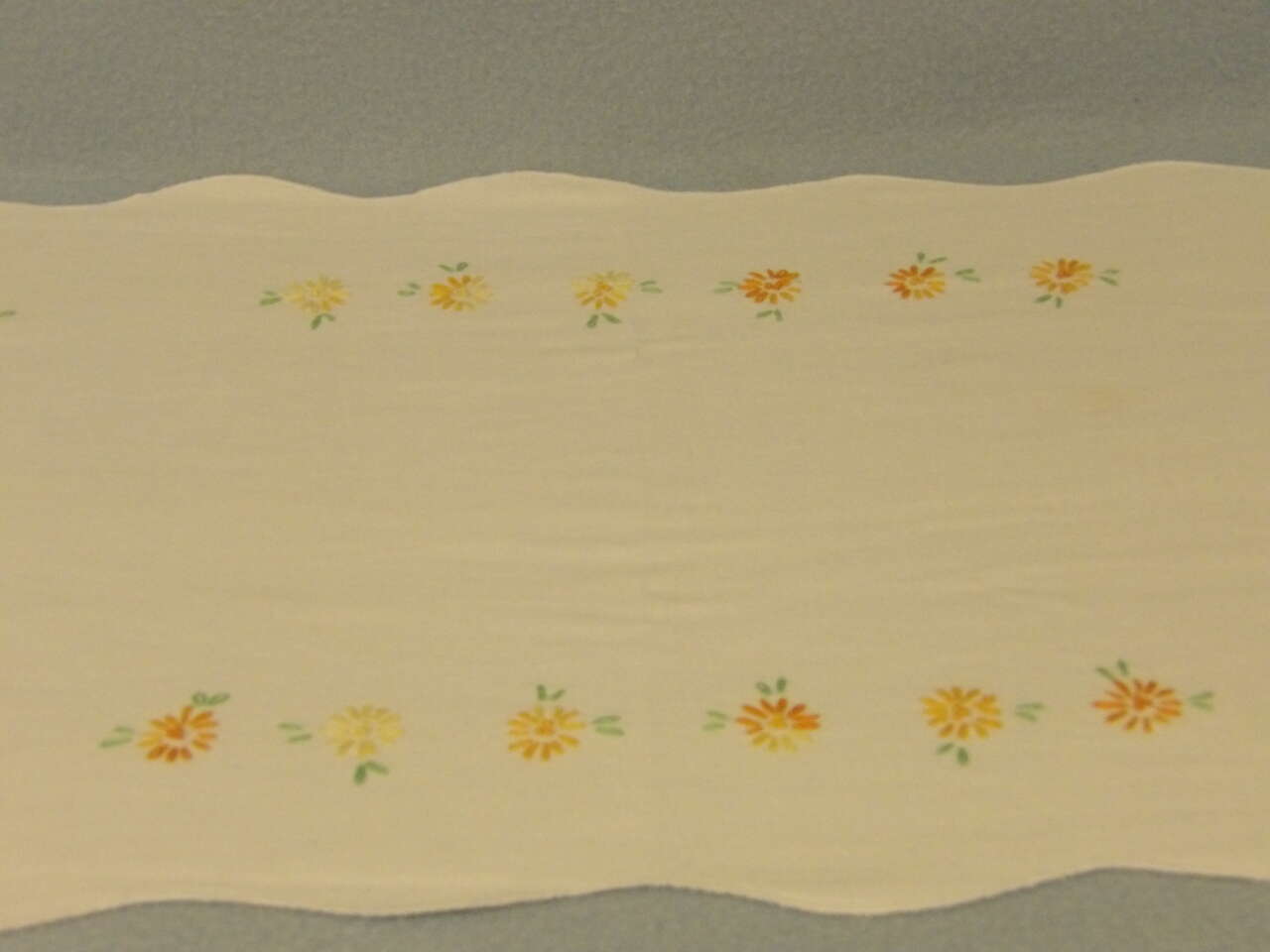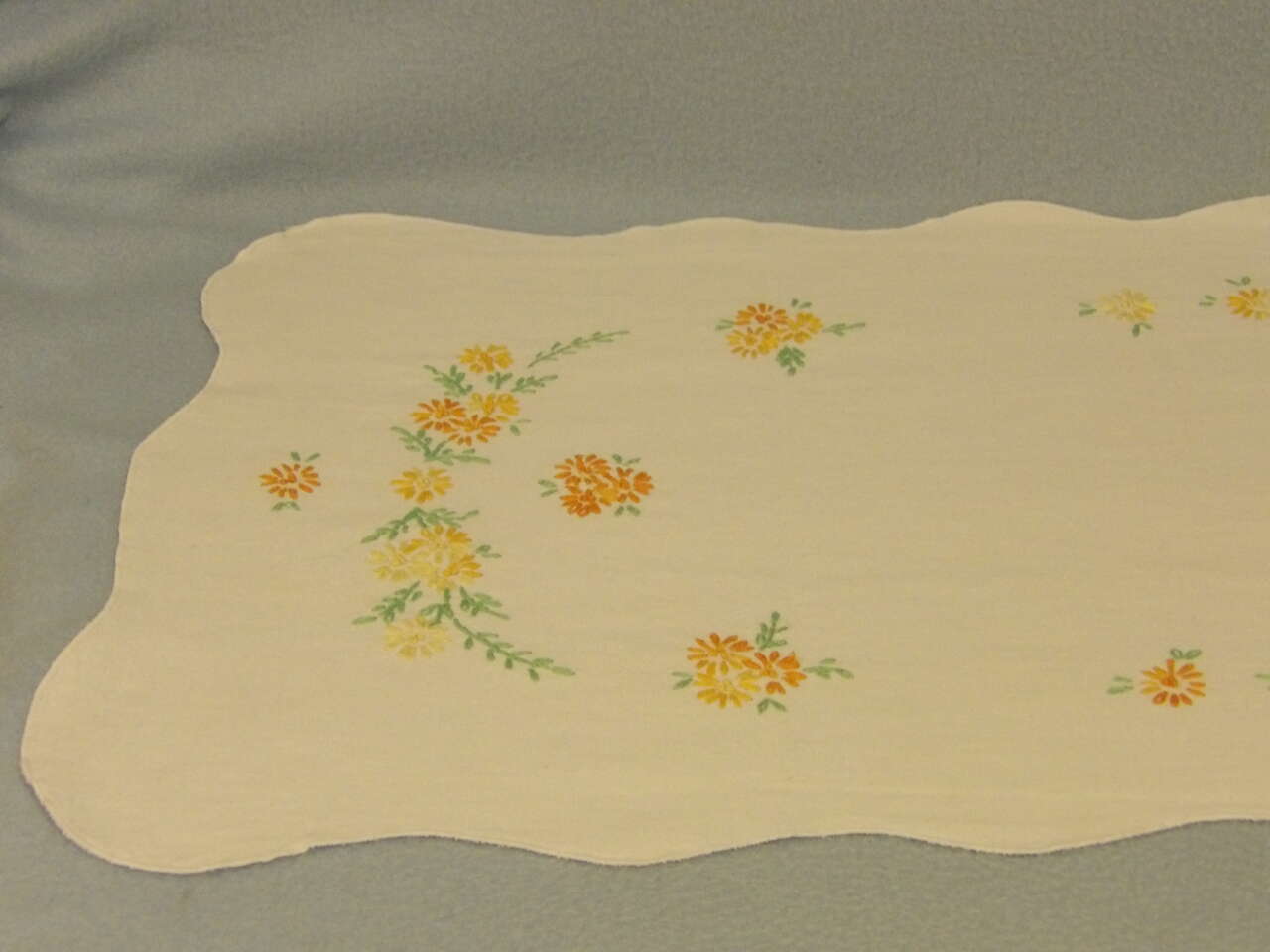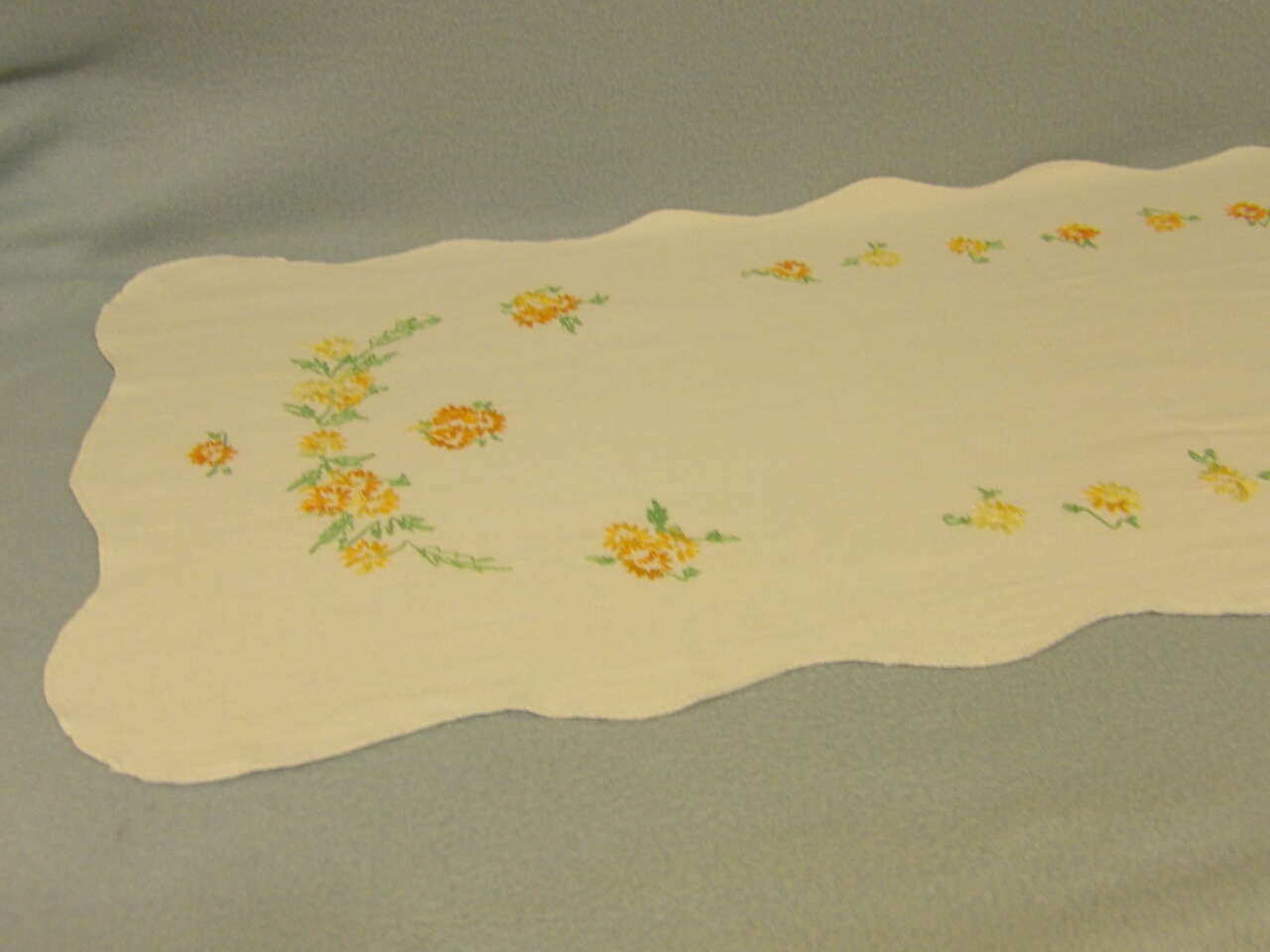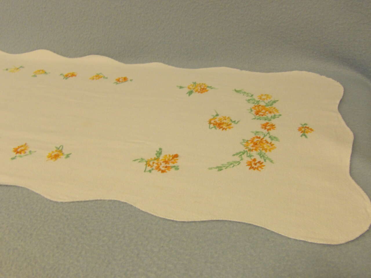 This lovely dresser scarf will brighten any dresser or furniture piece it's placed on. Hand embroidered with lovely oranges, yellows, and greens.
