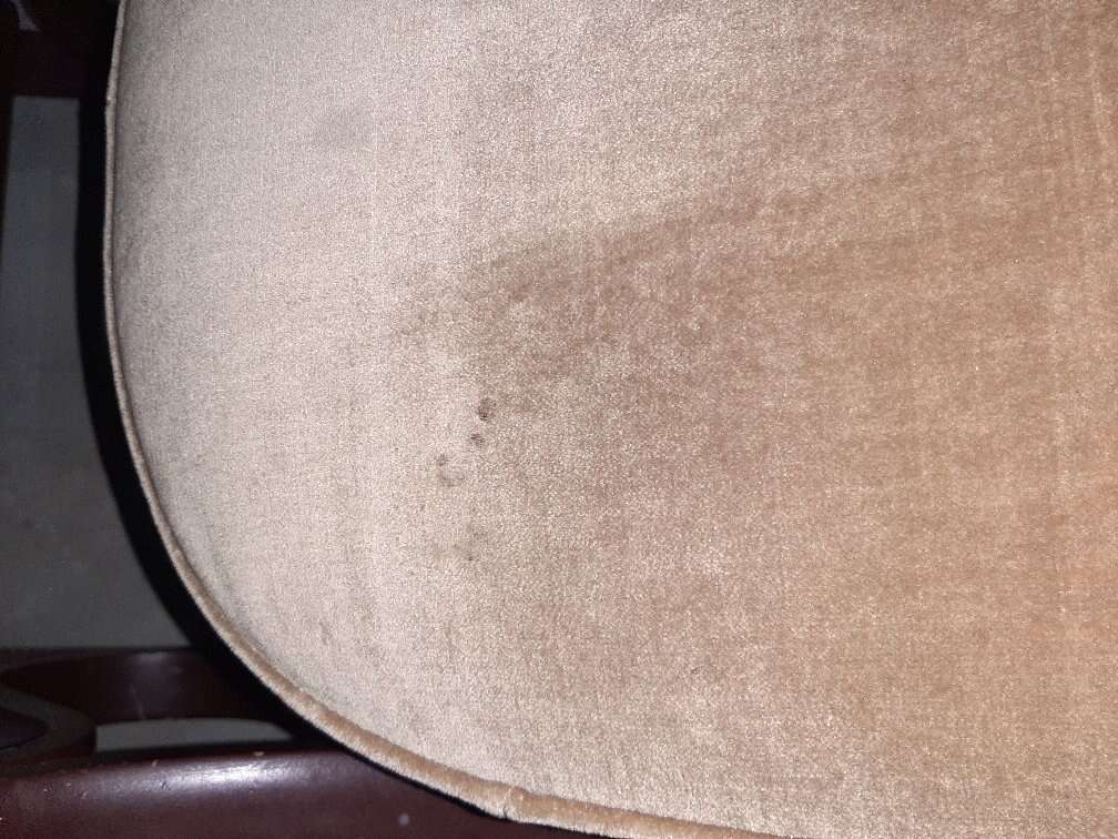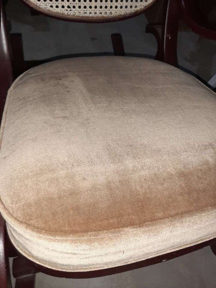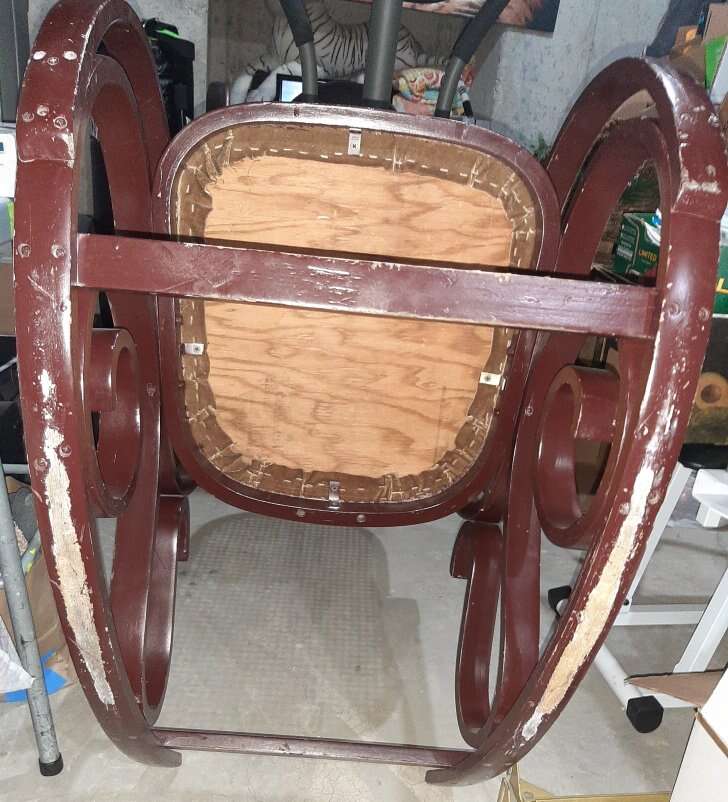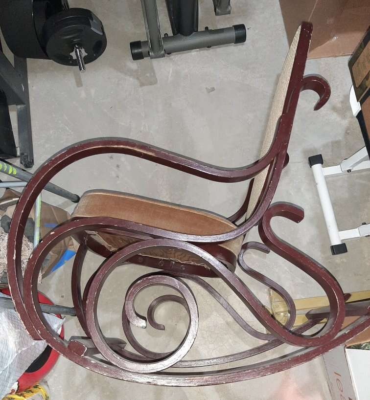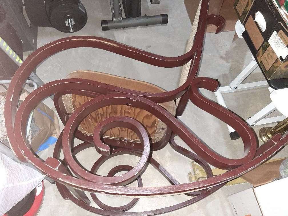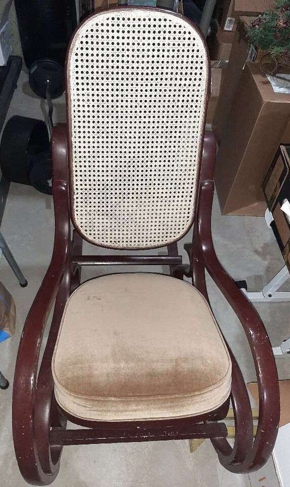 Beautiful large brown bent wood rocking chair with cream cane back and padded seat. Has some scratches, would be amazing repainted. Small stain on seat. Smoke free.