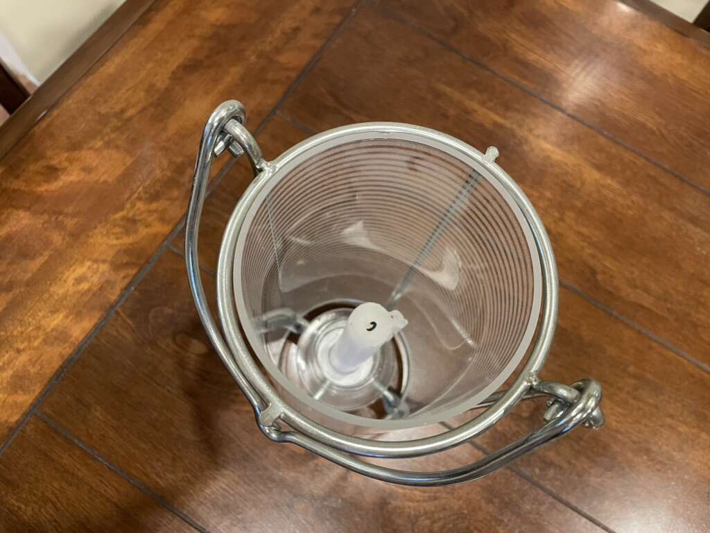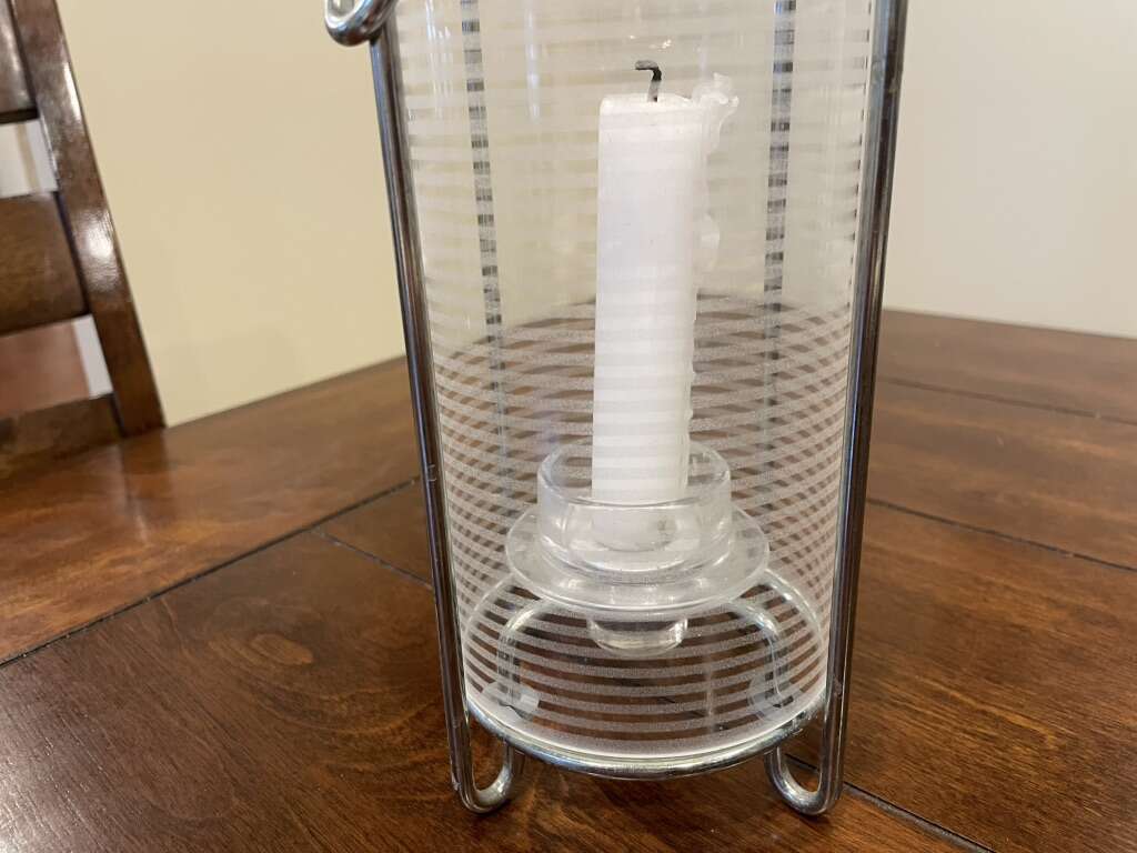 I have a glass hurricane candle holder for a taper candle. It is clear glass with frosted stripes. It has a silver metal handle and feet. It is 11 inches tall and 6 inches wide (at the widest part that includes the metal holder and handle). See my other ads for jewelry, artwork, home decor and more.