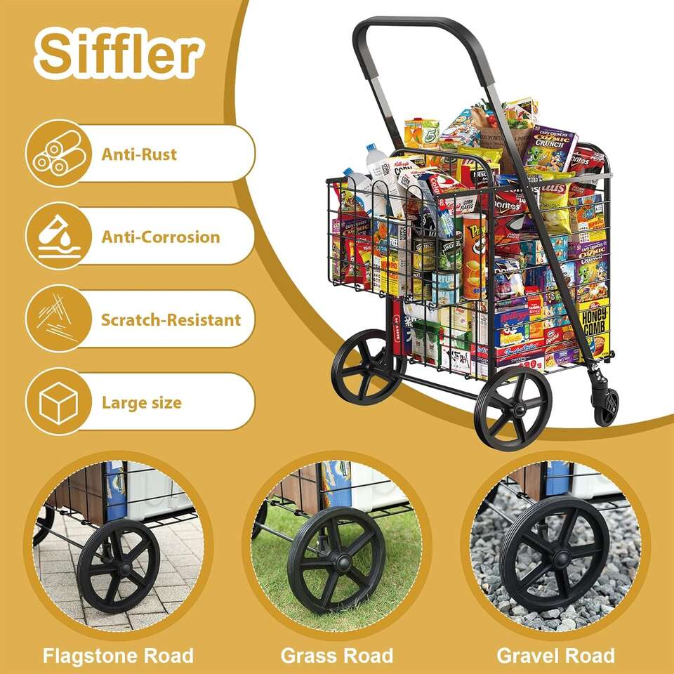360°Swivel front wheels&Oversized back wheels For optimal maneuverability, make you roll this go-to shopping cart more easily during turning around or changing direction on the bumpy sidewalk. The Oversized Back wheels enable you to Climb the stairs without any problems.