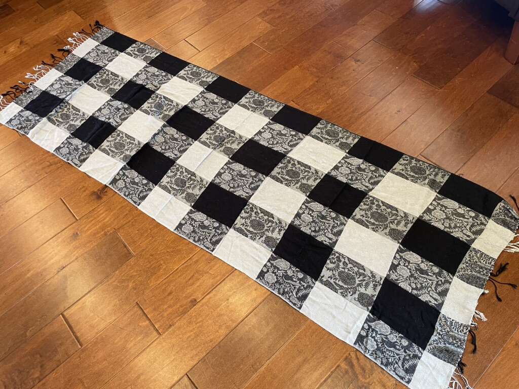 I have a gray and black Pashmina checked scarf with floral patterns. There is fringe at both ends. It is 74 inches long (without the fringes) and 25 inches wide. See my other ads for jewelry, artwork, home decor and more.
