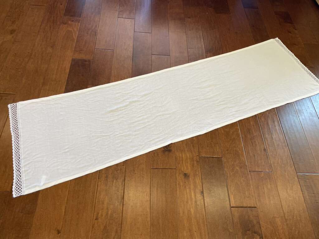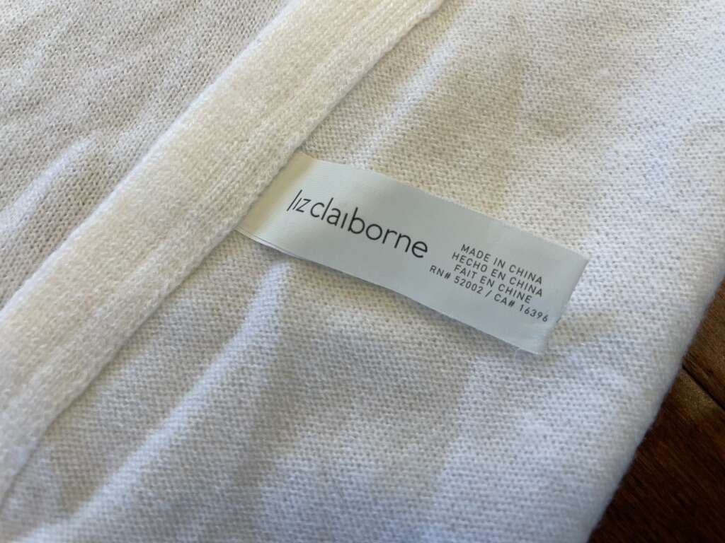 I have a long off white scarf by Liz Claiborne. It has beautiful ends that look crocheted. It is 76 inches long and 21 inches wide. It is really soft. The tag says 100% acrylic and dry clean only. See my other ads for jewelry, artwork, home decor and more.